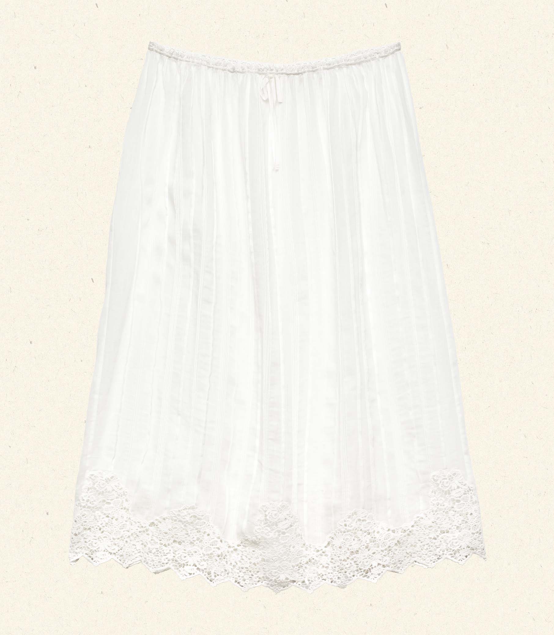 In a lightweight ramie, the Albina Skirt features a high elastic waist with a fixed tie, allover clustered pintucks, and a midi hemline adorned with intricate Victorian-inspired floral lace.