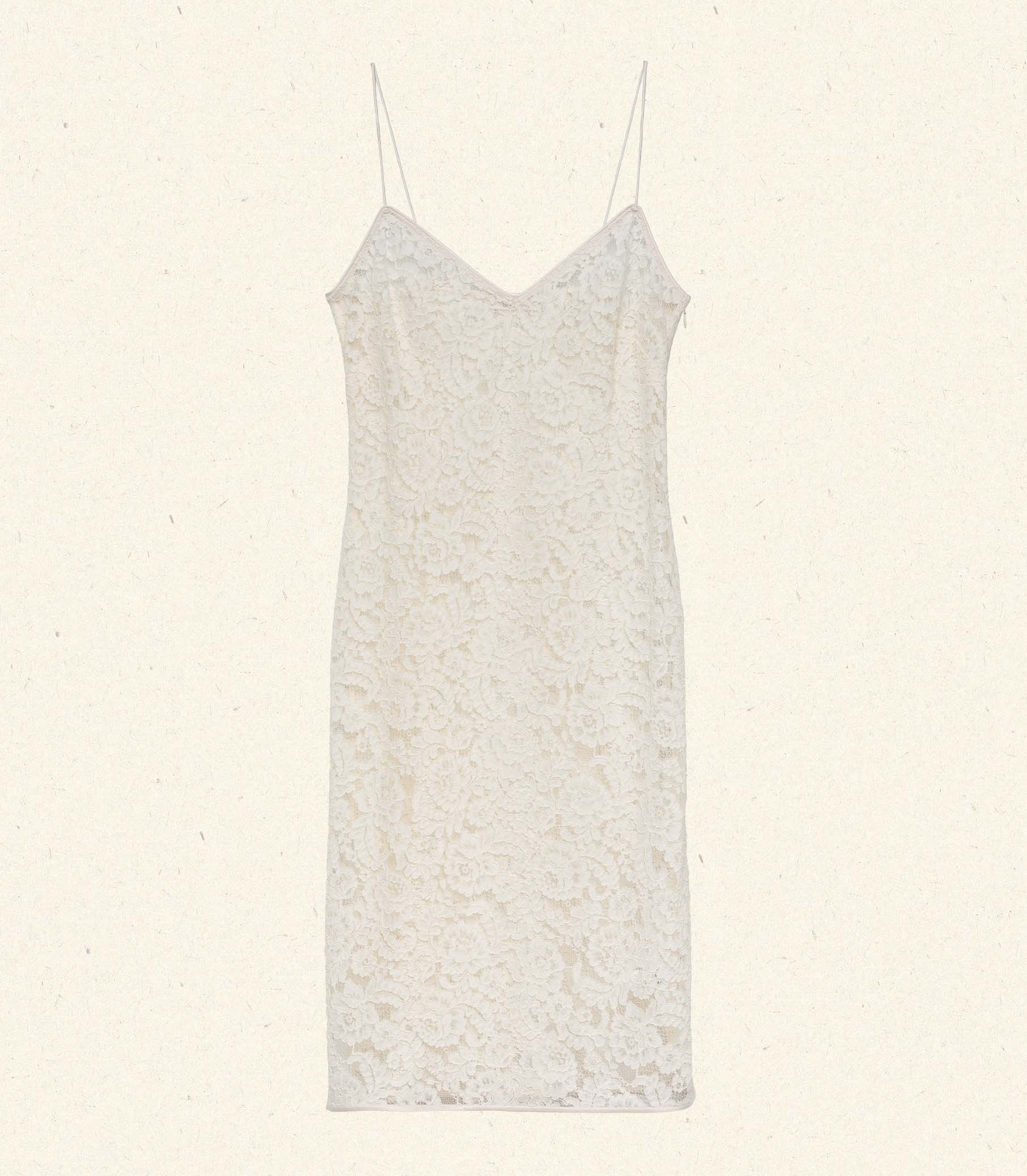 In an intricate allover lace, the Alissa Dress is a ‘90s-inspired slip dress, featuring corded satin piping at the neckline and hem and a side slit.