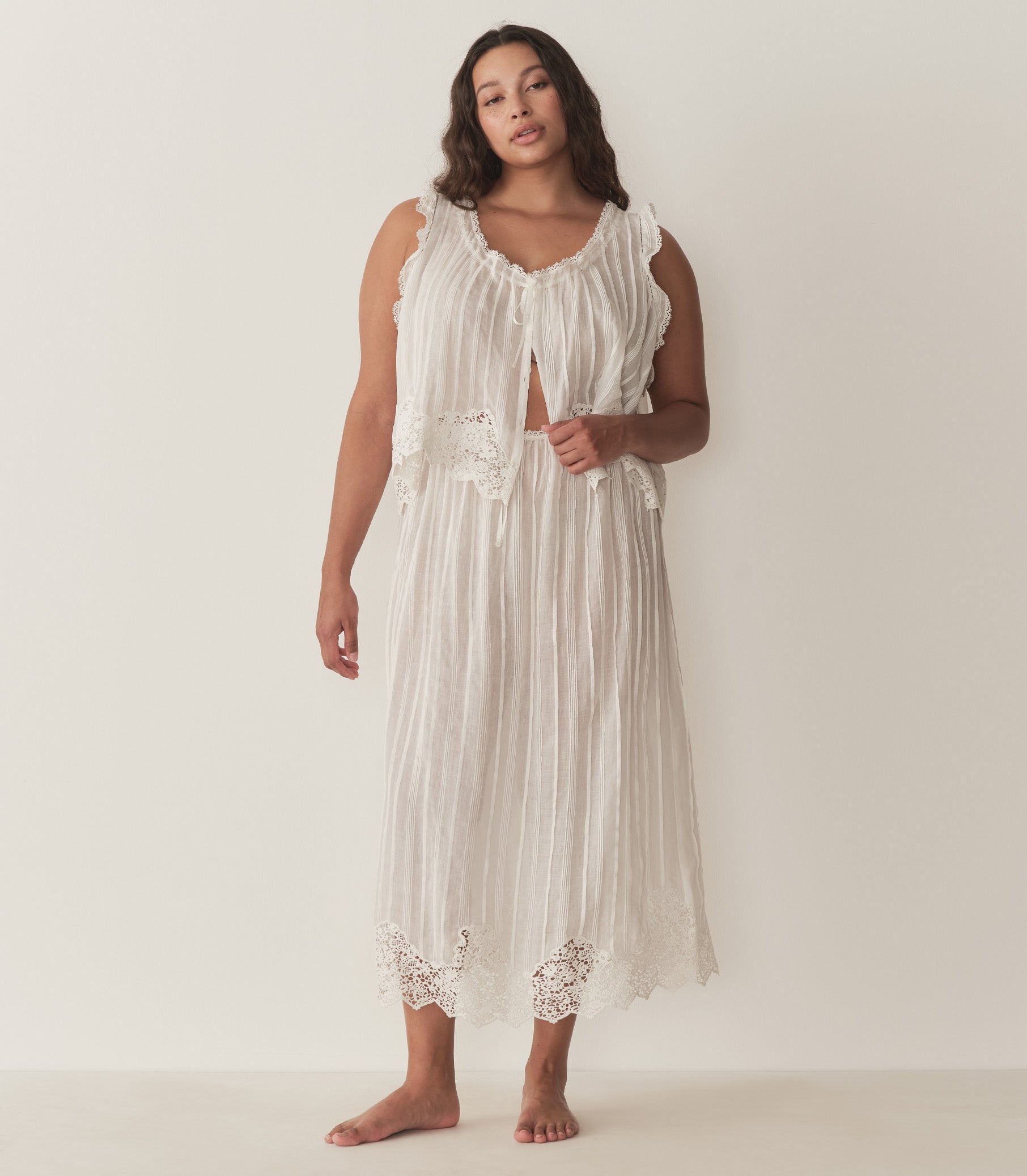 Crafted from a lightweight ramie, the Amal draws inspiration from our beloved Traveler Top, featuring a slightly cropped silhouette, mother-of-pearl buttons, and a scoop neckline with a fixed grosgrain ribbon tie. Intricate Victorian-inspired floral lace and ladder trims adorn the sleeve openings and hemline.