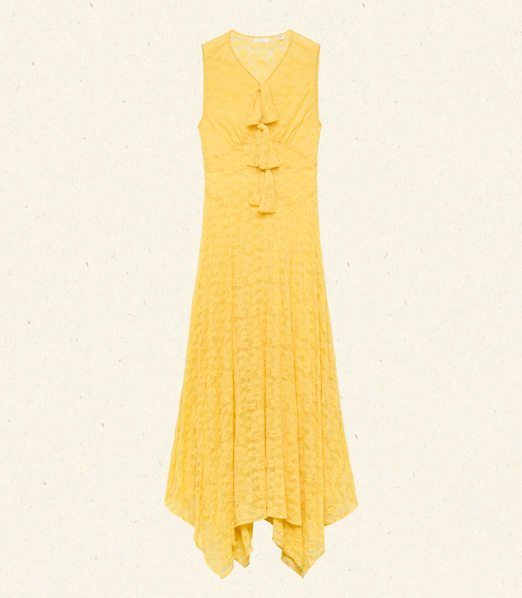 Crafted from lightweight, comfortable stretch lace, the ‘30s-inspired Angeline is an easy pull-over dress with a high V-neckline and floor-sweeping handkerchief hem. Three ties extend down the front, while angled waist seaming lends structure.