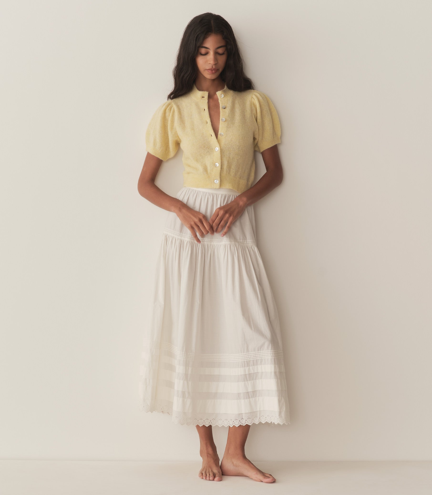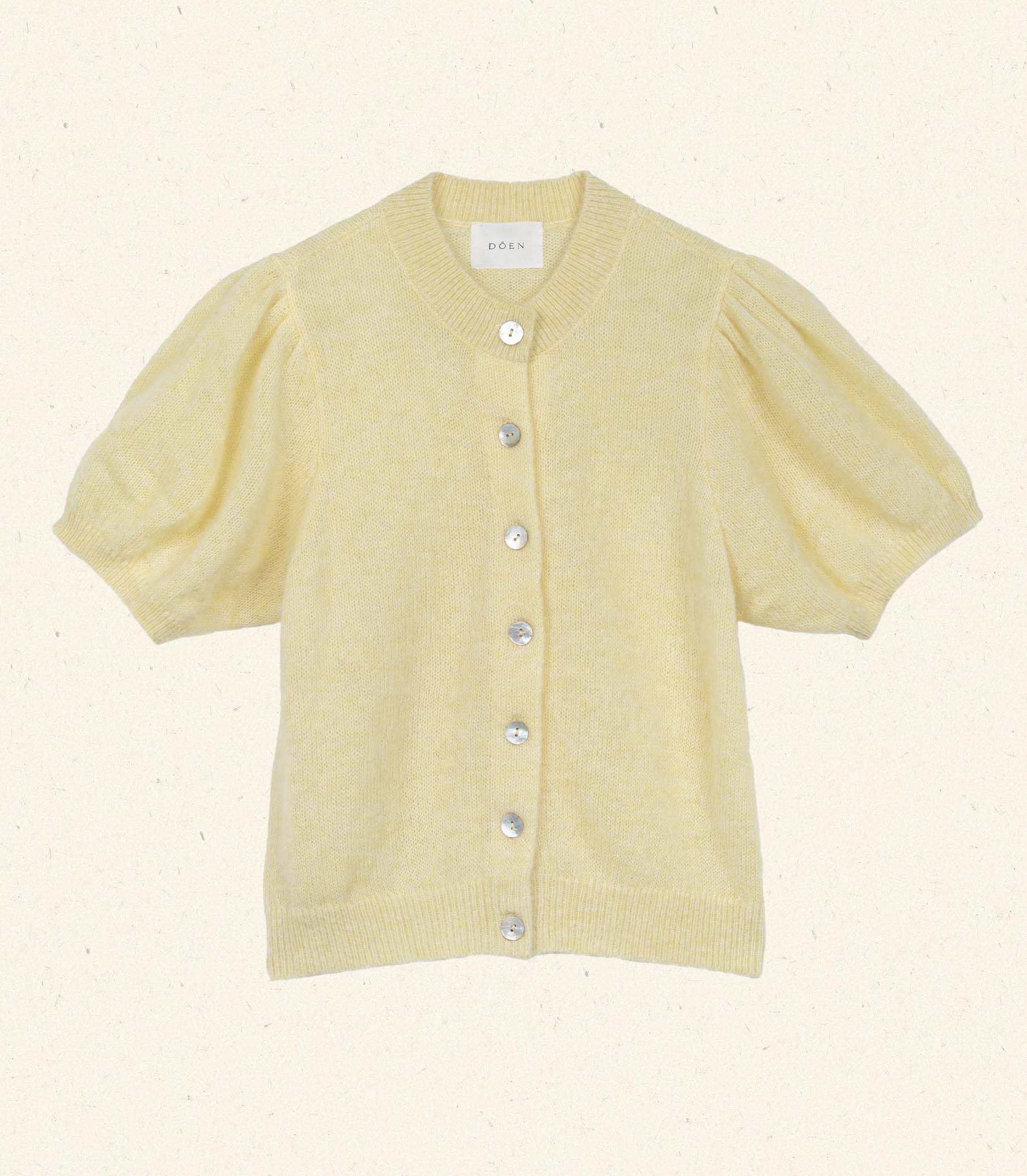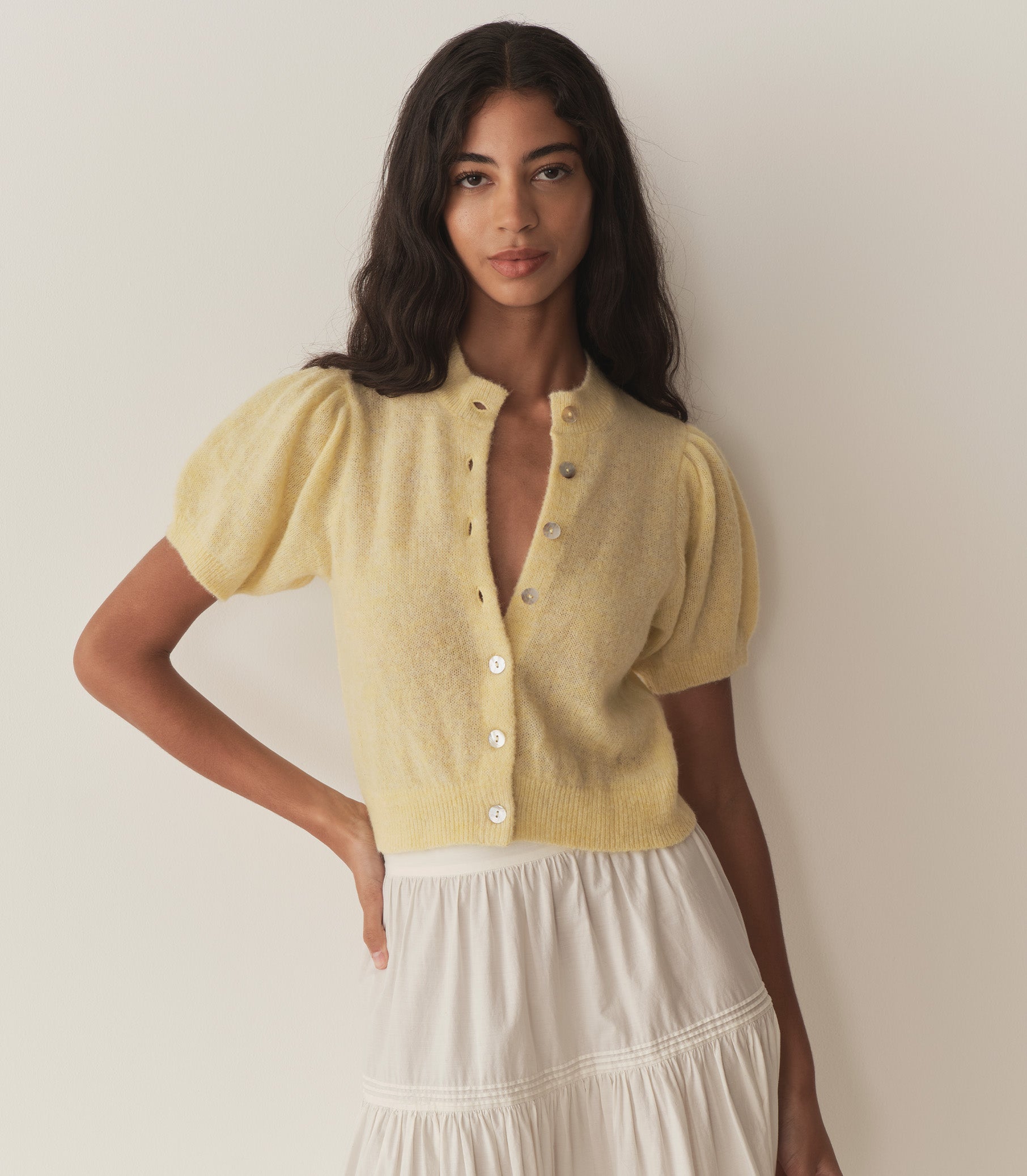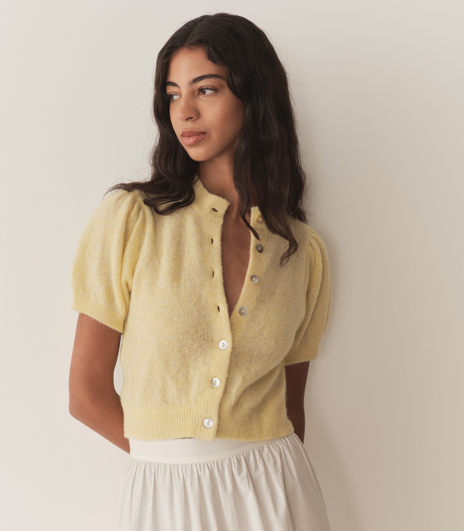 Crafted from a plush baby alpaca blend, the Anisa Cardigan features a crew neck, short puffed sleeves, and stretchy ribbing at the neck, cuffs, and hem. A line of delicate mother-of-pearl buttons runs down the front. Hitting at the true waist, it pairs beautifully with high-waisted jeans and dresses alike.