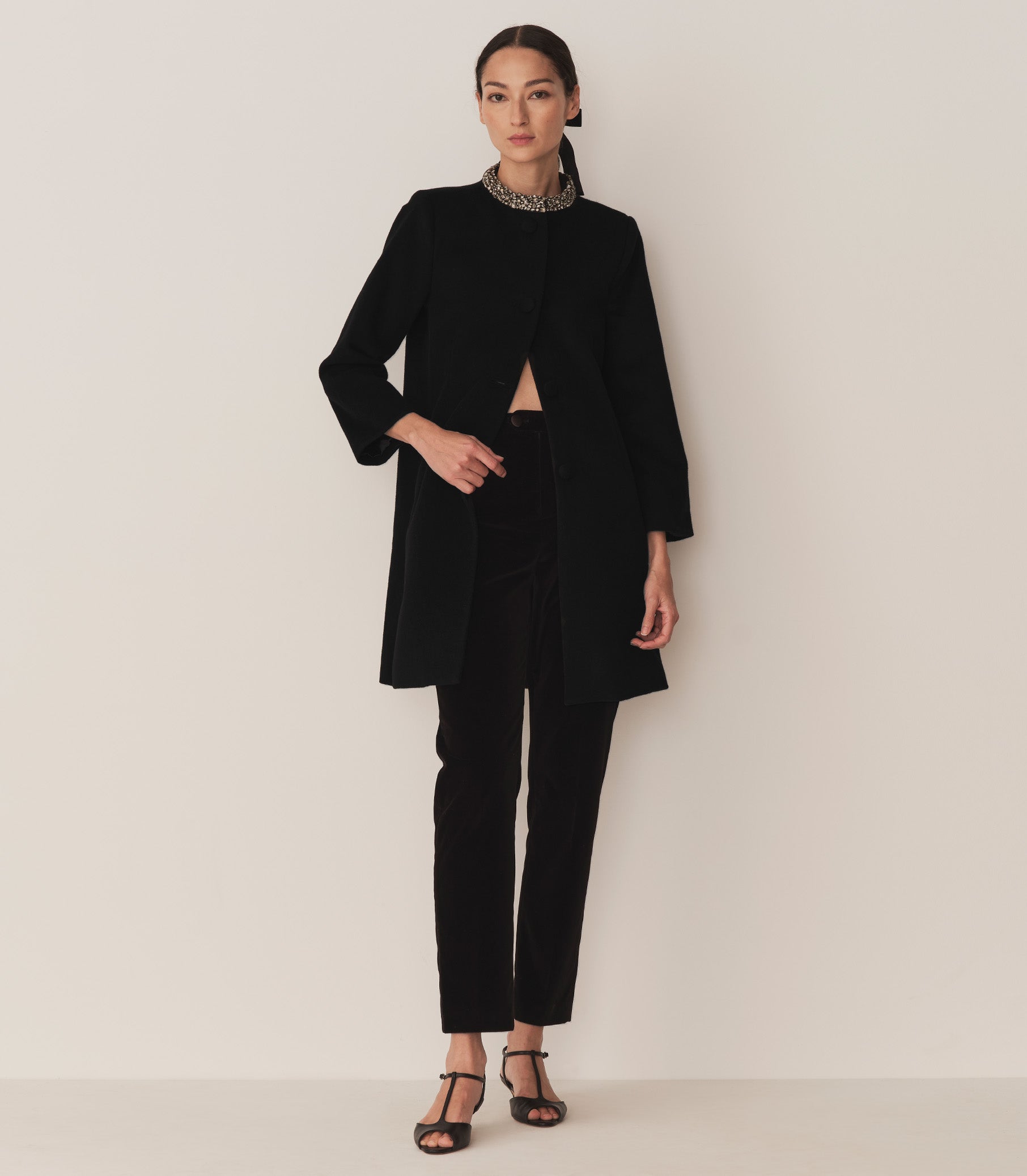 A holiday keepsake you’ll treasure for years to come, the DÔEN Heirloom Annemarie Cashmere Blend Coat takes cues from the elegant evening coats of the ‘60s. In a blend of cashmere and wool, it features bracelet-length sleeves and a crystal-encrusted collar. Self-covered buttons extend down the front. Pair it with holiday dresses on chilly nights for a polished layer.