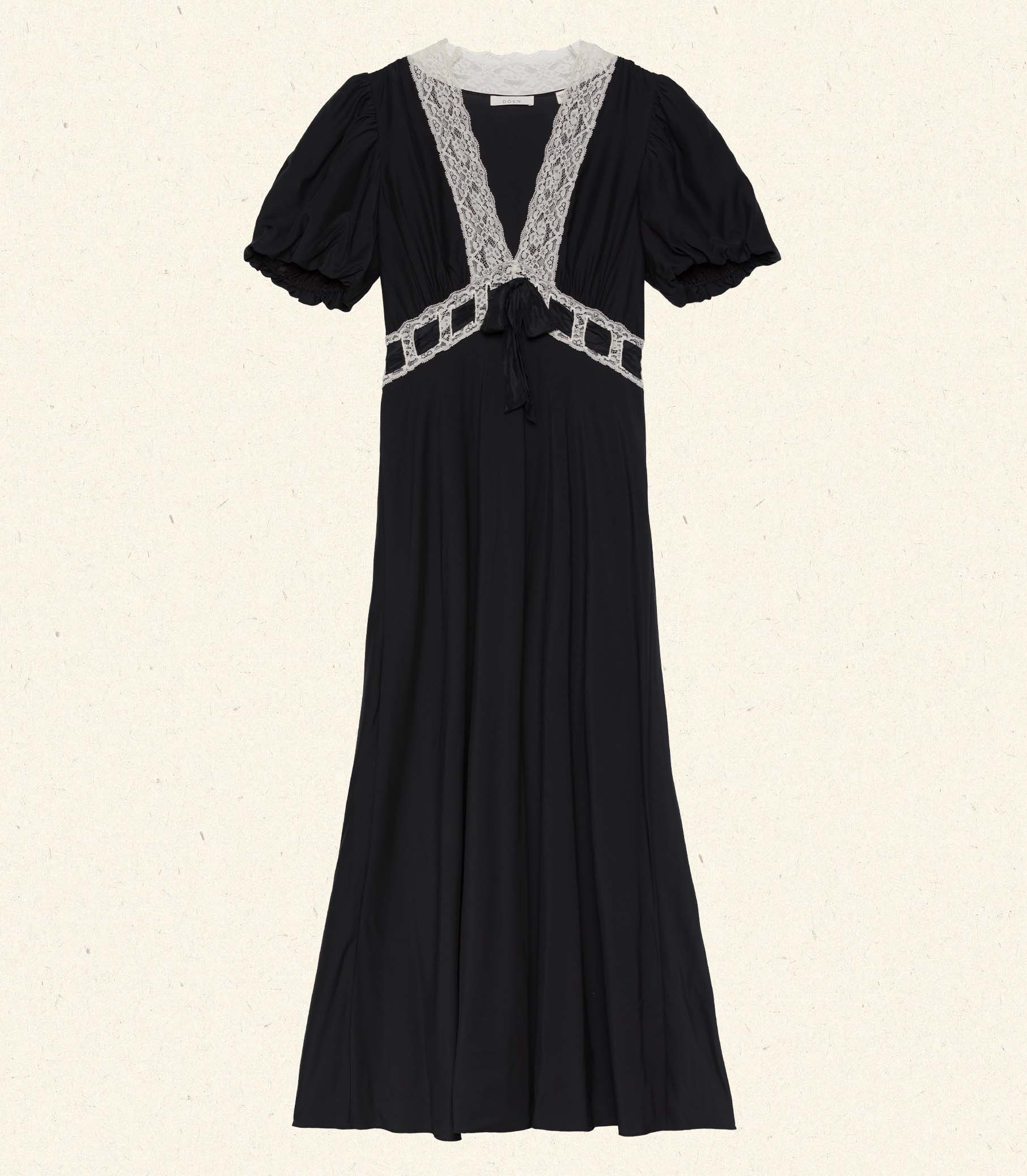 Crafted from a lightweight silk-viscose blend, the boudoir-inspired Augustina Dress features short puffed sleeves and a deep V-neckline trimmed with intricate lace. Threaded with a silk ribbon, a gathered bust and angled waist with an invisible side zipper gives way to an ankle-grazing, bias-cut skirt.