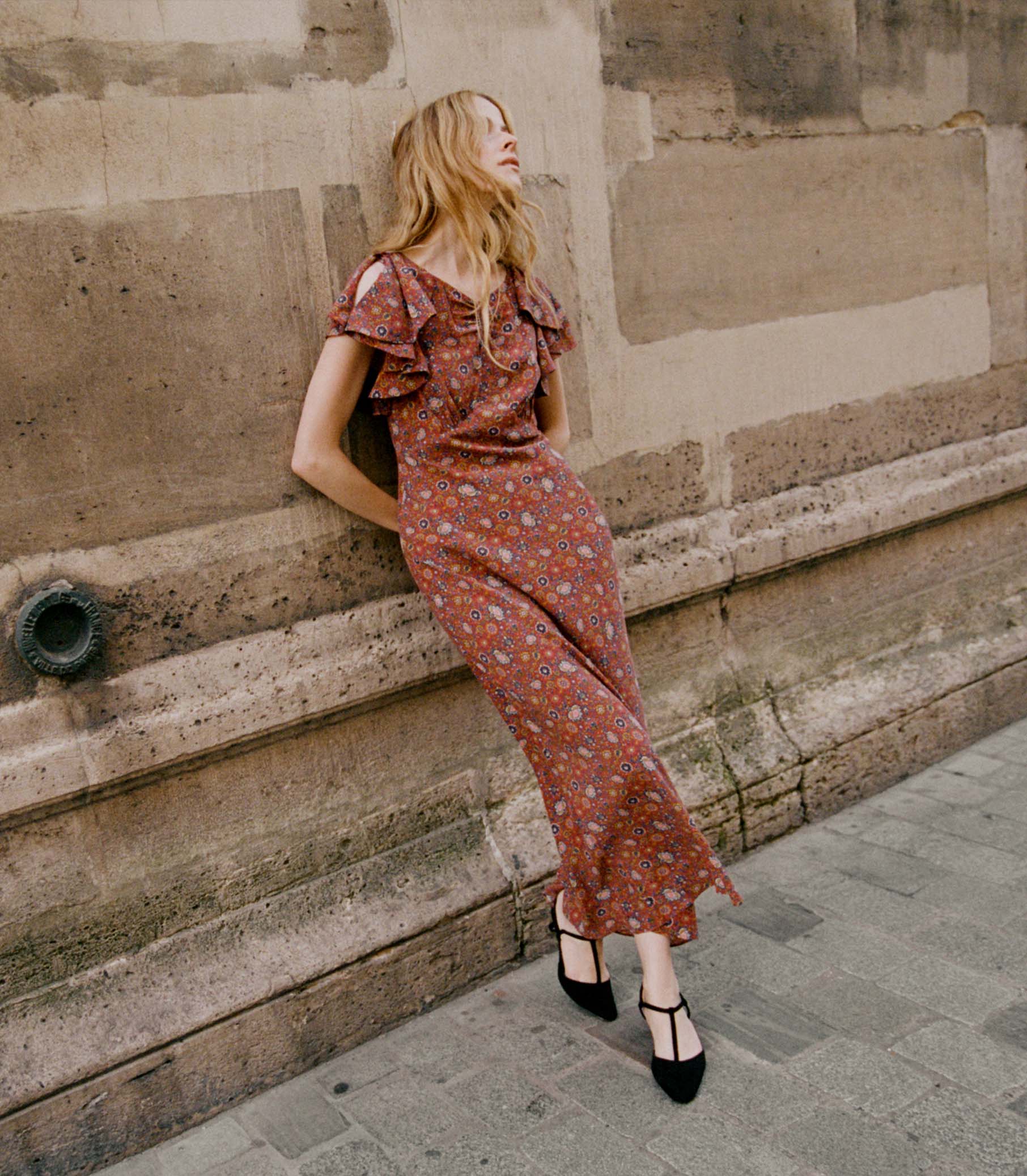 Crafted from lustrous 100% silk and rendered in our Riviera Medallion, the ‘30’s-inspired Beatriz Dress features a high wide v-neckline, cascading ruffles at the shoulder and neckline, and shirring at the bust with an invisible side zipper that gives way to an ankle-grazing bias cut skirt.