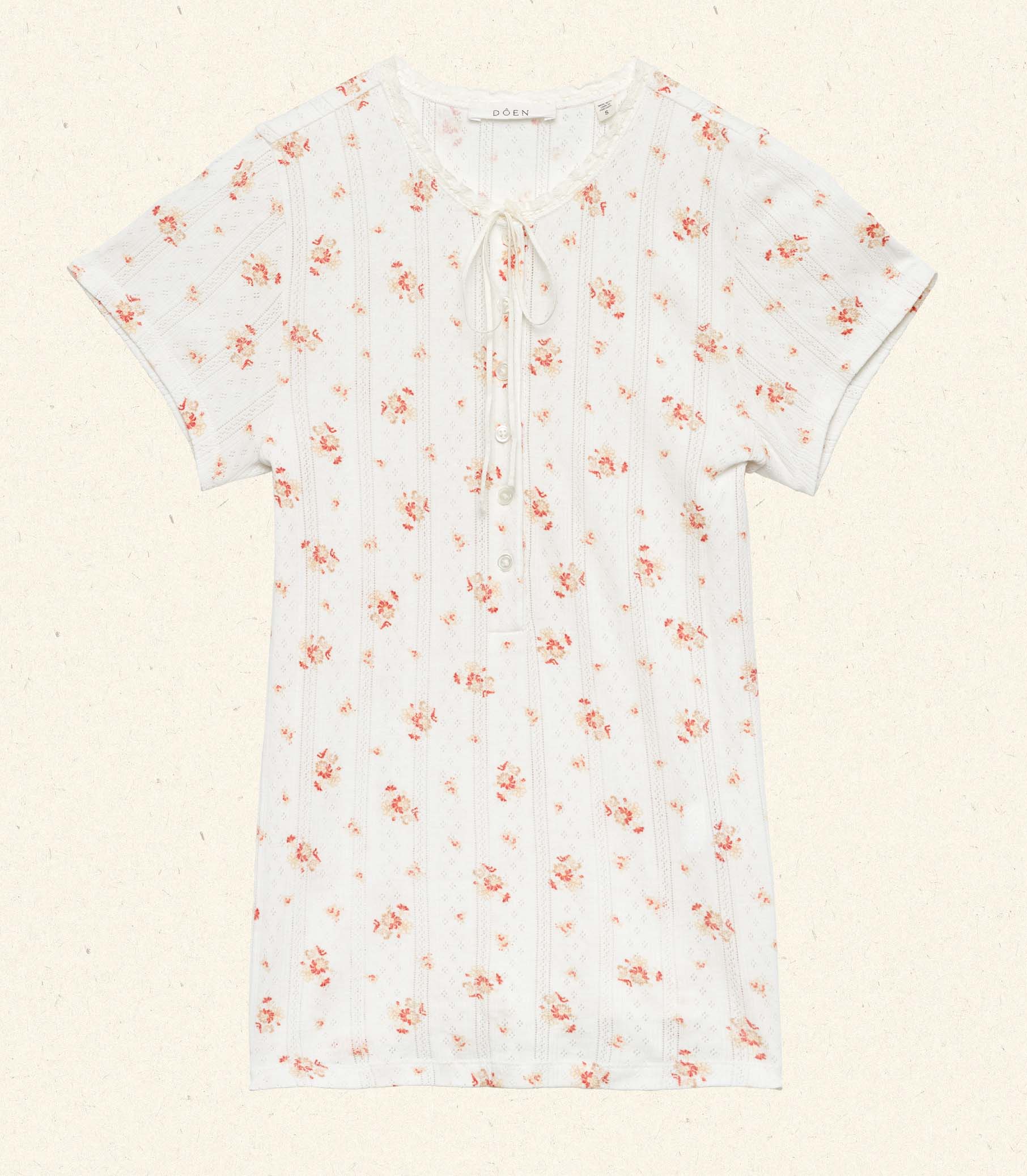 In the softest organic cotton pointelle adorned with our playful French Marigold, the Brie Tee features a fitted silhouette, short sleeves, and a crew neckline trimmed with petite scallop lace and a functional center tie. Mother-of-pearl buttons extend from the neckline to the mid-bust. Perfect for layering, the Brie is sure to become a year-round staple.