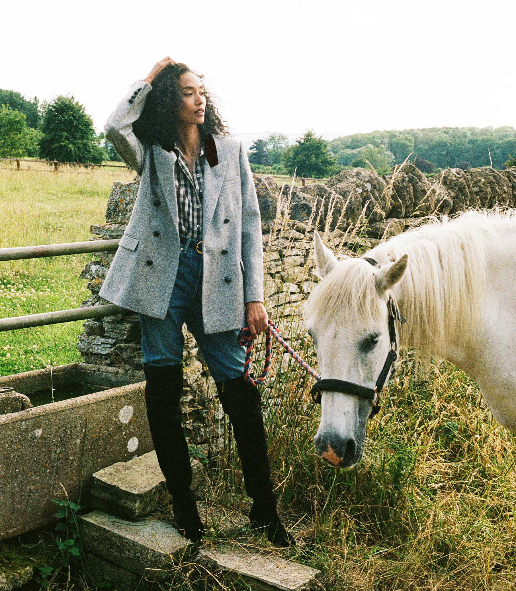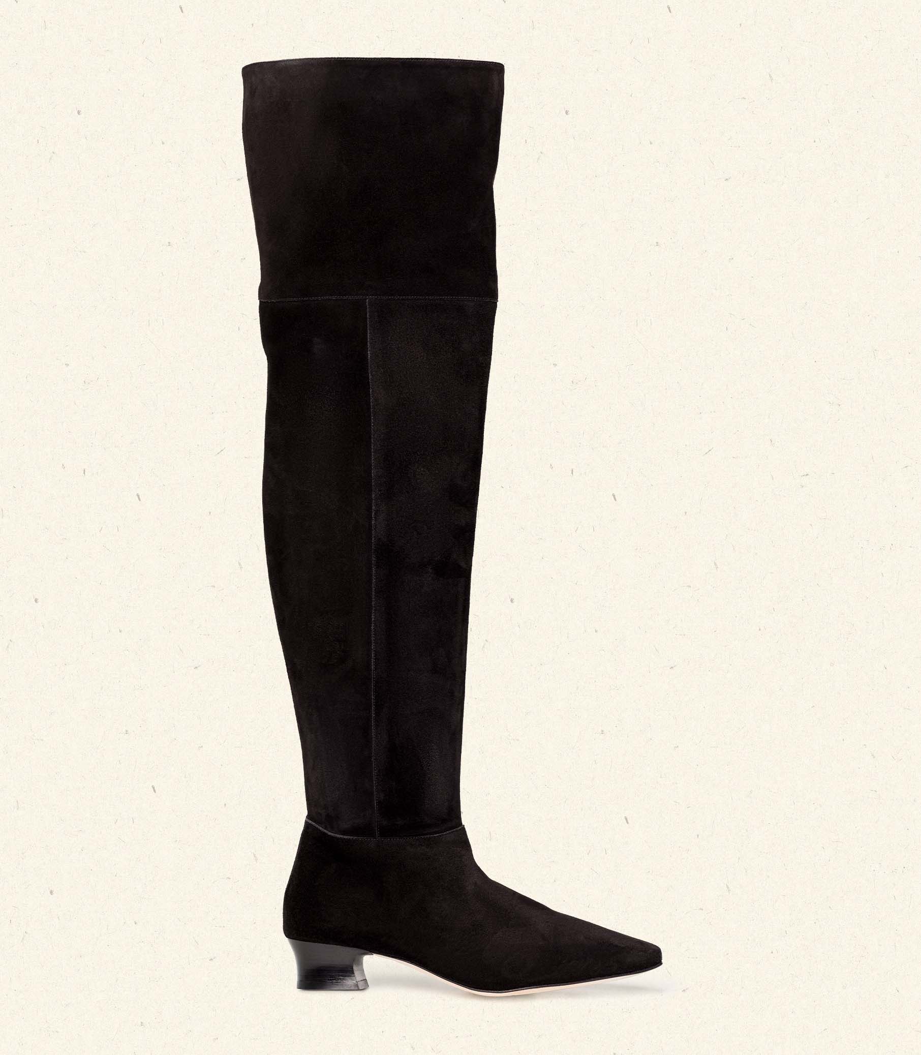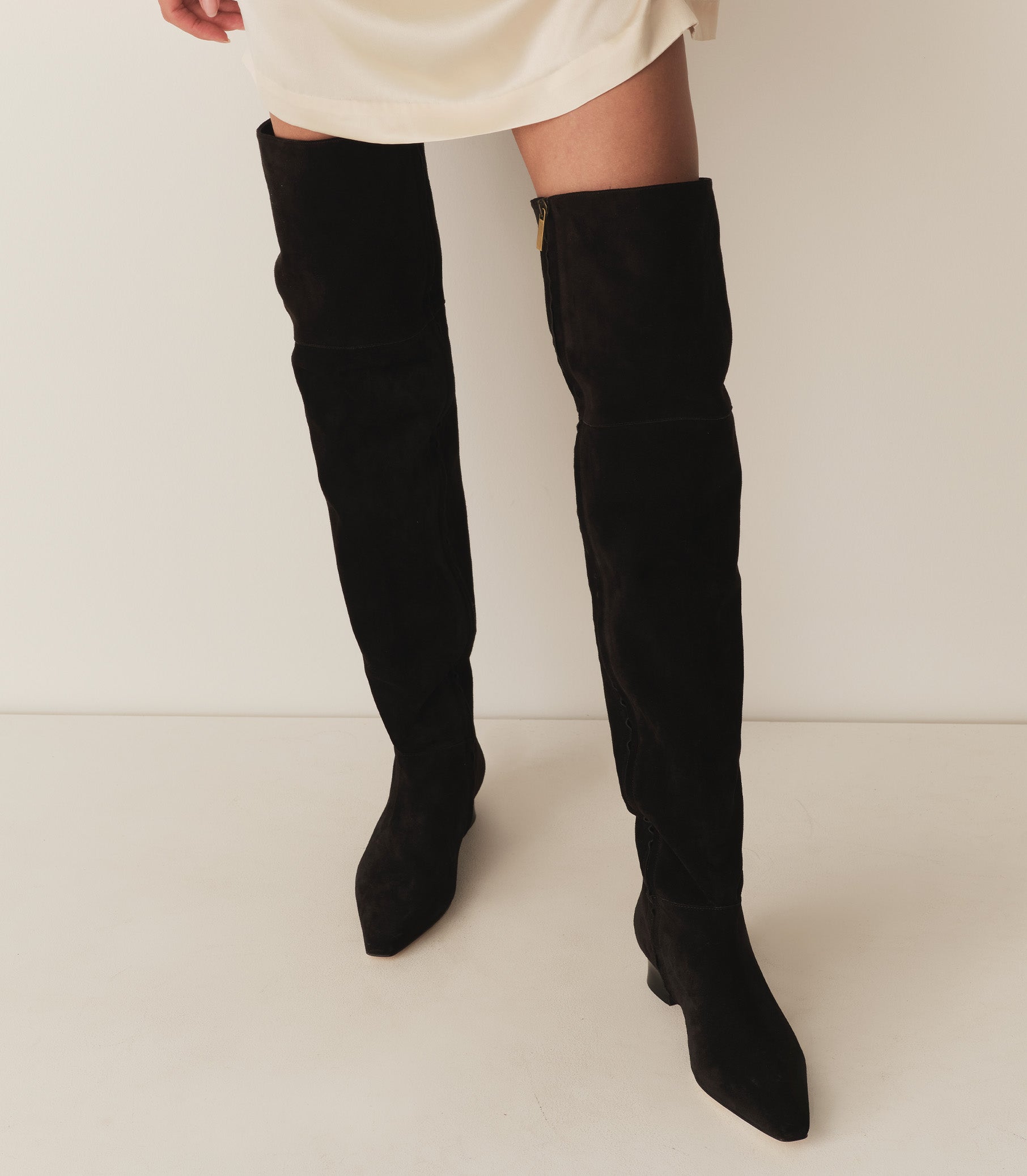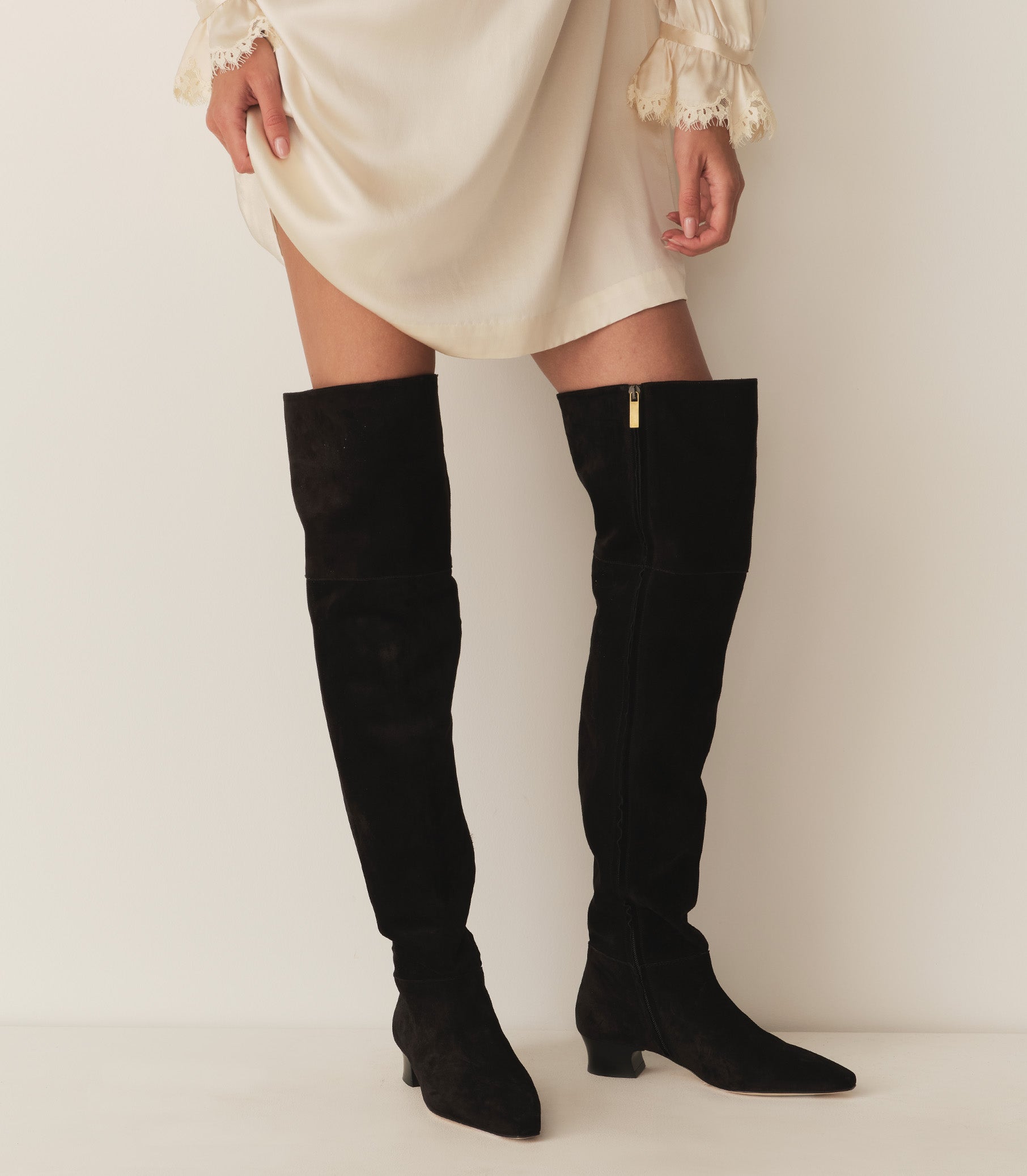 Handcrafted in Italy from suede, the Cambria is a ‘60s-inspired over-the-knee boot with a low curved heel, an almond-shaped toe, a soft leather lining, and an inner zipper.