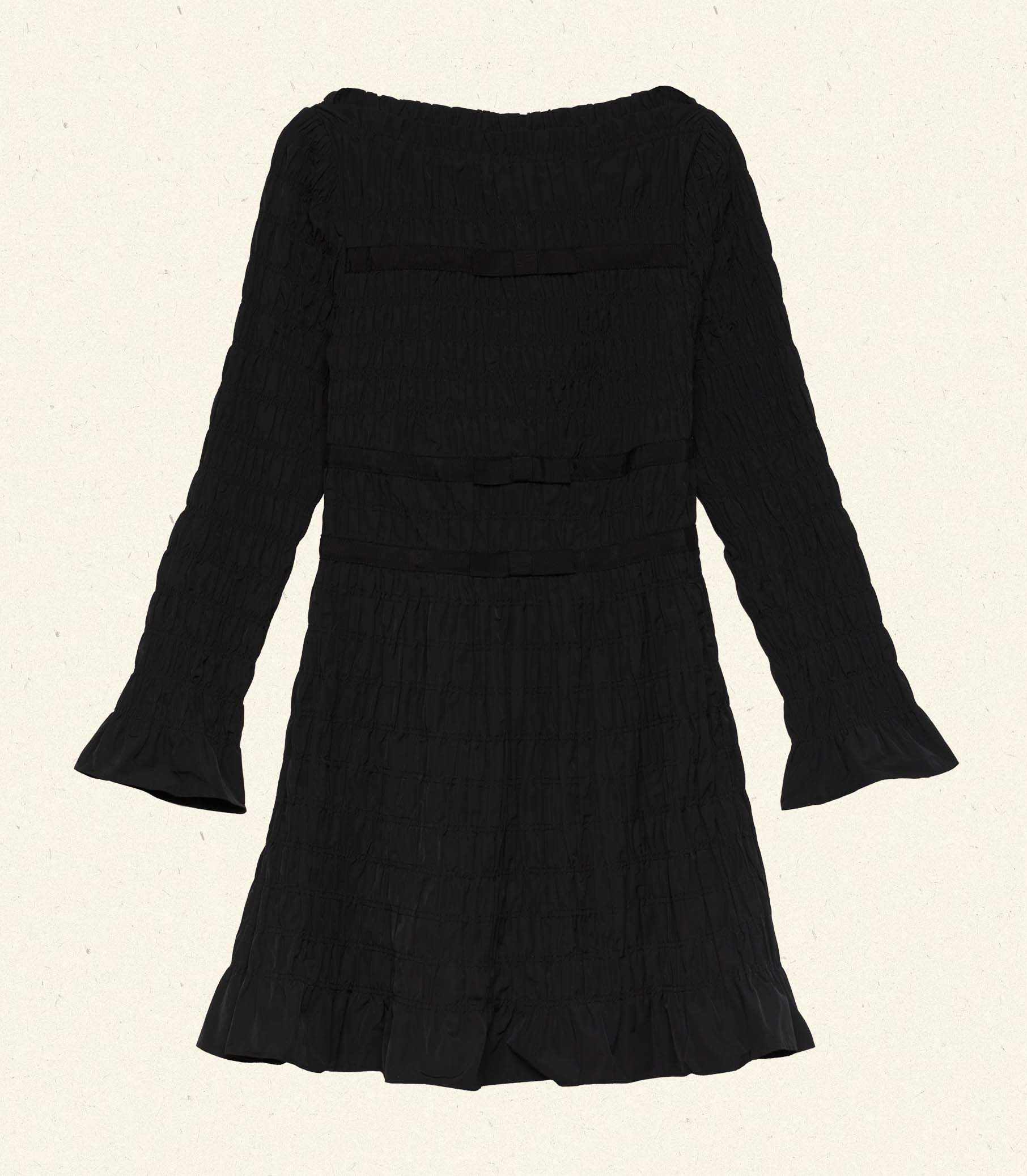 In a crisp cotton-blend taffeta, our Cecillia Dress is a ‘60s-inspired mini dress with a bateau neckline, three-quarter length sleeves and allover elasticized smocking, detailed with ruffles at the collar, cuffs, and hem. Grosgrain ribbon at the neck, waist, and skirt adds a touch of festive charm, and an invisible side seam zipper creates the perfect fit.