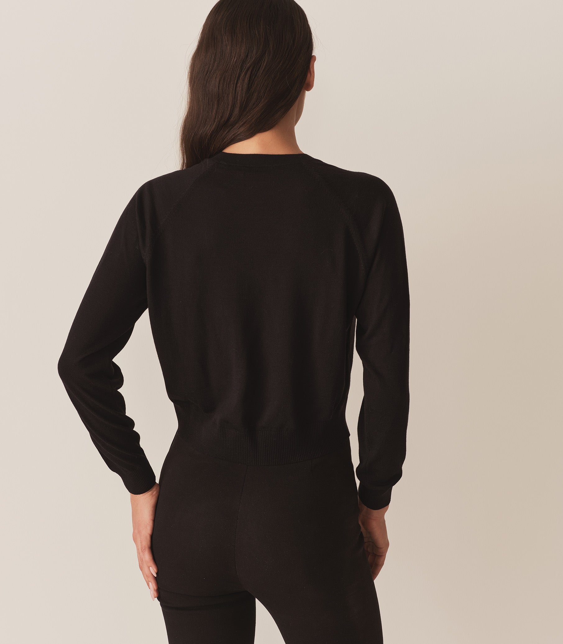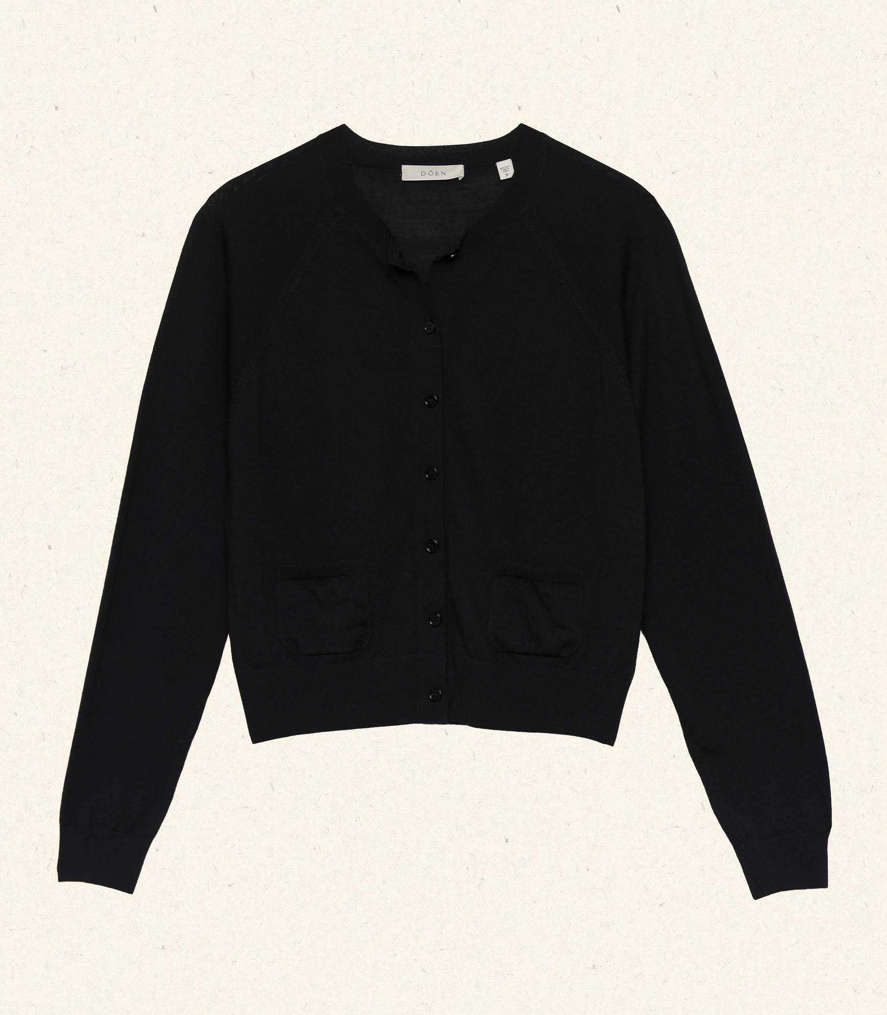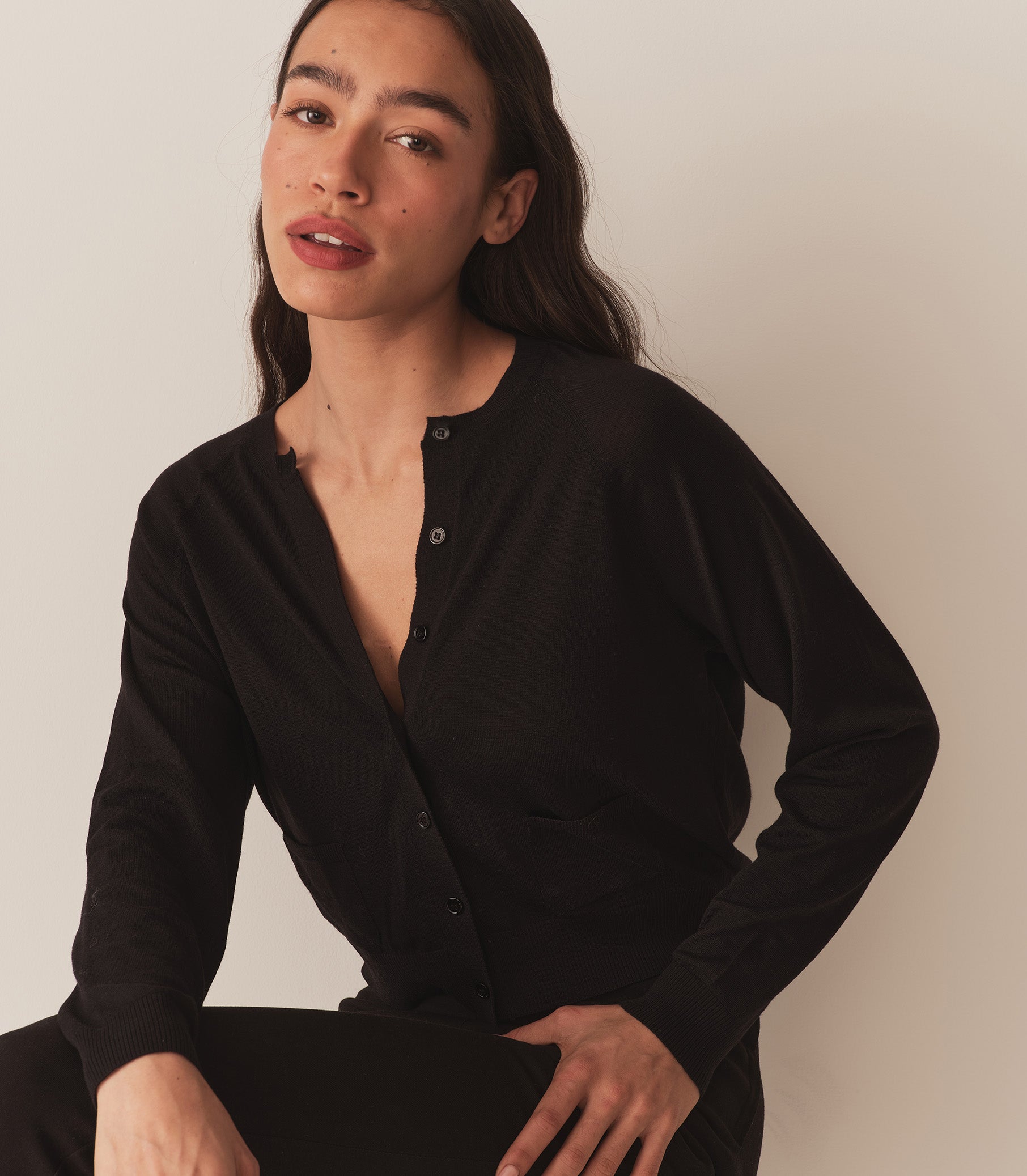 Made in a lightweight, supersoft merino wool, the Celine Cardigan—which takes cues from ‘60s silhouettes—features full-length raglan sleeves, two front pockets, and ribbing at the neck, cuffs, and hem. Mother-of-pearl buttons extend down the front.