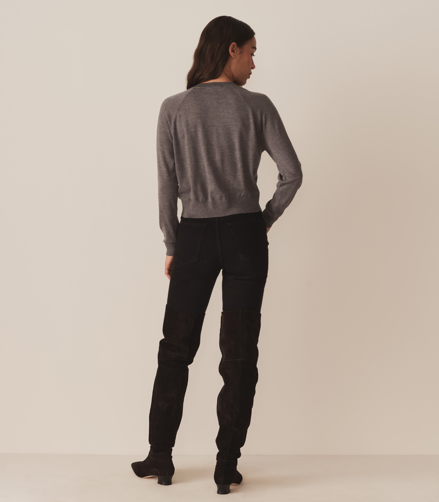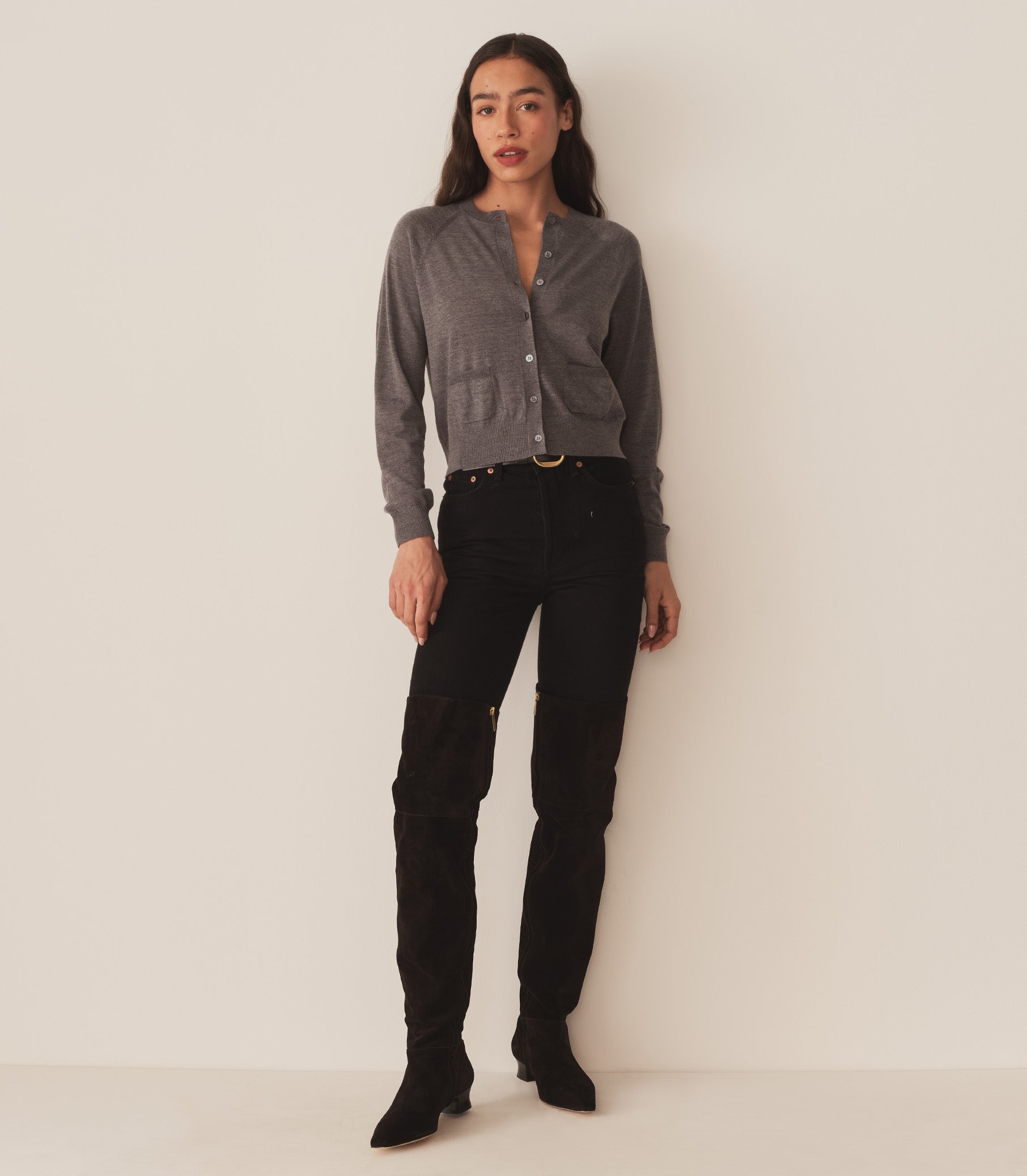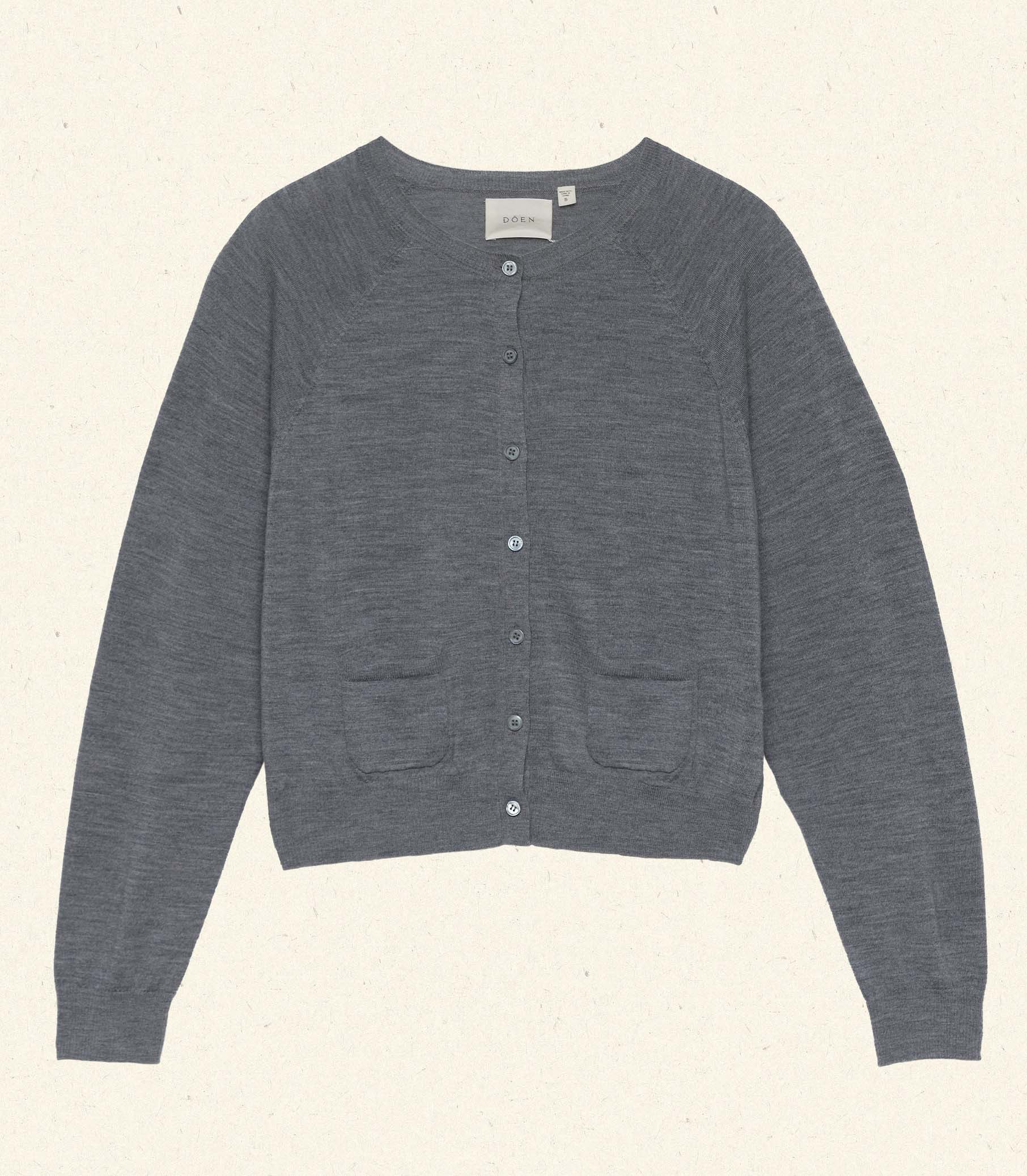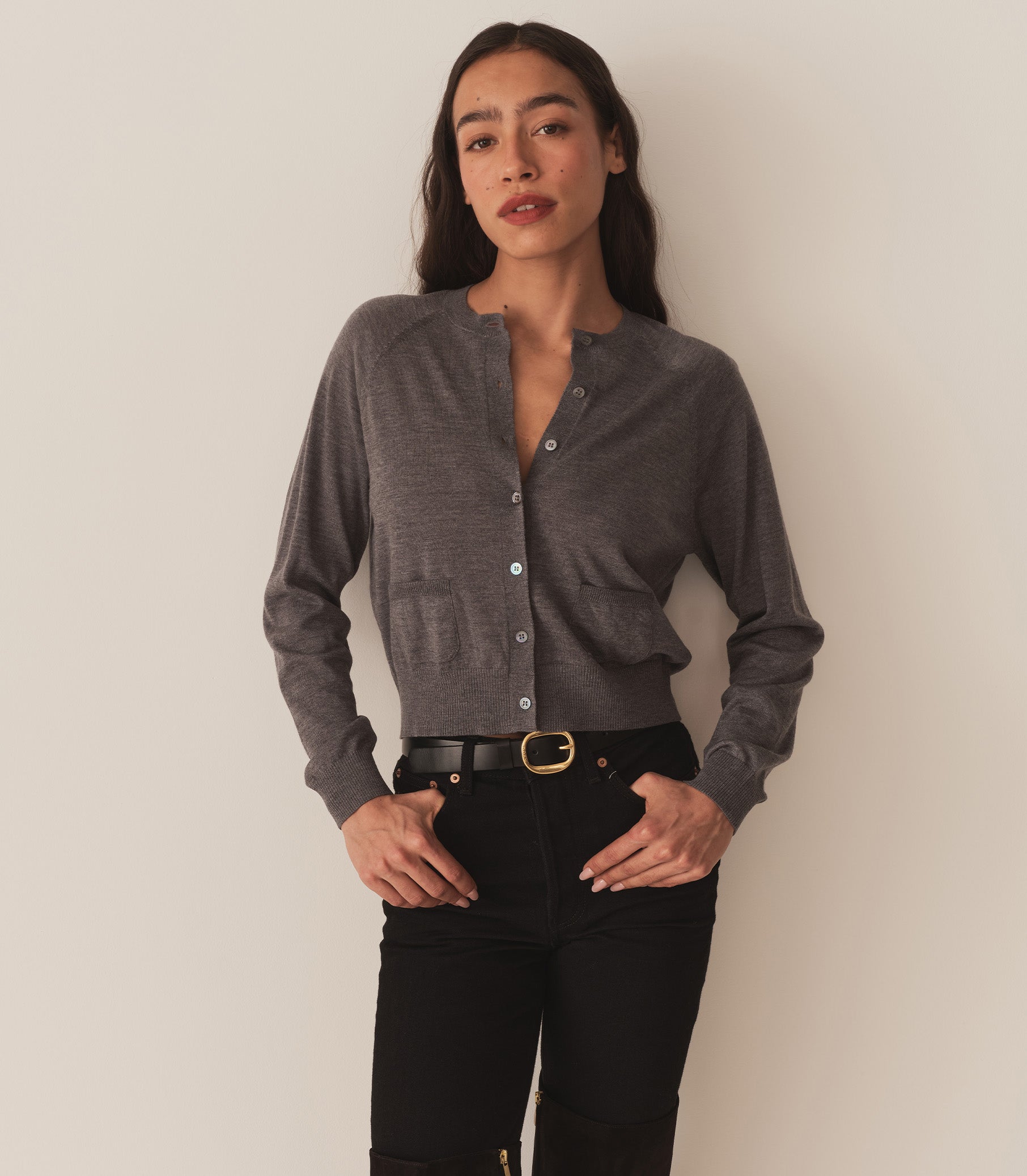 Made in a lightweight, supersoft merino wool, the Celine Cardigan—which takes cues from ‘60s silhouettes—features full-length raglan sleeves, two front pockets, and ribbing at the neck, cuffs, and hem. Mother-of-pearl buttons extend down the front.