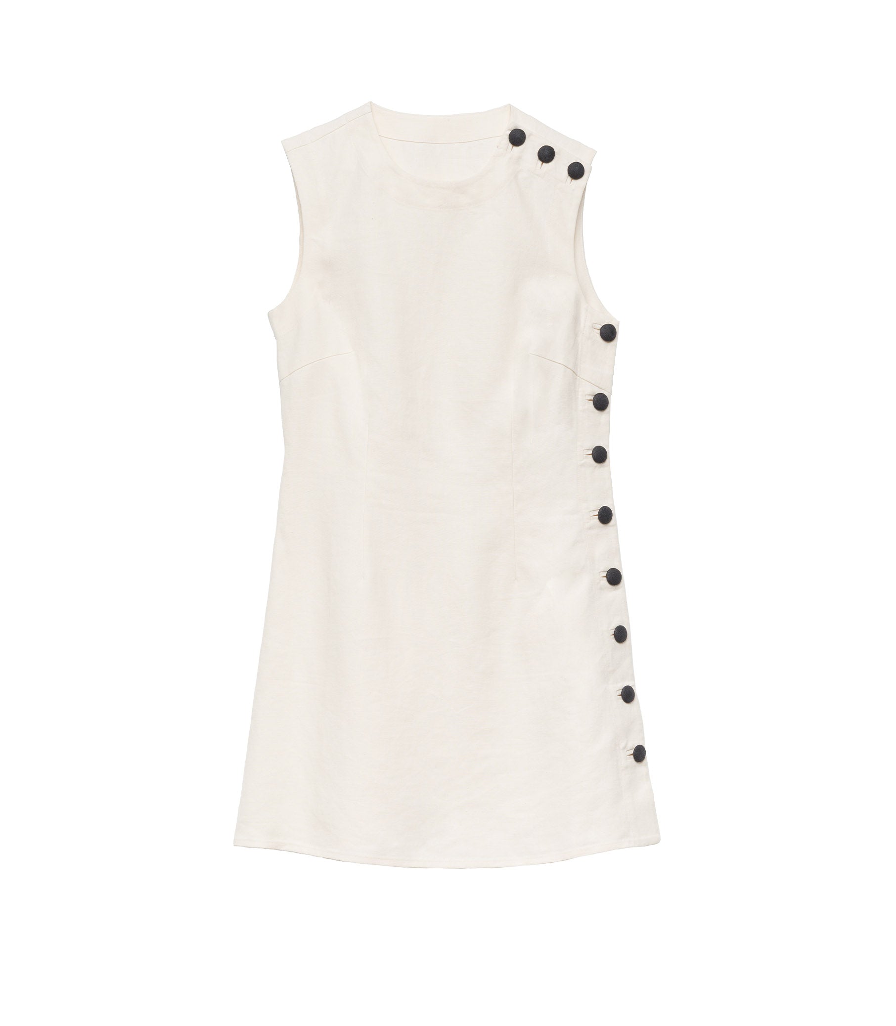 Tailored in soft midweight hemp with a cotton lining, the Coralie is a ‘60s-inspired sleeveless shift dress with a crew neckline, a straight cut, and a mini-length hemline. Contrast self-covered buttons fasten at the side seam and shoulder.