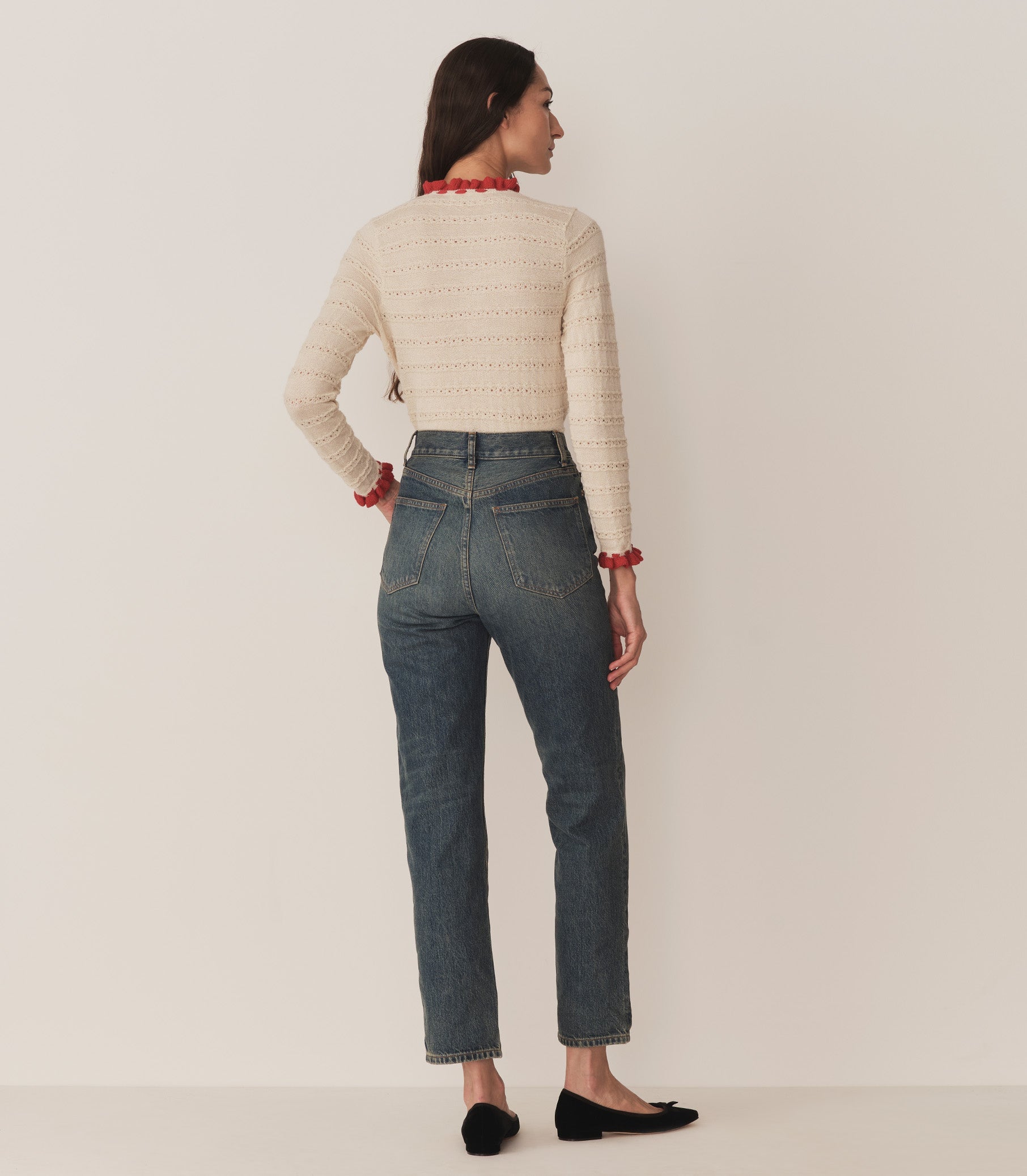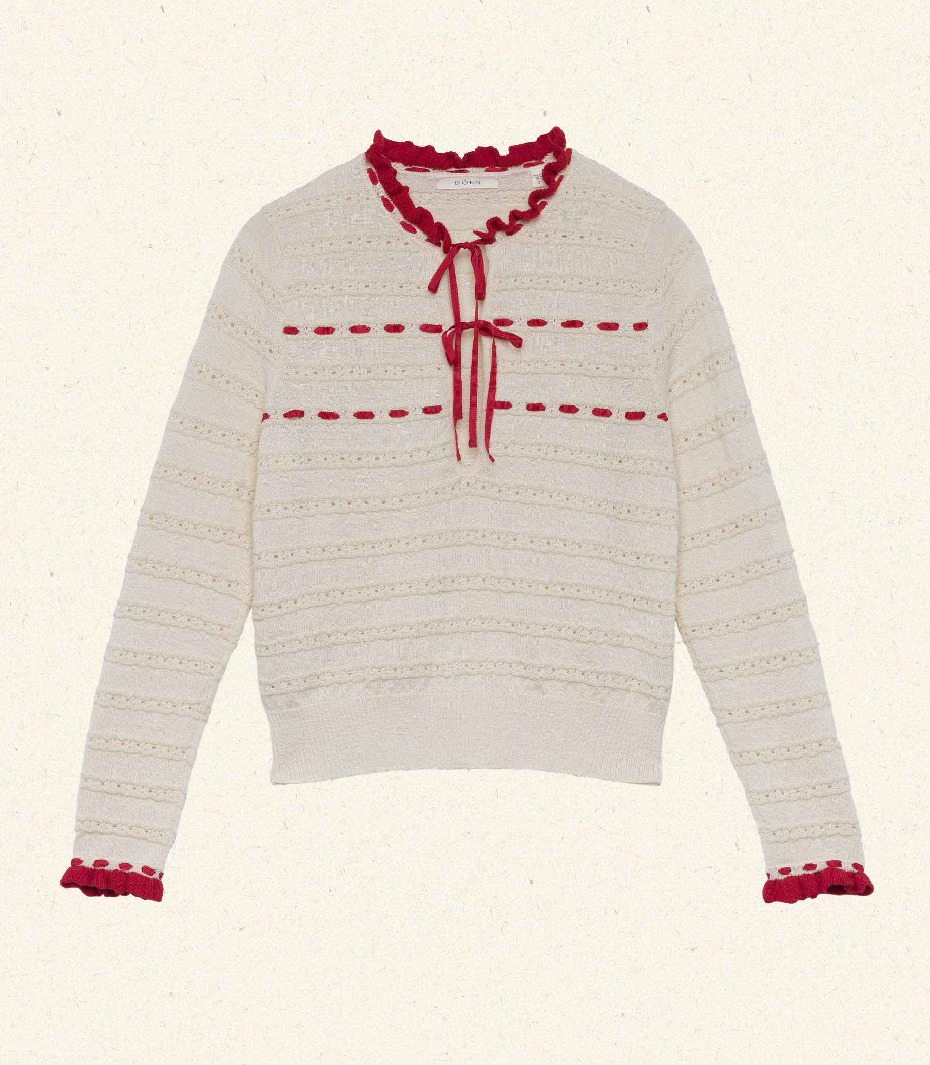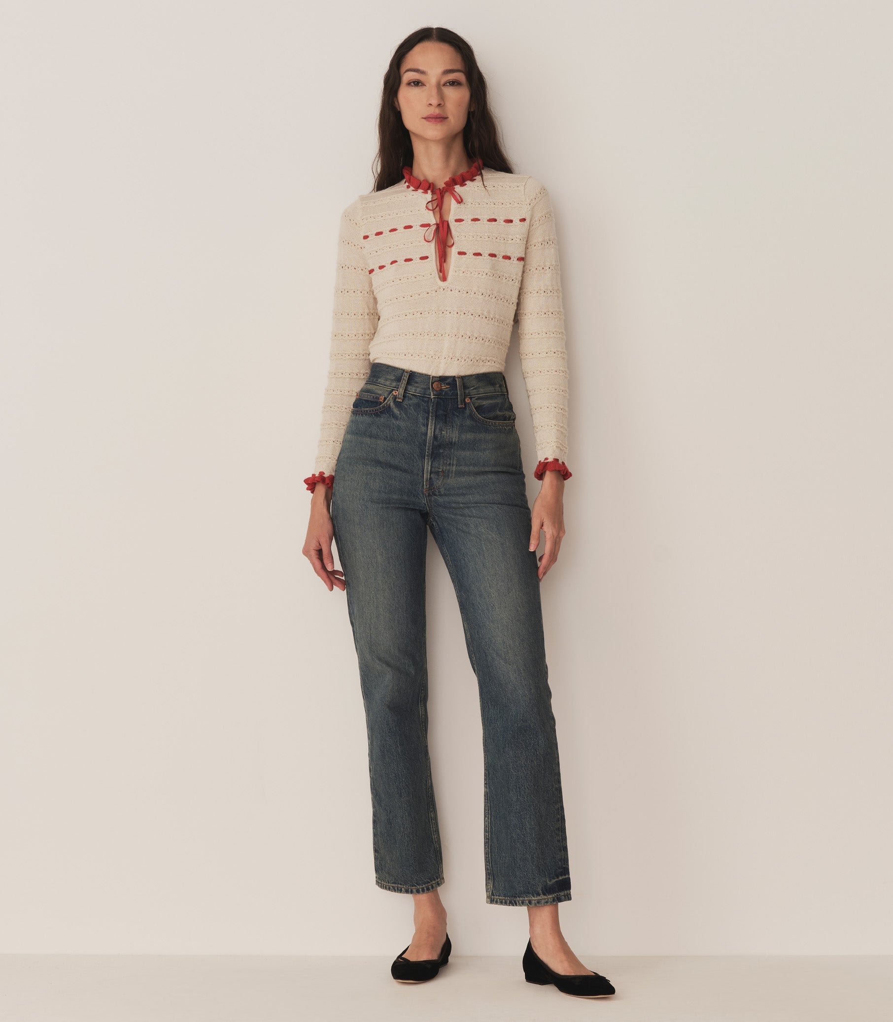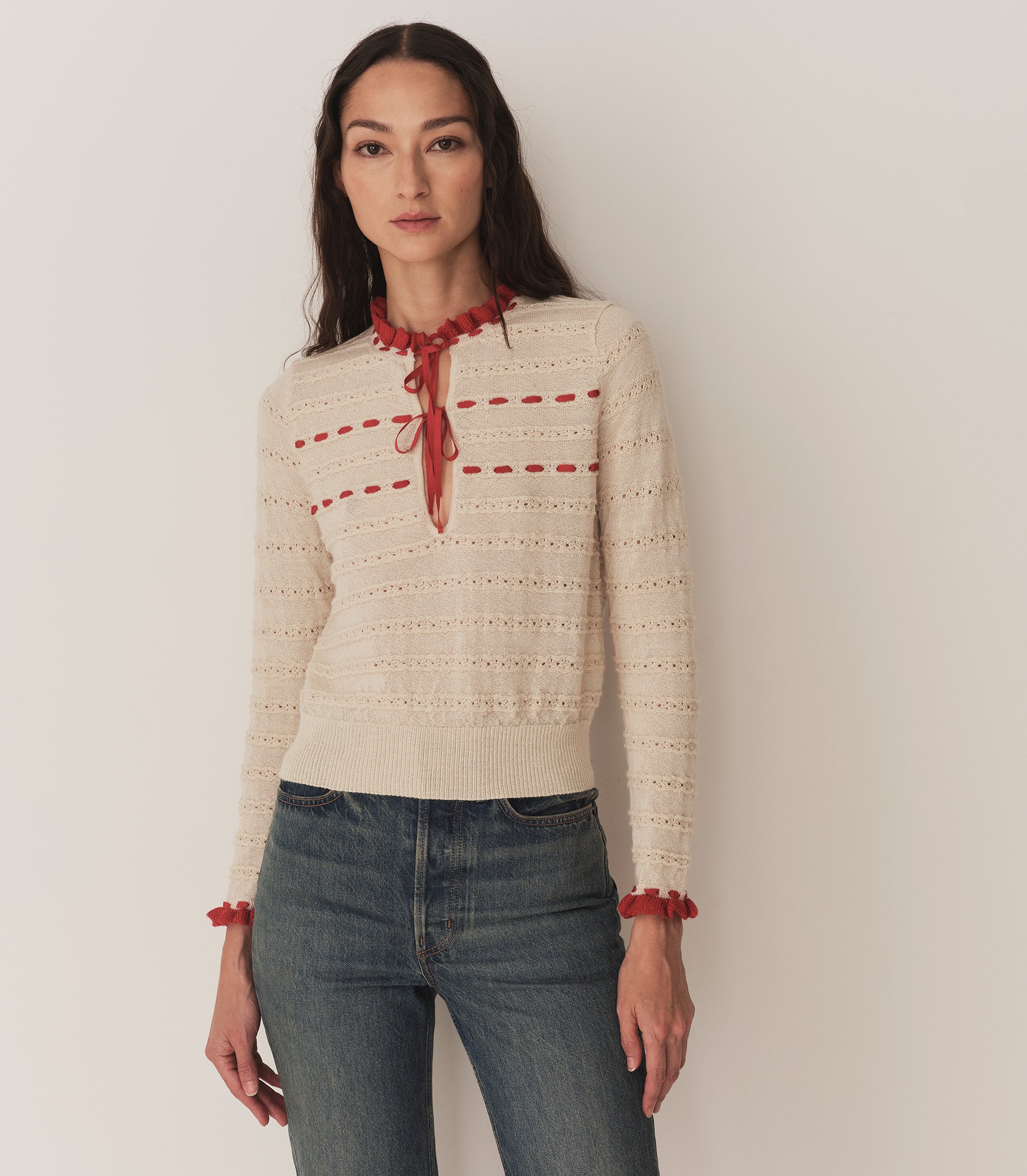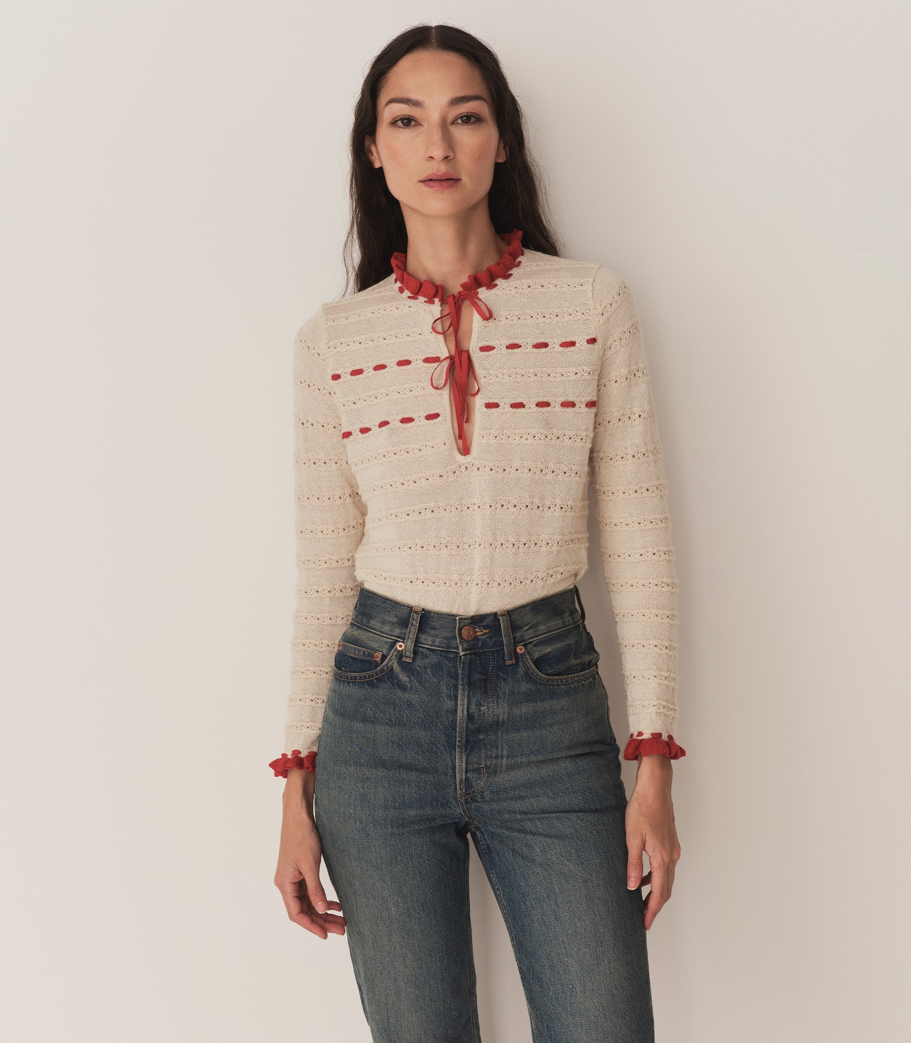 Taking cues from ‘40s knitwear, the Cordelie Top is crafted from a layerable, extra soft baby alpaca-silk blend and detailed with silk grosgrain ribbons that finish in a tie at the neck.