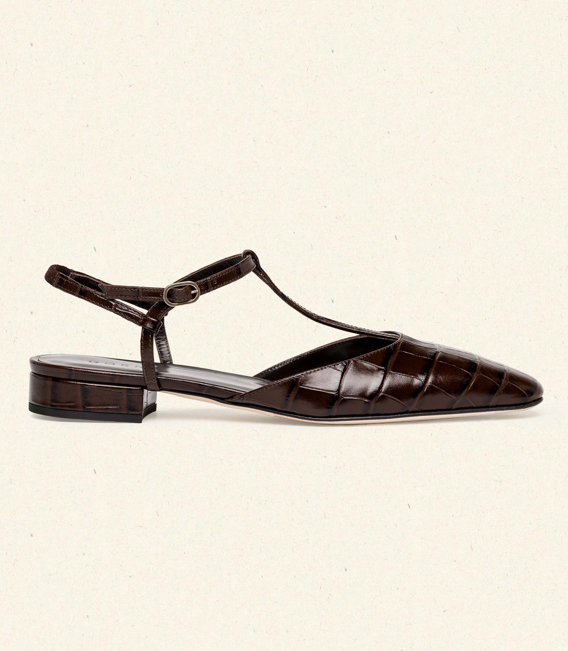 CRISTINA T-STRAP FLAT -- BROWN FAUX CROC