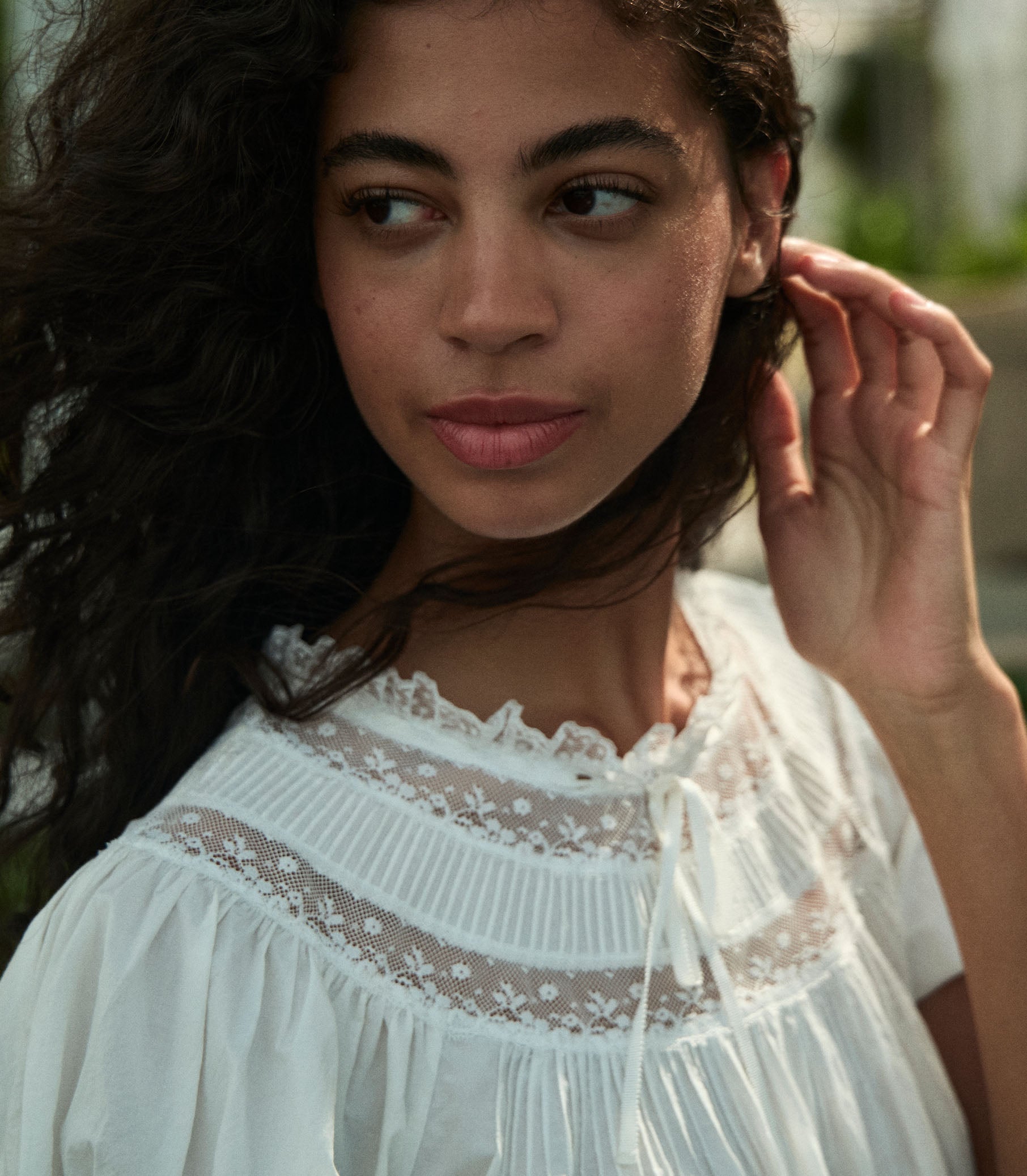 In crisp organic cotton poplin, the Daphné Dress features a breezy A-line silhouette with short puffed sleeves and a mini-length hemline. Floral scallop lace, pintucks and a grosgrain ribbon tie adorn the yoke and neckline, while scallop edge lace trims the sleeve cuffs and hem.