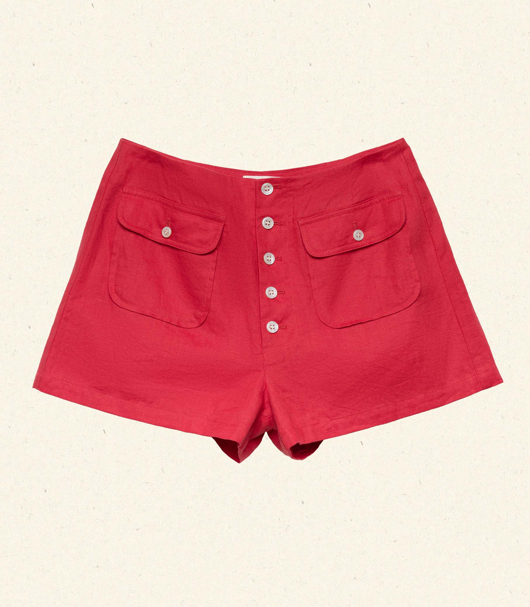 A playful summer short, the ‘40s-inspired Darling Short is tailored in soft, midweight linen and fully lined with cotton voile. A line of mother-of-pearl buttons extends down the front, plus two patch pockets to tuck essentials.