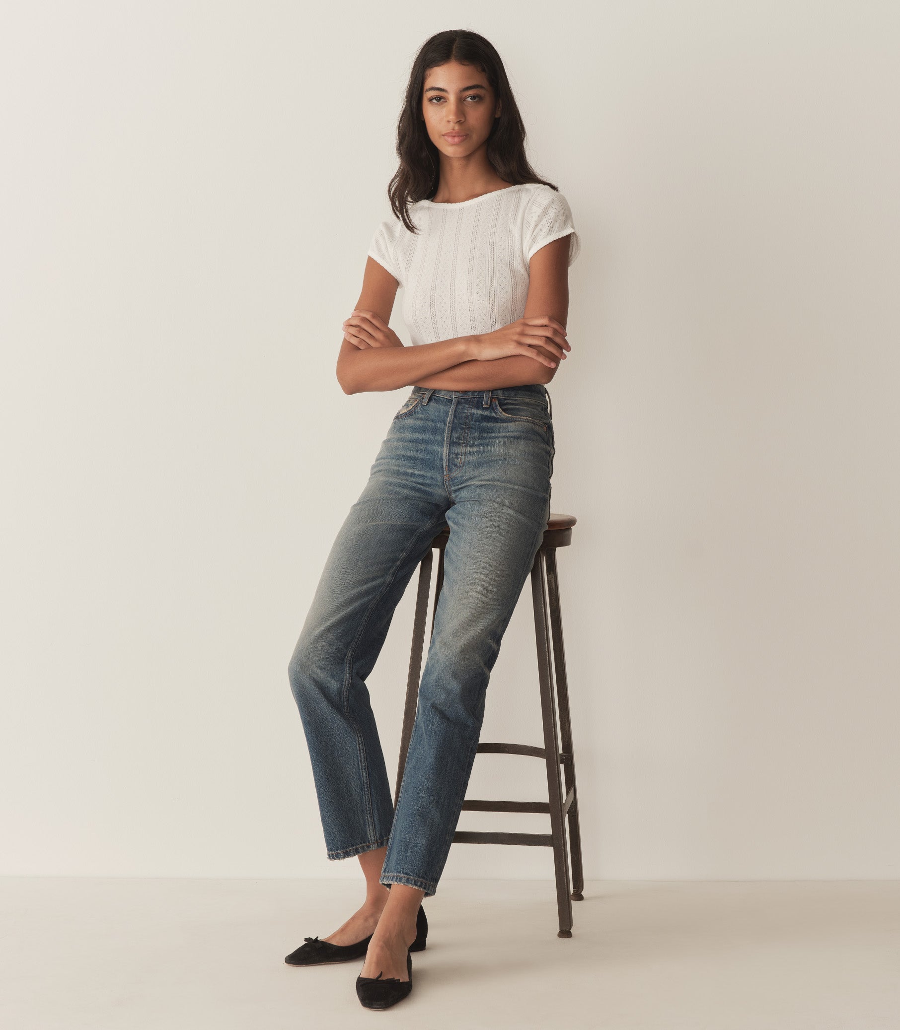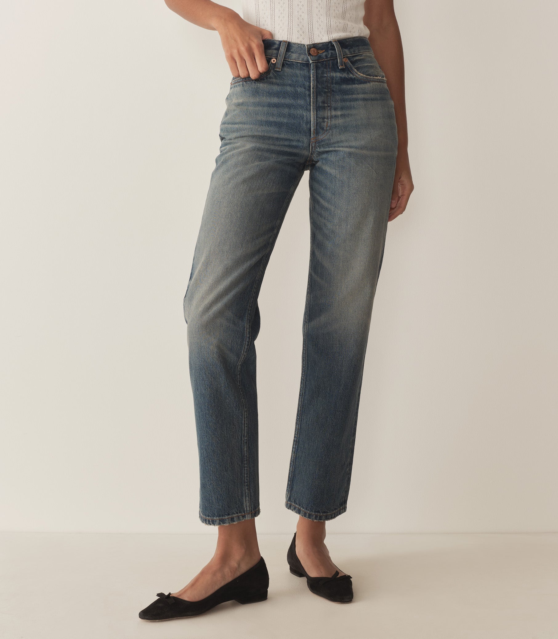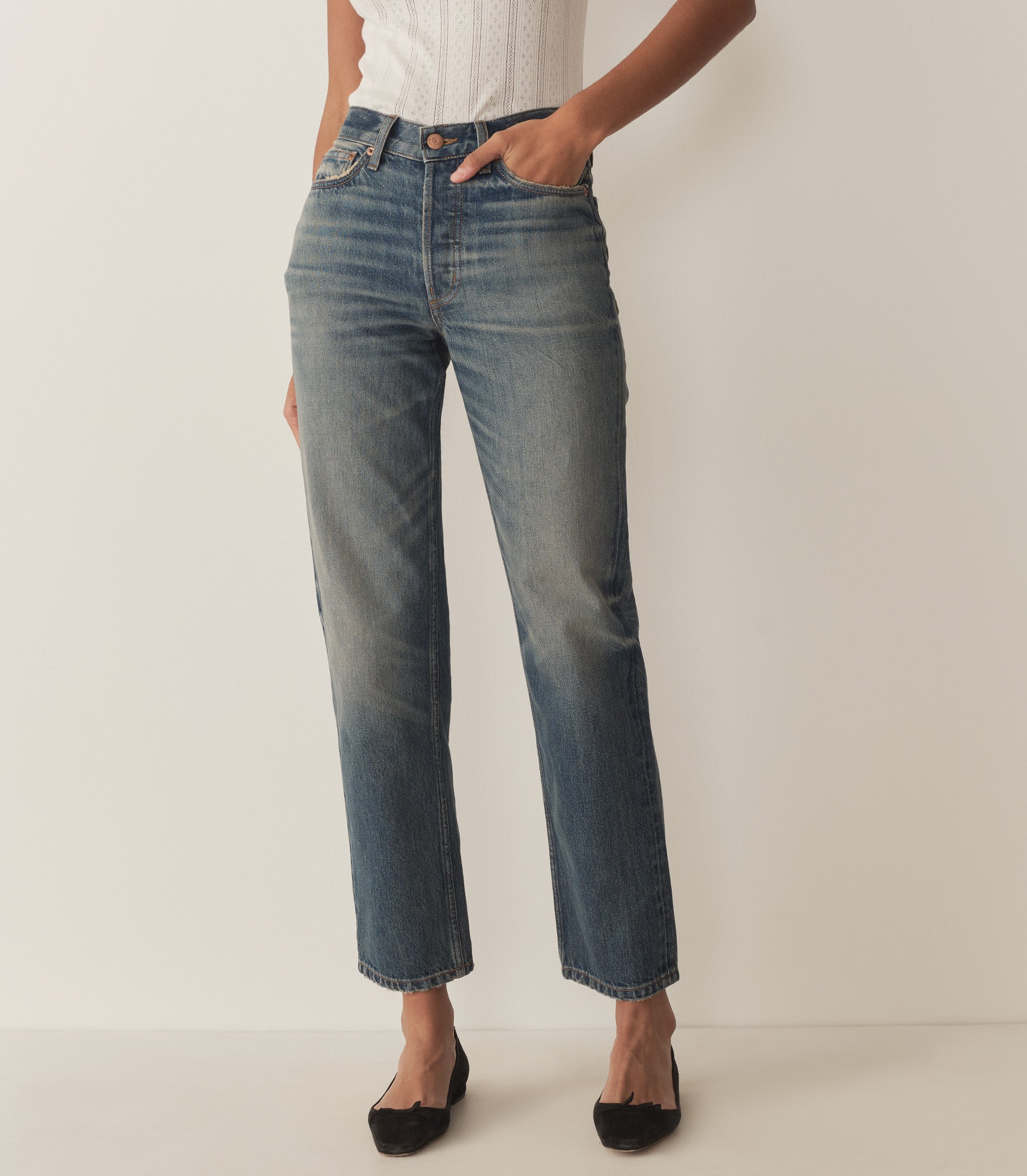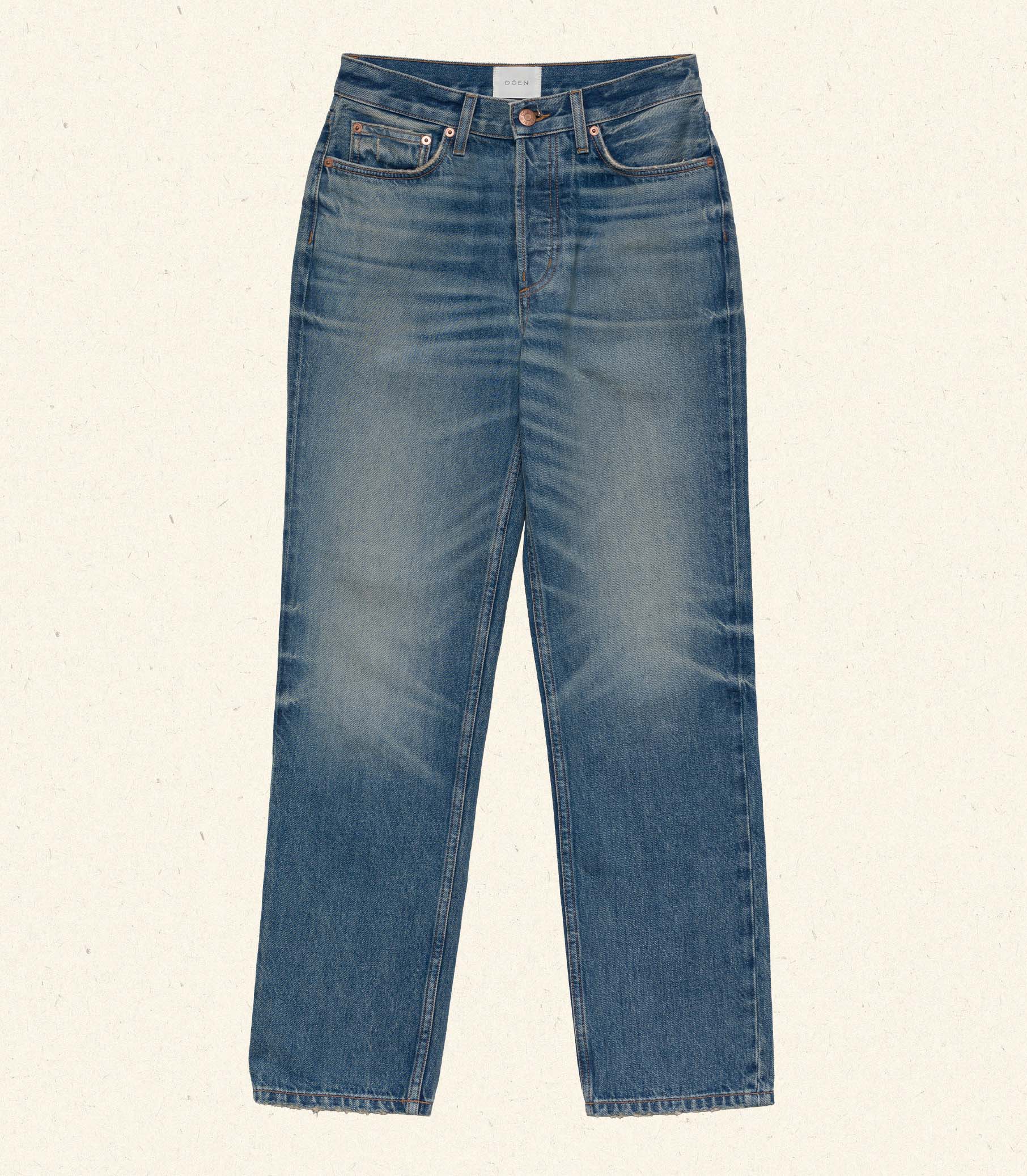 Inspired by our favorite vintage denim and crafted from organic cotton, our forever-favorite Diana Jean features a button fly, a high waist, and a classic straight leg. Pointed back pockets rest below a triangle yoke, while a second set of functional pockets in front include a mini side pocket on the right.