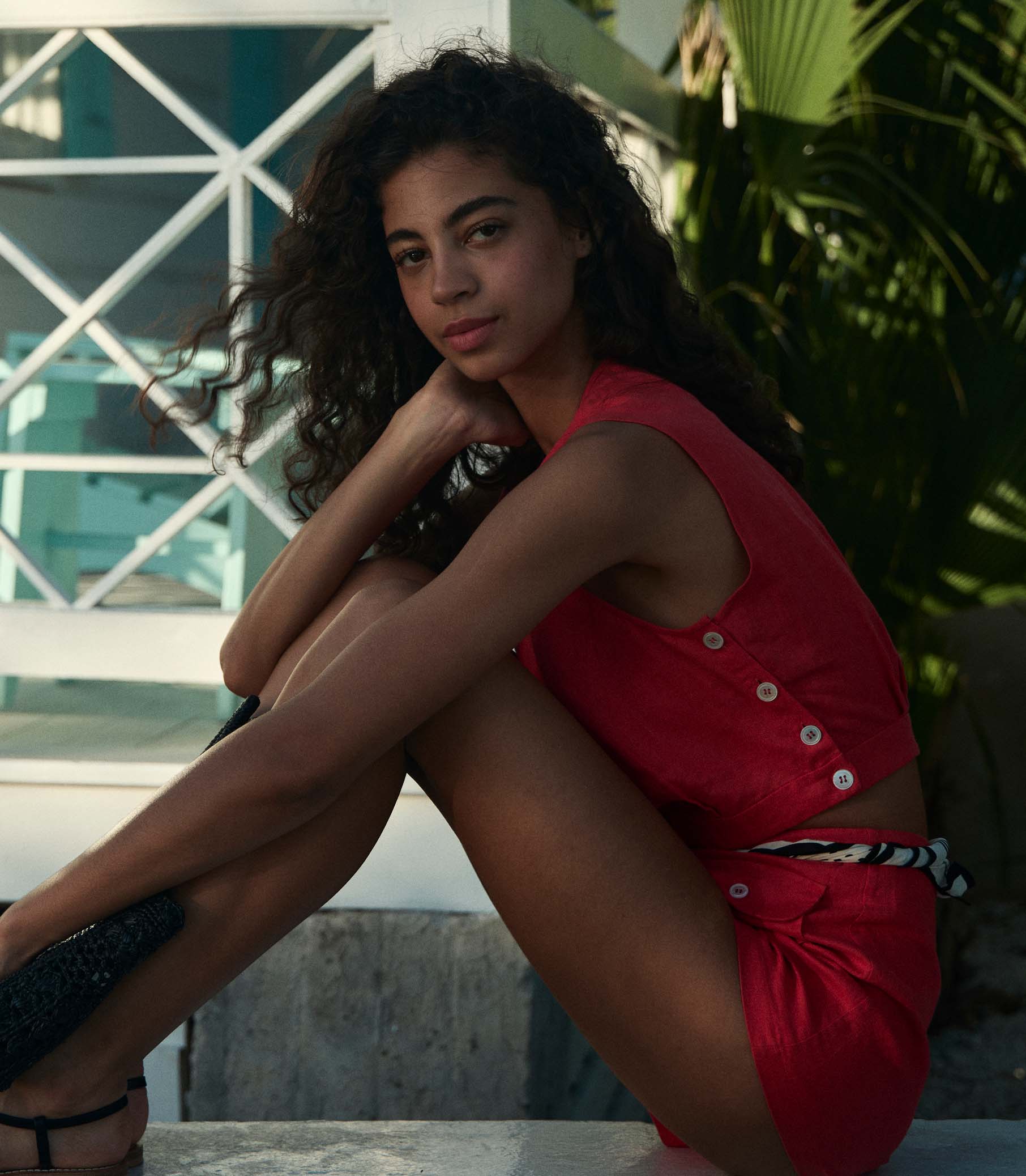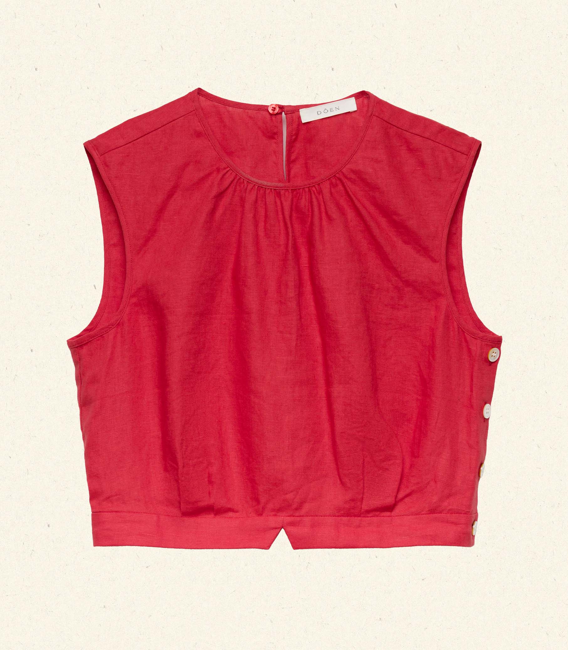 The ‘40s-inspired Doris Top is tailored in a soft, midweight linen with a high neckline and slightly cropped silhouette. A line of mother-of-pearl buttons extends down the side, and a single button fastens at the back neck.