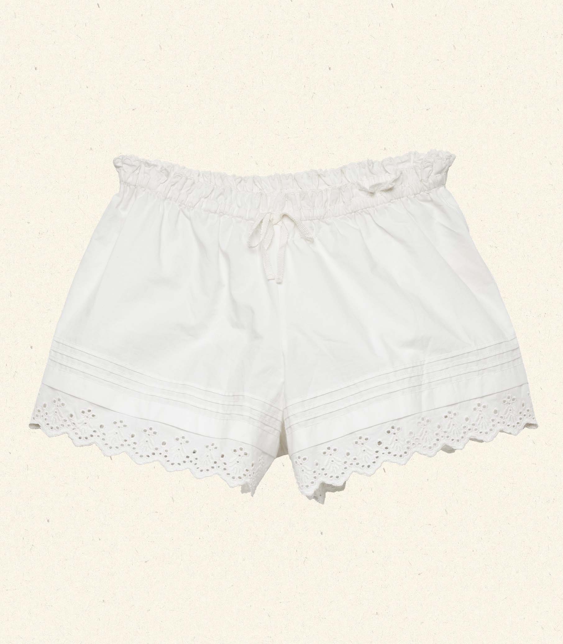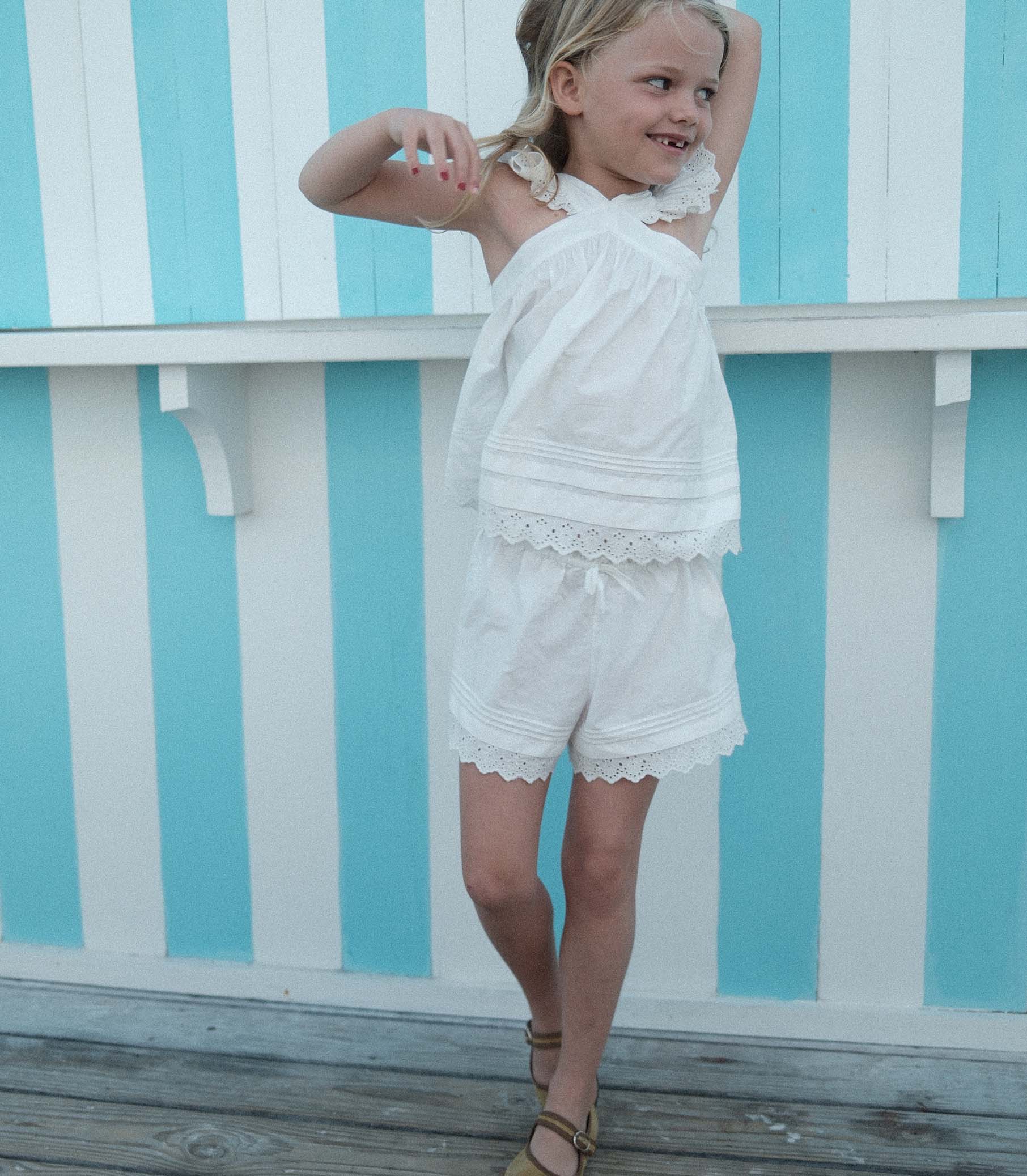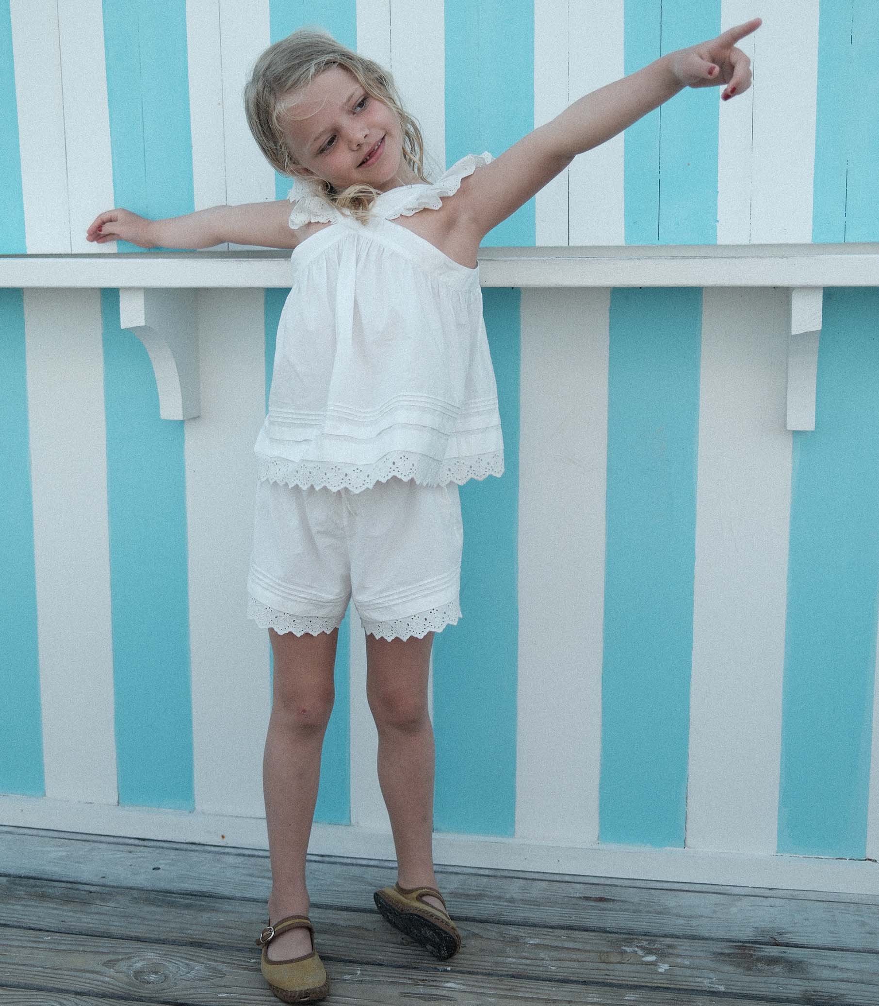 An easy pull-on short for littles, the Echo is crafted from crisp organic cotton poplin and features an elastic waistband framed with ruffles and a grosgrain ribbon tie. Delicate pintucks and embroidered scallop detailing accent the hems.