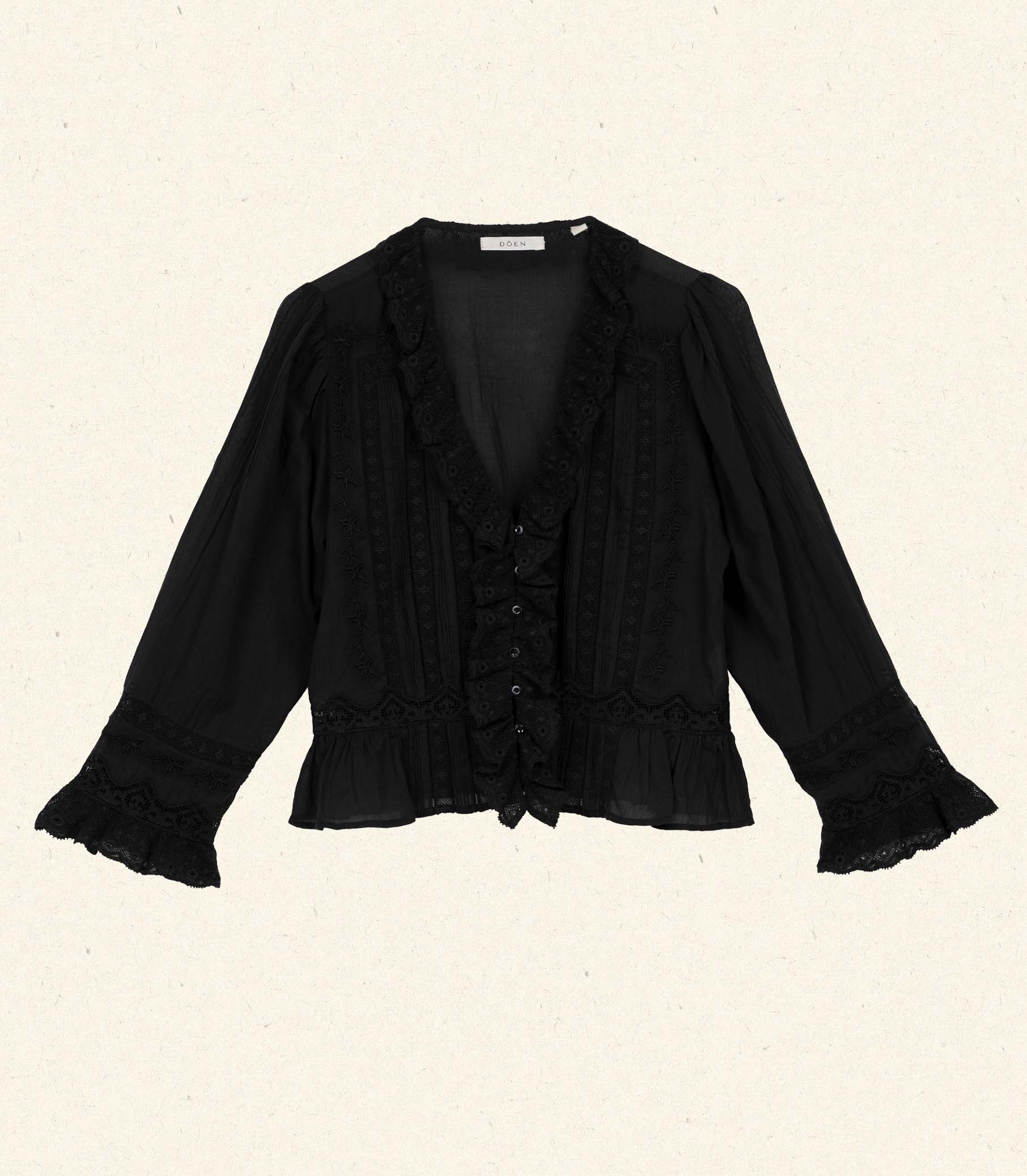 Crafted from the softest organic cotton voile, the Victorian-inspired Eldoris Top features a plunging V-neckline framed with cascading lace-trimmed ruffles that extend down the bodice and alternating panels of inset lace, clustered pintucks, and intricate embroidery at the yoke and back. A line of delicate buttons run down the front, while a cinched and slightly cropped waist finishes in a subtle peplum.