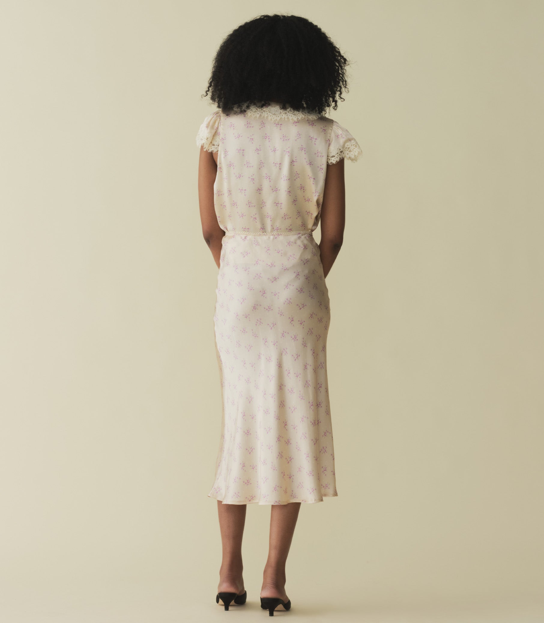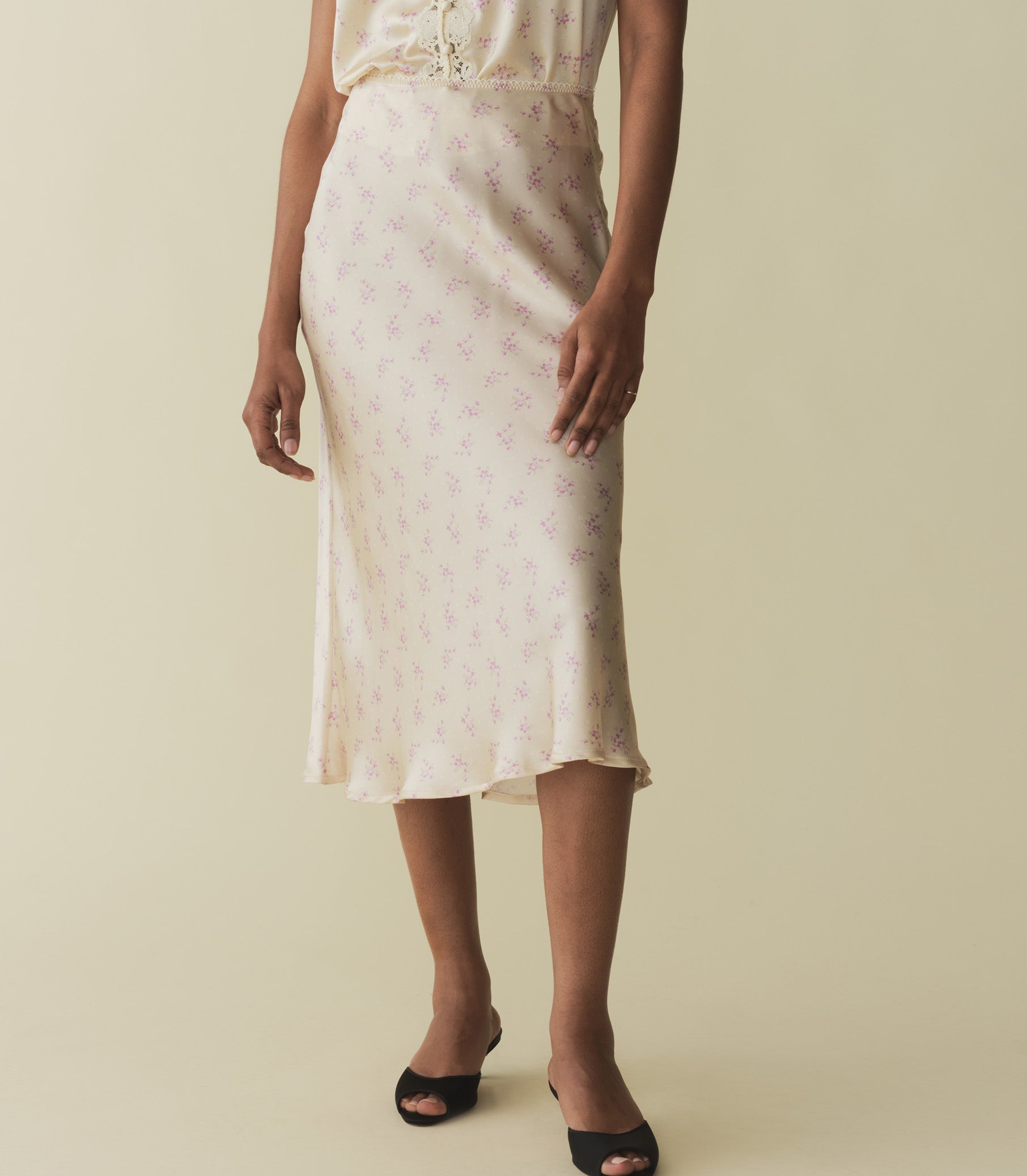 In a buttery silk satin, the Elowen Skirt is our take on a '90s-style slip skirt. Its high waist is trimmed in delicate scallop elastic, while a flowing, bias-cut skirt falls to mid-calf.