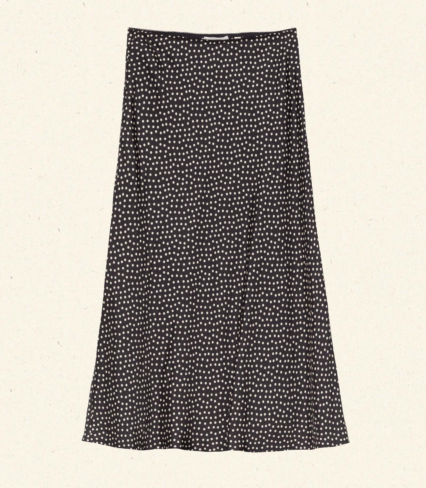 Crafted from a buttery silk-viscose twill and rendered in our nostalgic Camille Dot, the Elowena Skirt is a slightly shorter version of our beloved ‘90s-inspired Elowen Skirt. It features a high waist trimmed with elastic scallop detailing and a flowy bias-cut skirt that falls to mid-calf.