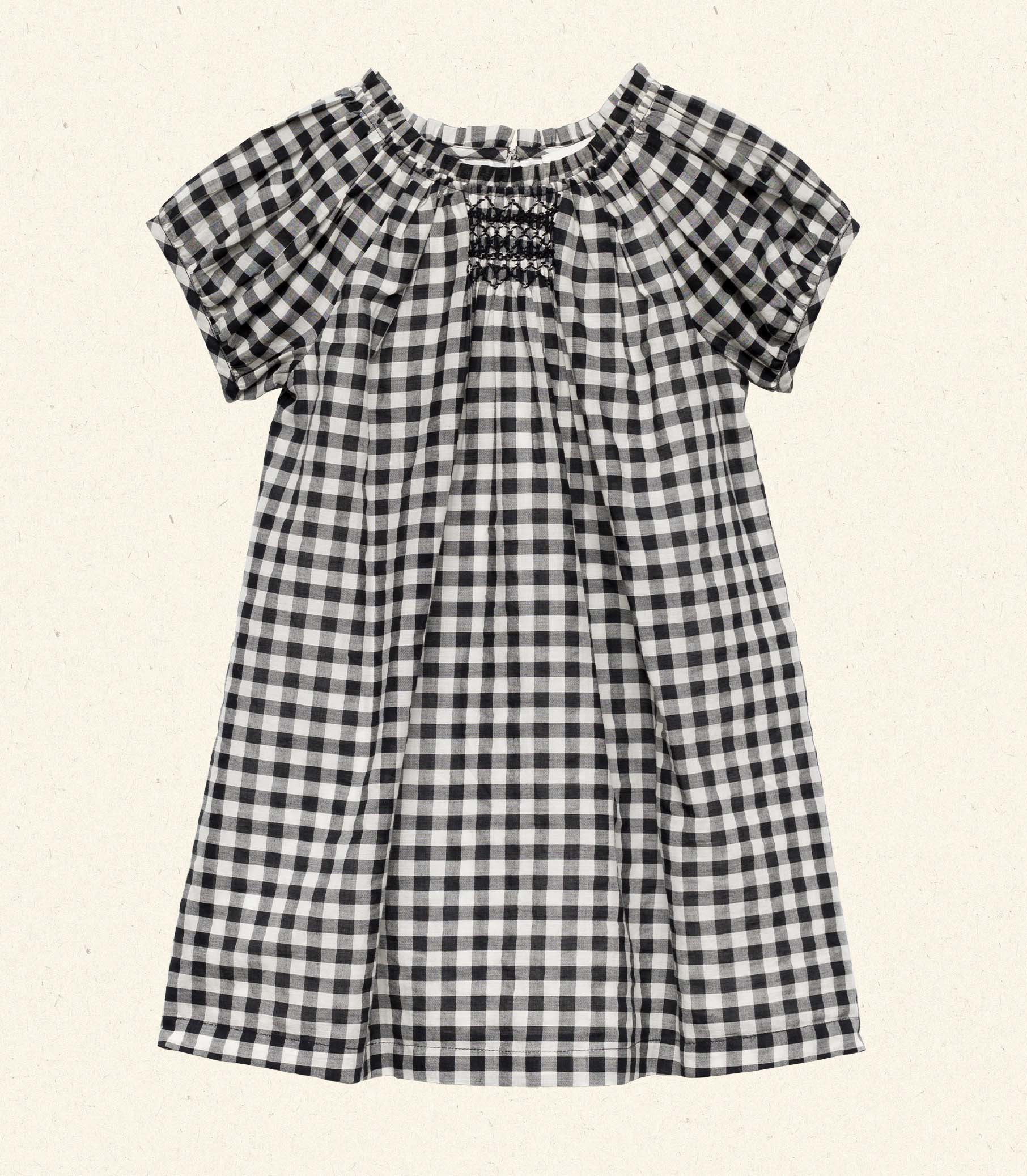 Crafted from a soft, lightweight organic cotton voile in our ‘50s-inspired Noir Greta Gingham, the Esa Dress is a fully lined dress with short puffed sleeves, hand-smocked details and a petite ruffle at the neckline, and a button-and-loop closure at the center back. A full skirt falls just above the knee.