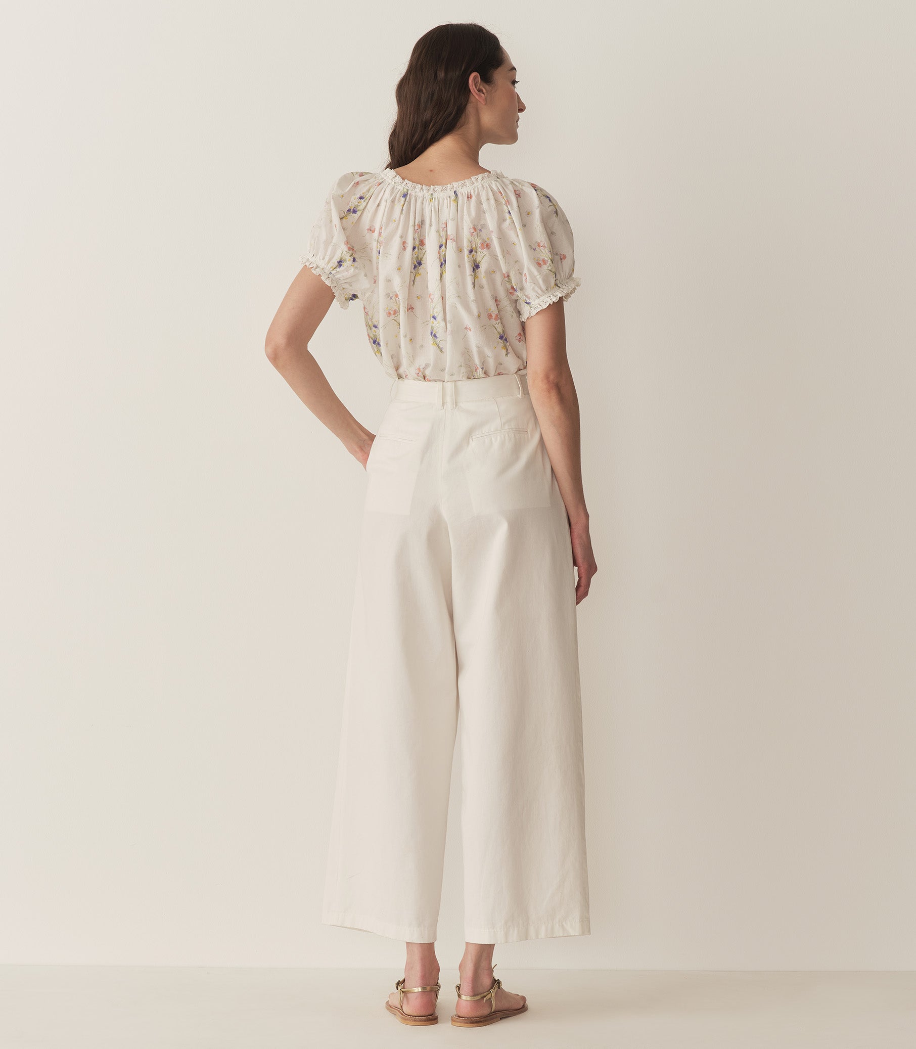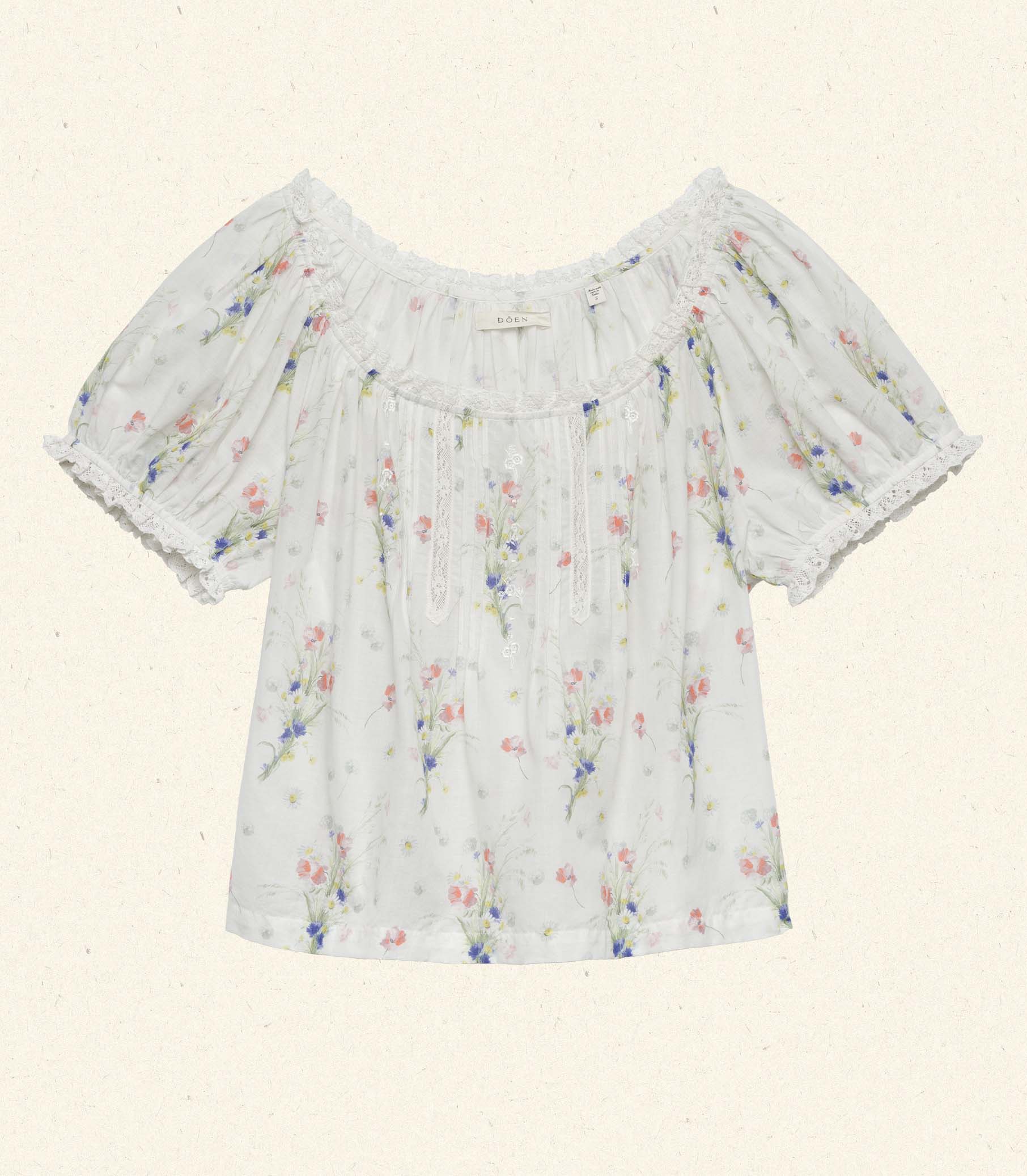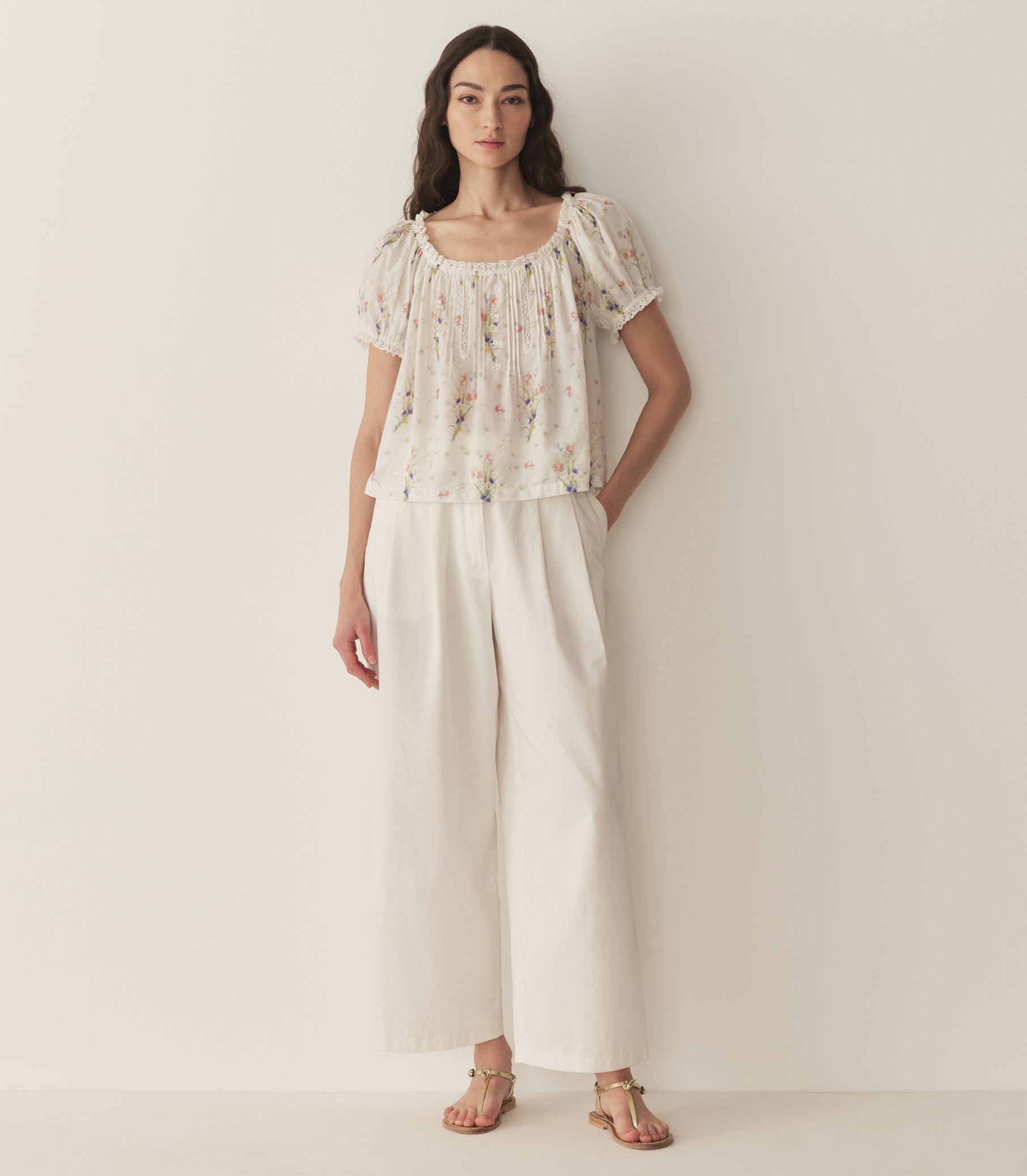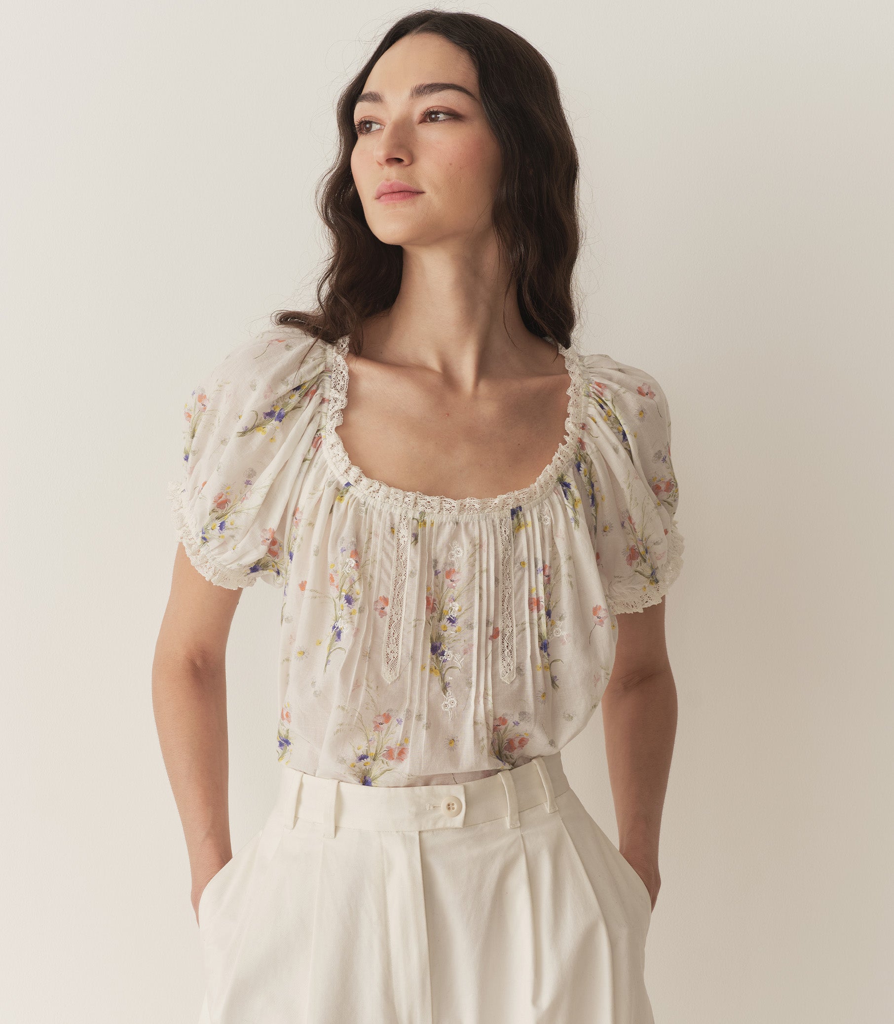In a soft, lightweight organic cotton voile, the Frederica Top features a breezy silhouette, round neckline, and short puffed sleeves trimmed with scalloped lace. Alternating pintuck clusters, intricate lace, and delicate floral embroidery decorate the front. Wear it loose, or tuck it into your favorite pair of high-waisted jeans.