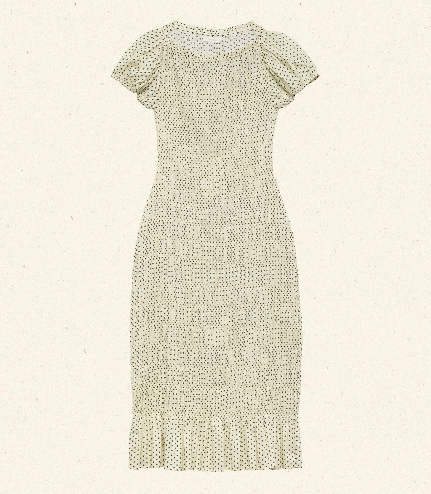 Crafted from a soft, lightweight organic cotton voile and rendered in our new Portia Dot, the Georgene Dress is a pullover style with a bateau neckline, short puffed sleeves, and allover elasticized smocking. A fitted silhouette gives way to an ankle-grazing skirt with a ruffle at the hem.