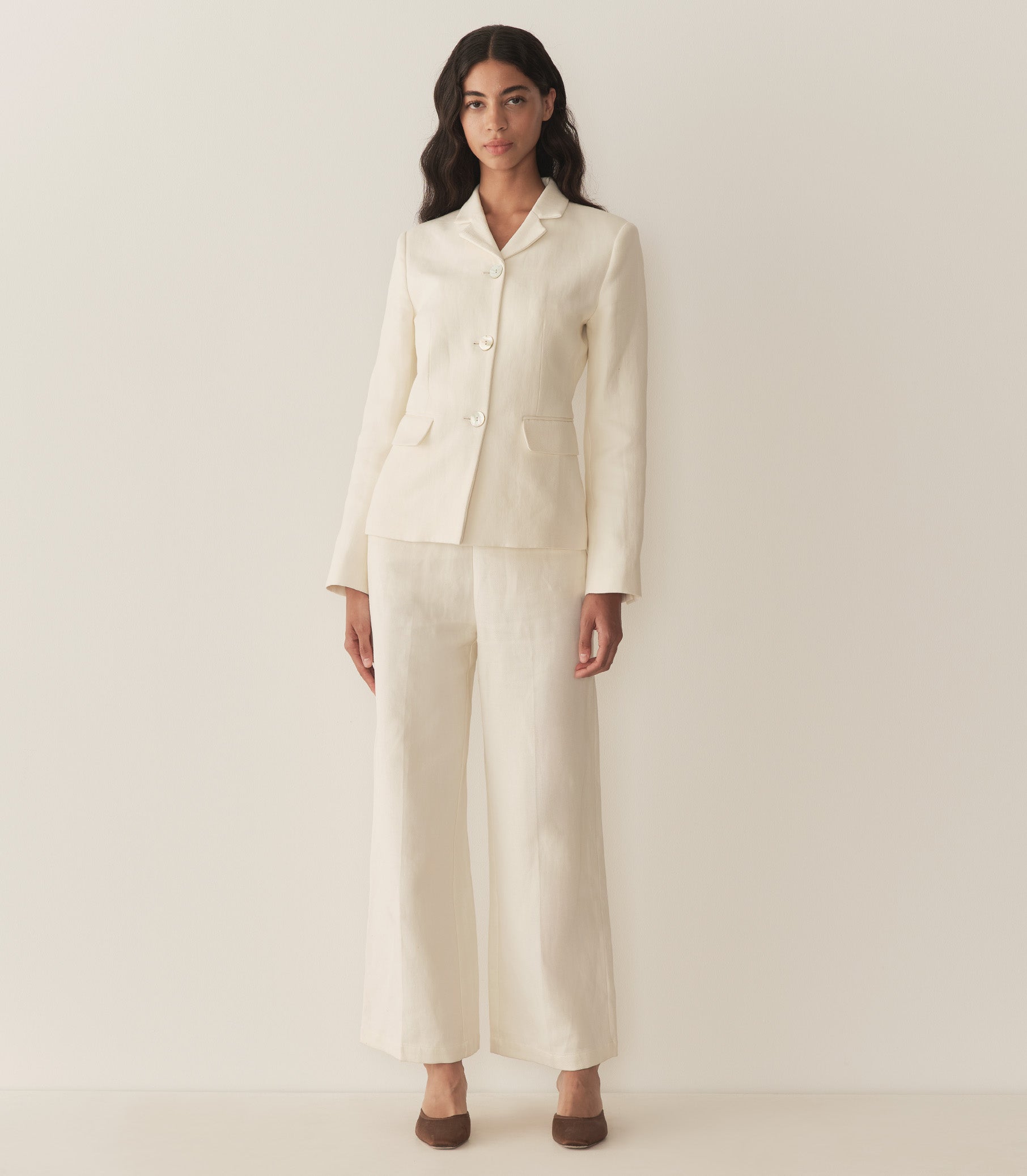 Reimagined for warmer days in a lightweight, organic cotton-linen twill, the DÔEN Heirloom Glenne Pant takes cues from ‘60s sailor pants. It features a high waist, a structured wide-leg, and welt pockets at the front, plus a single welt pocket at the back. The waistband is adorned with two fixed shell buttons, plus additional shell buttons that fasten at both sides. Our co-founder Katherine loves wearing with the ribbed Auguste or Ilaria Tops.