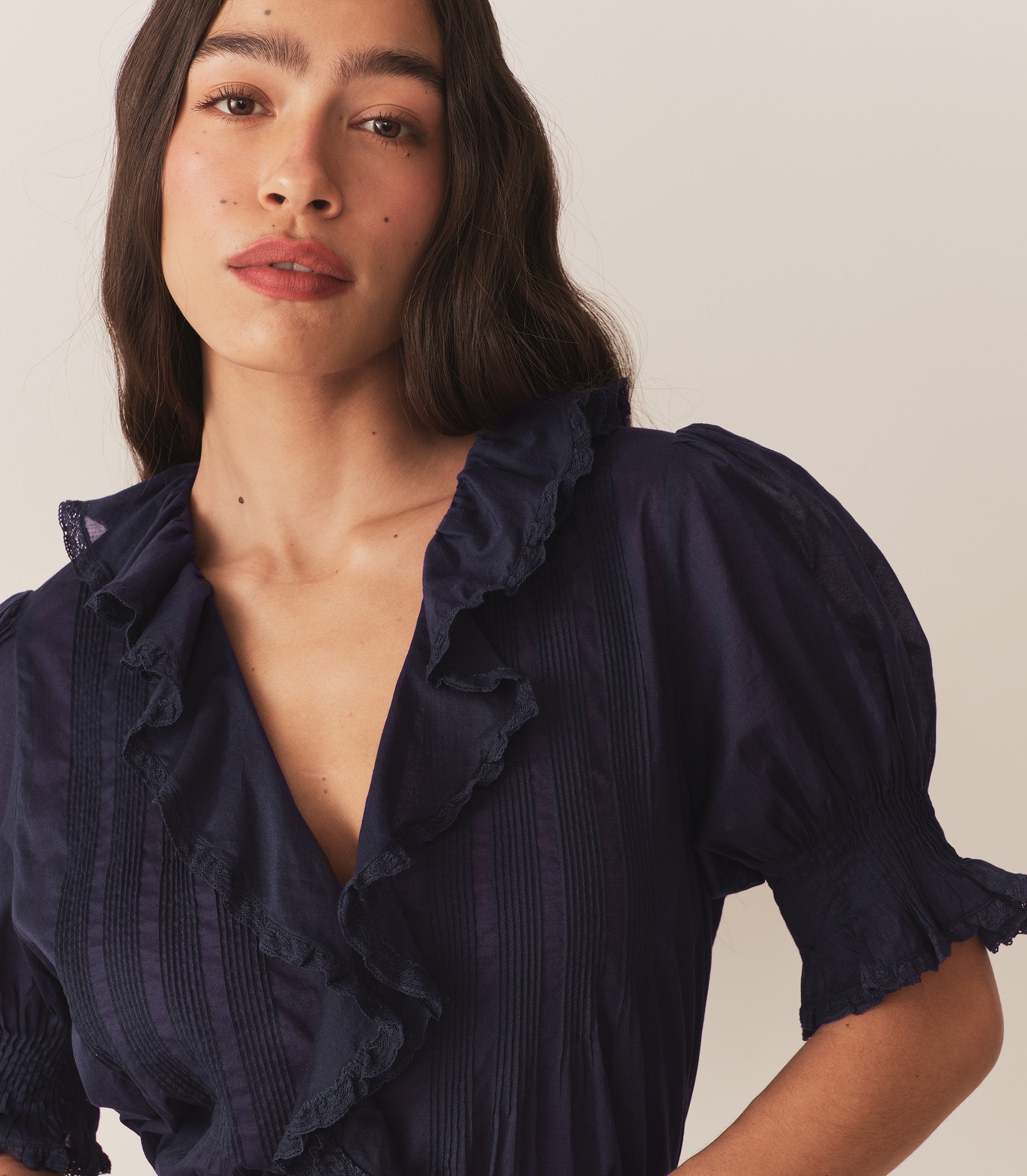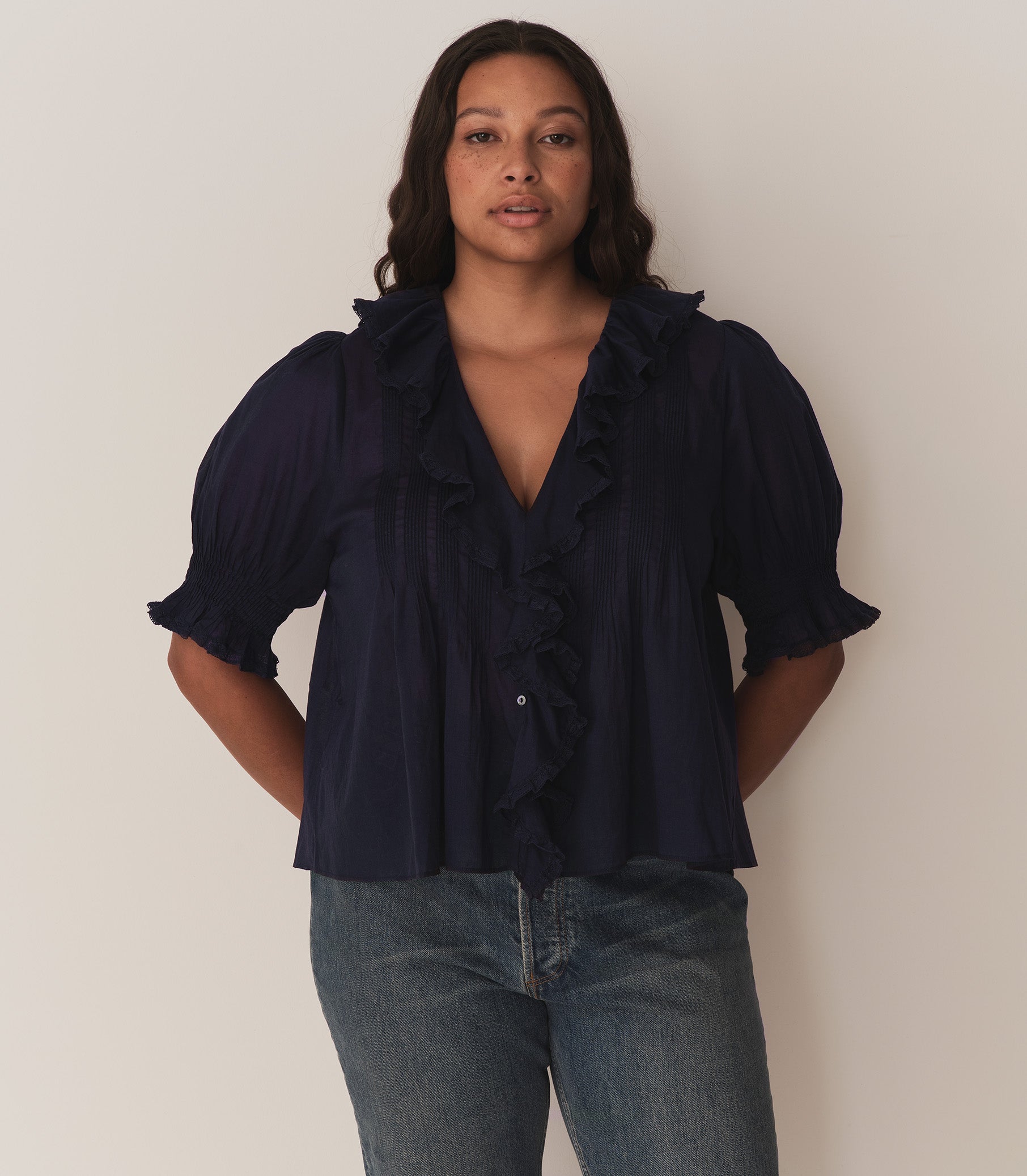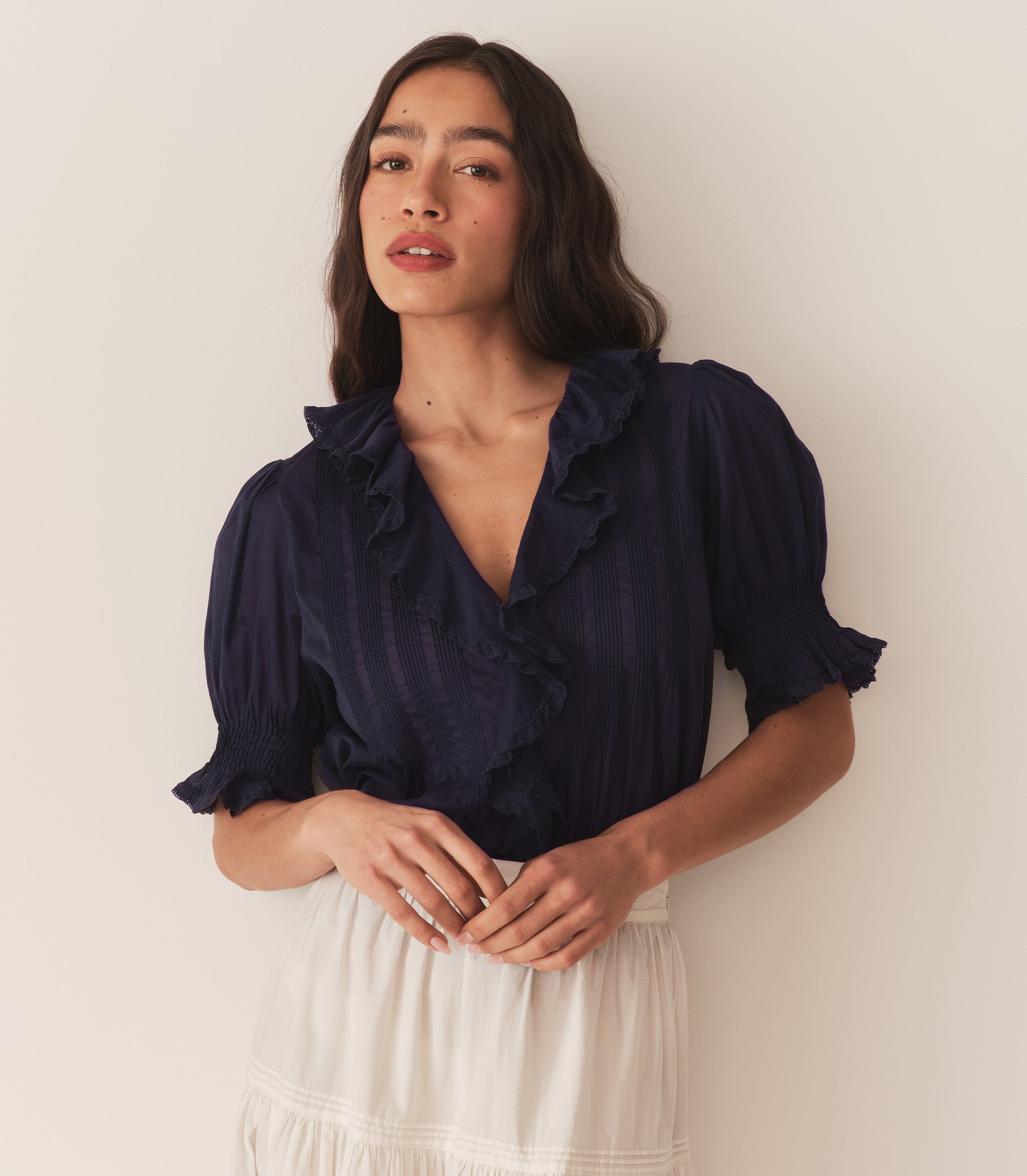 Crafted from the softest organic cotton voile, the Edwardian-inspired Henri Top—which made its debut in Spring 2018—is a Favorite Character we find ourselves returning to again and again. It features a plunging V-neckline framed with cascading lace-trimmed ruffles that extend down the bodice and delicate clustered pintucks at the yoke, back, and short puffed sleeves. A line of hidden starburst buttons run up the center front.