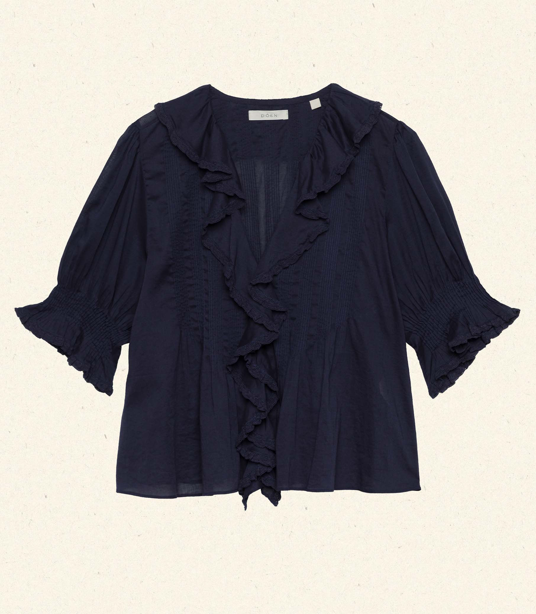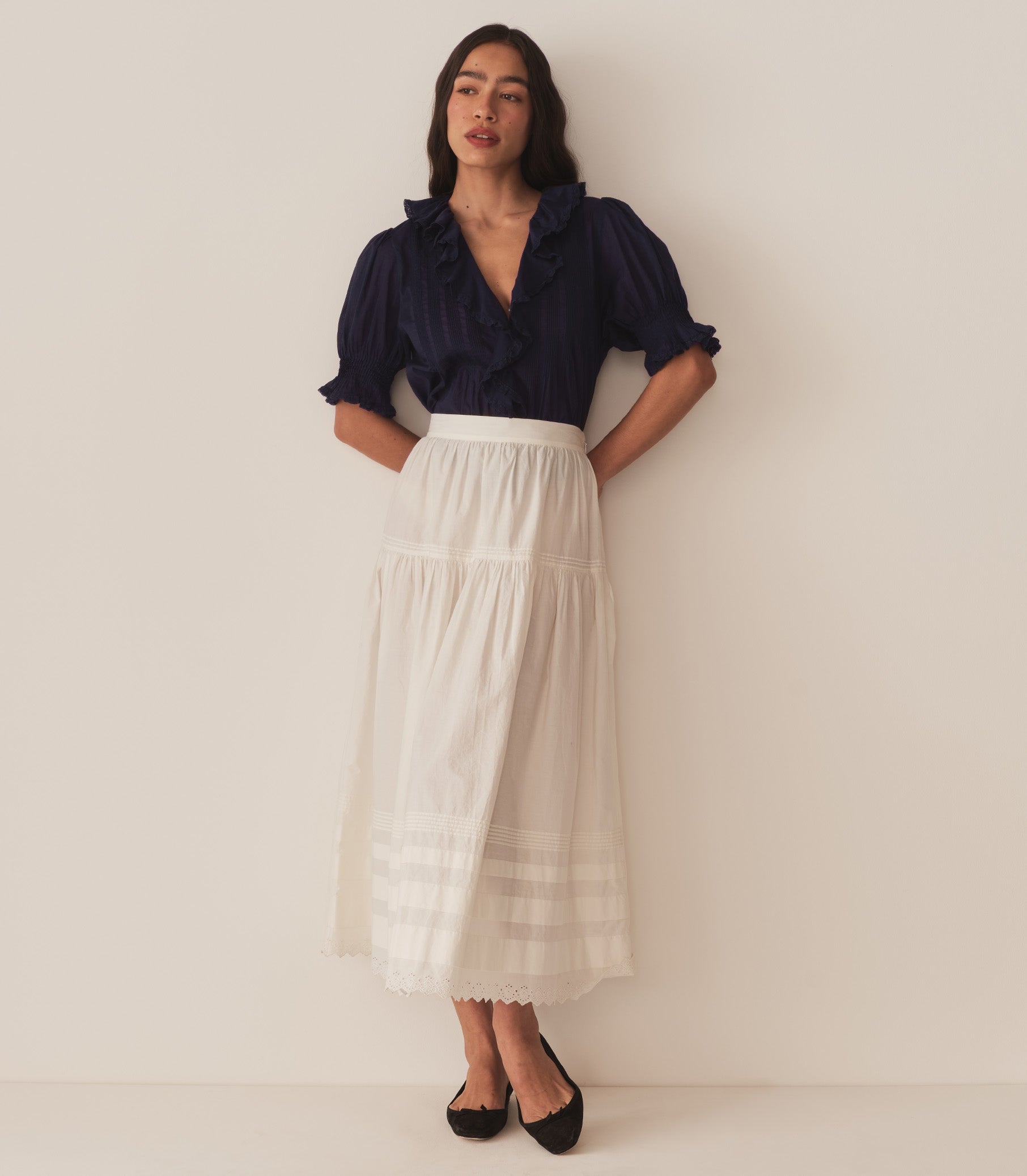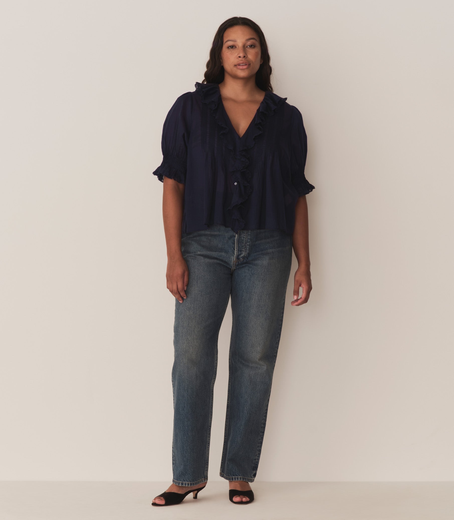 Crafted from the softest organic cotton voile, the Edwardian-inspired Henri Top—which made its debut in Spring 2018—is a Favorite Character we find ourselves returning to again and again. It features a plunging V-neckline framed with cascading lace-trimmed ruffles that extend down the bodice and delicate clustered pintucks at the yoke, back, and short puffed sleeves. A line of hidden starburst buttons run up the center front.