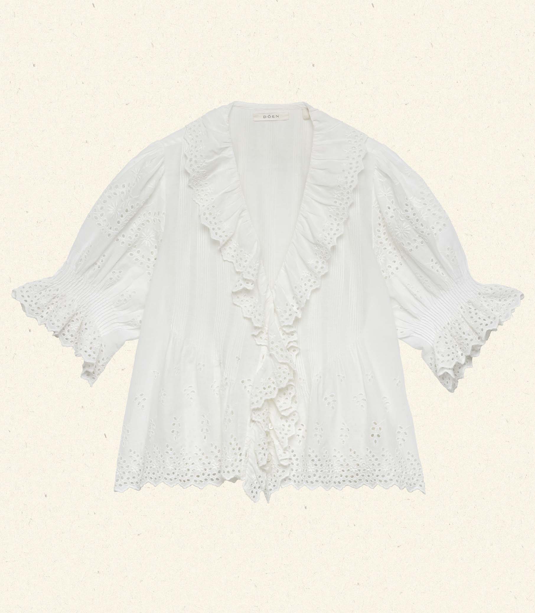 The Edwardian-inspired Henri Top—which made its debut in Spring 2018—is a Favorite Character we find ourselves returning to again and again. Crafted from soft organic cotton voile and detailed with eyelet, it features a plunging V-neckline framed with cascading lace-trimmed ruffles that extend down the bodice and delicate clustered pintucks at the yoke, back, and short puffed sleeves. A line of hidden starburst buttons run up the center front.