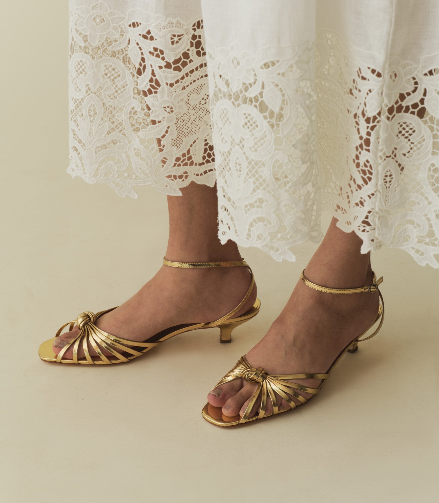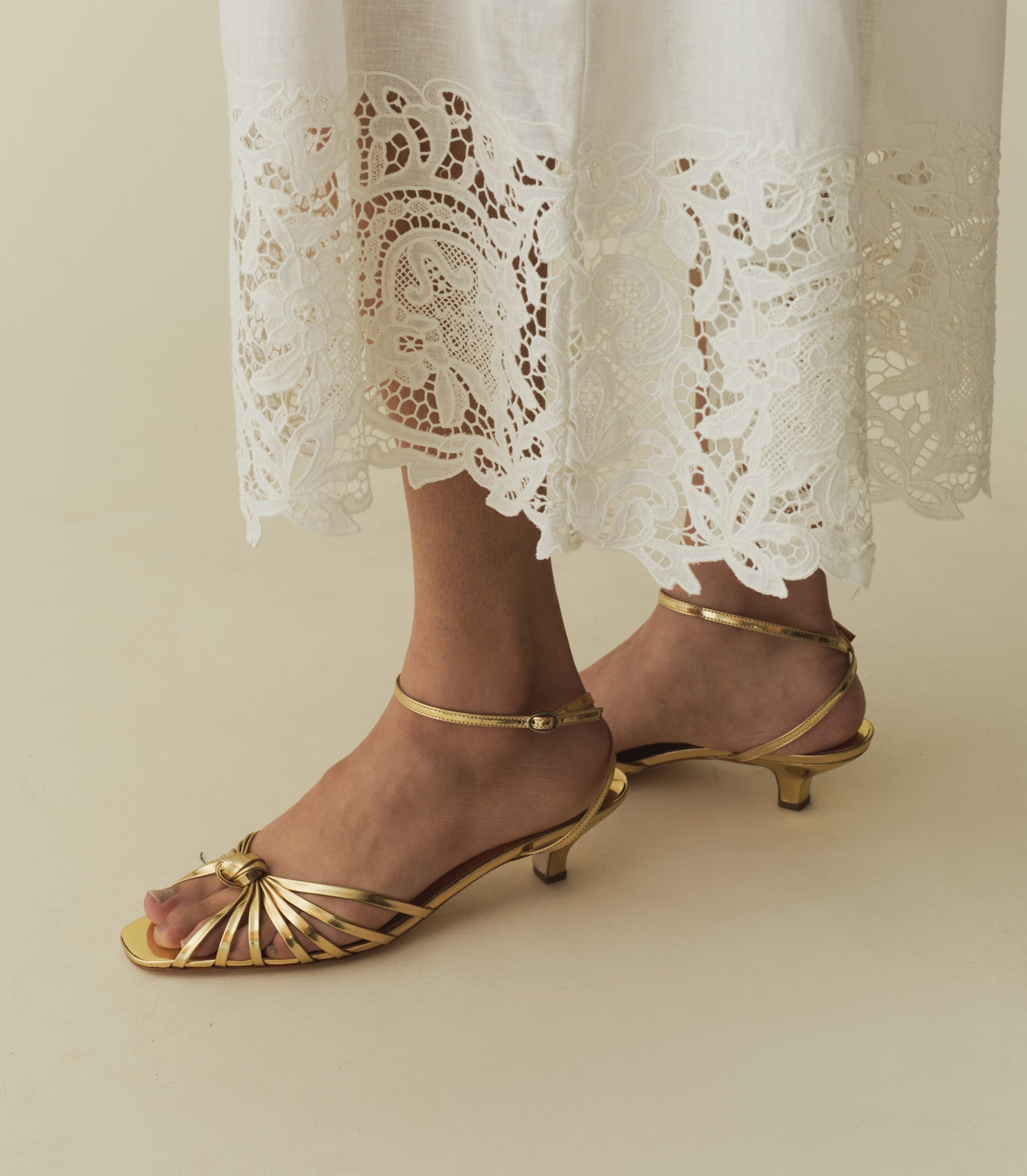 Crafted from gold foil metallic leather, the disco-inspired Hepburn Heel is a statement shoe that’s easily dressed up or down. It features a soft leather lining, a low kitten heel, an adjustable ankle strap with a petite buckle, and a knotted strap detail across the toe.