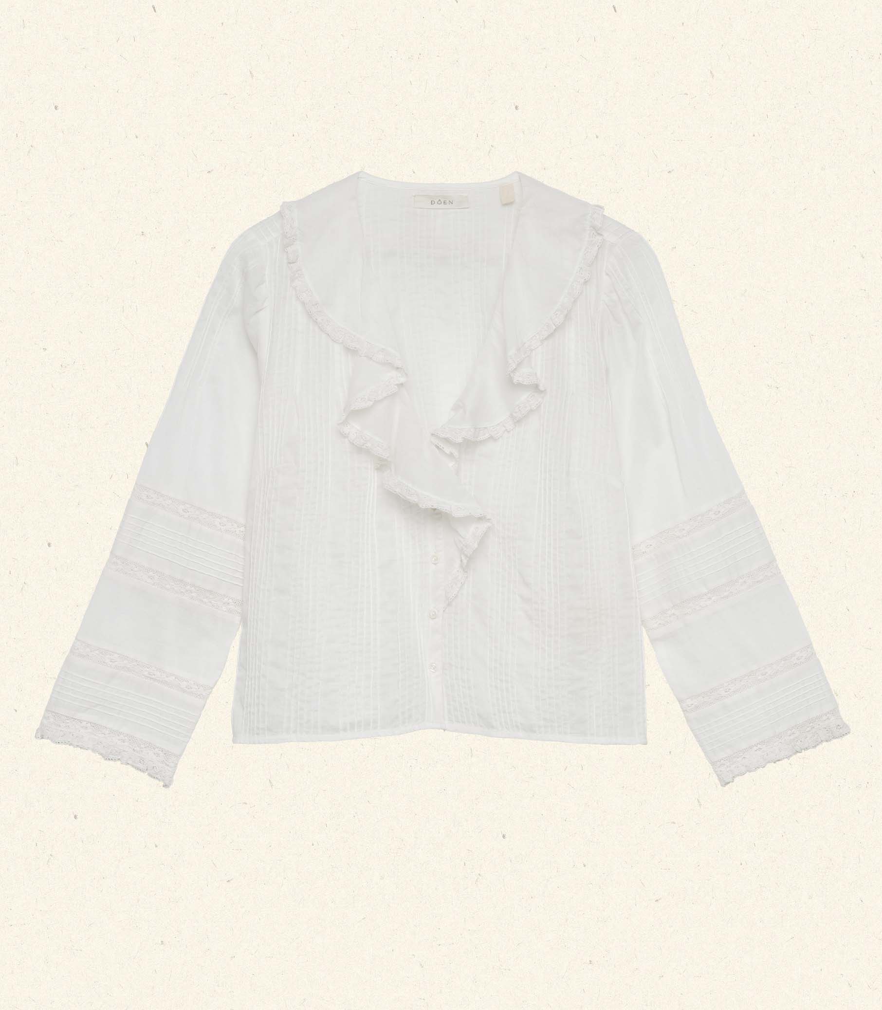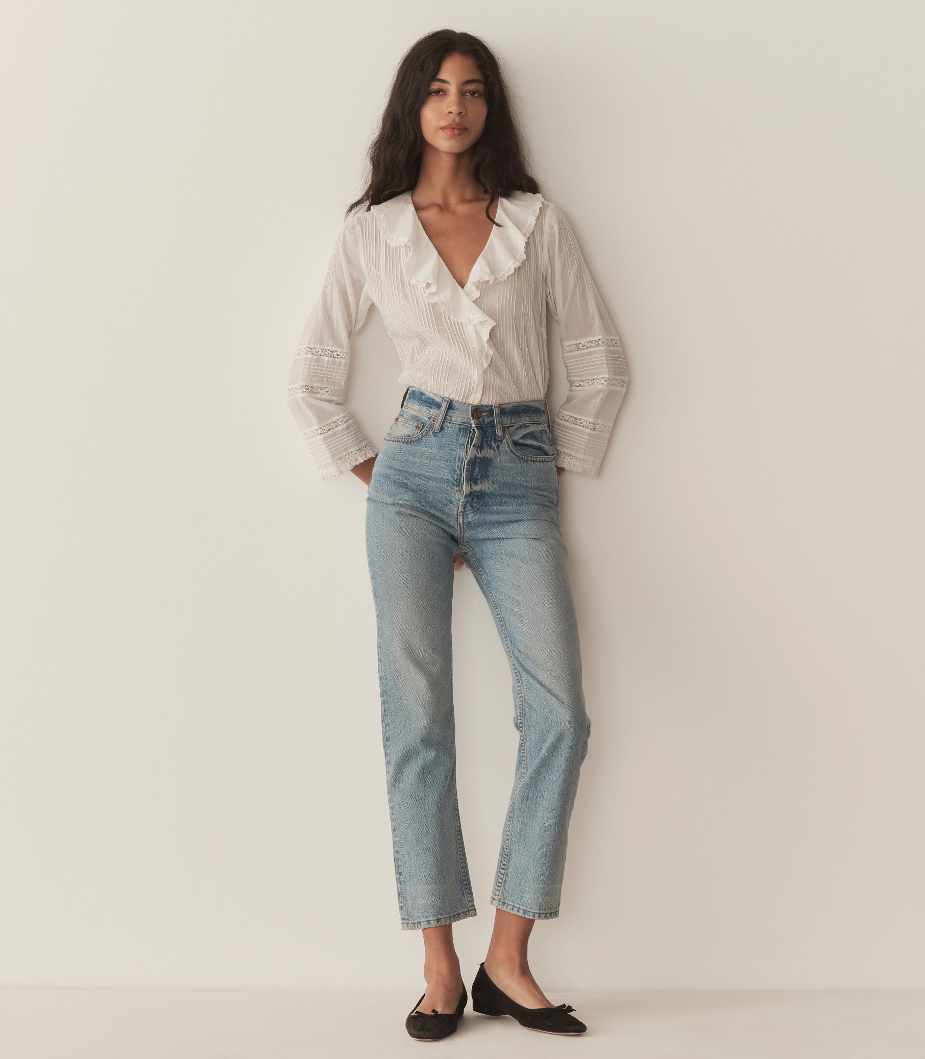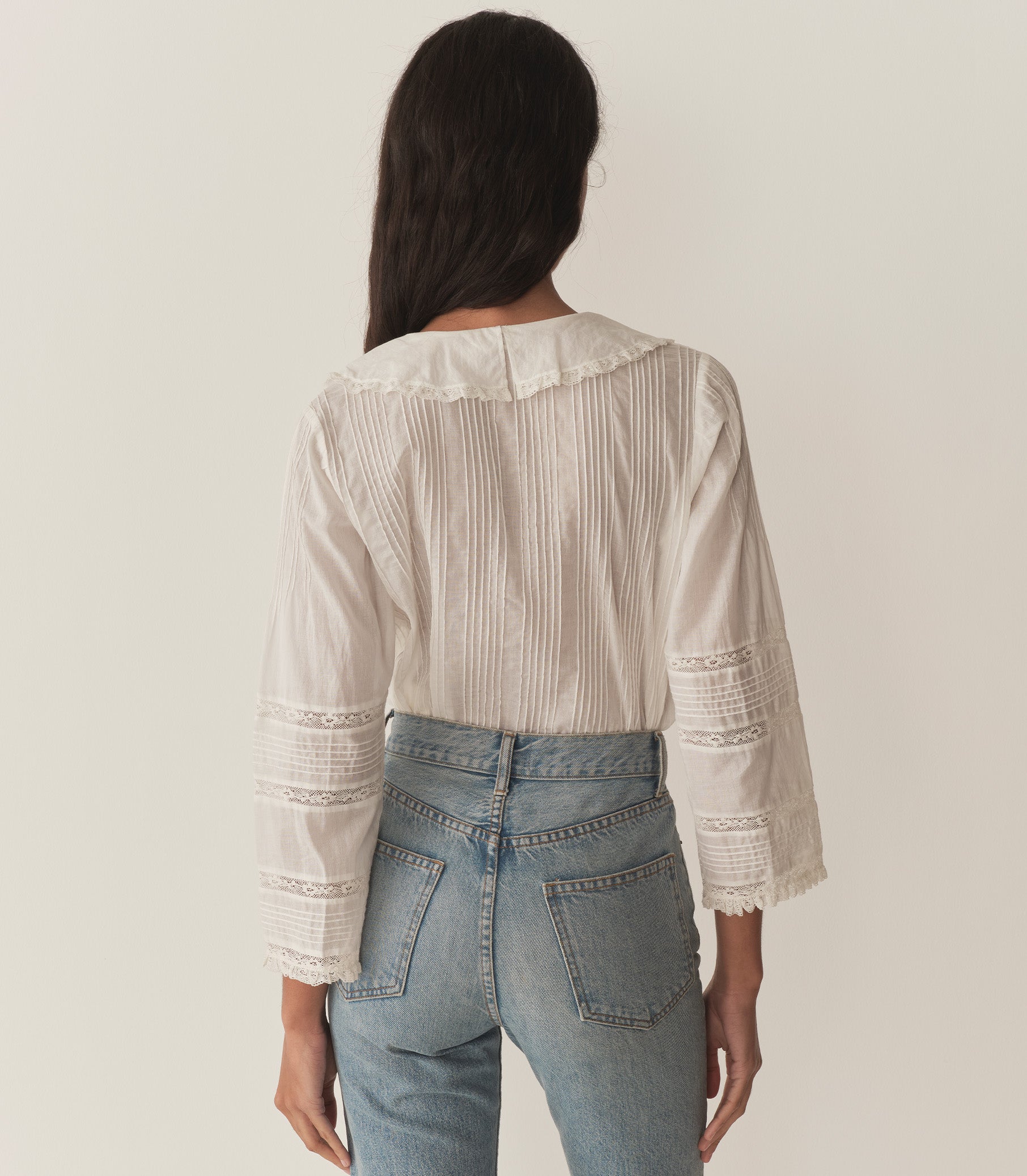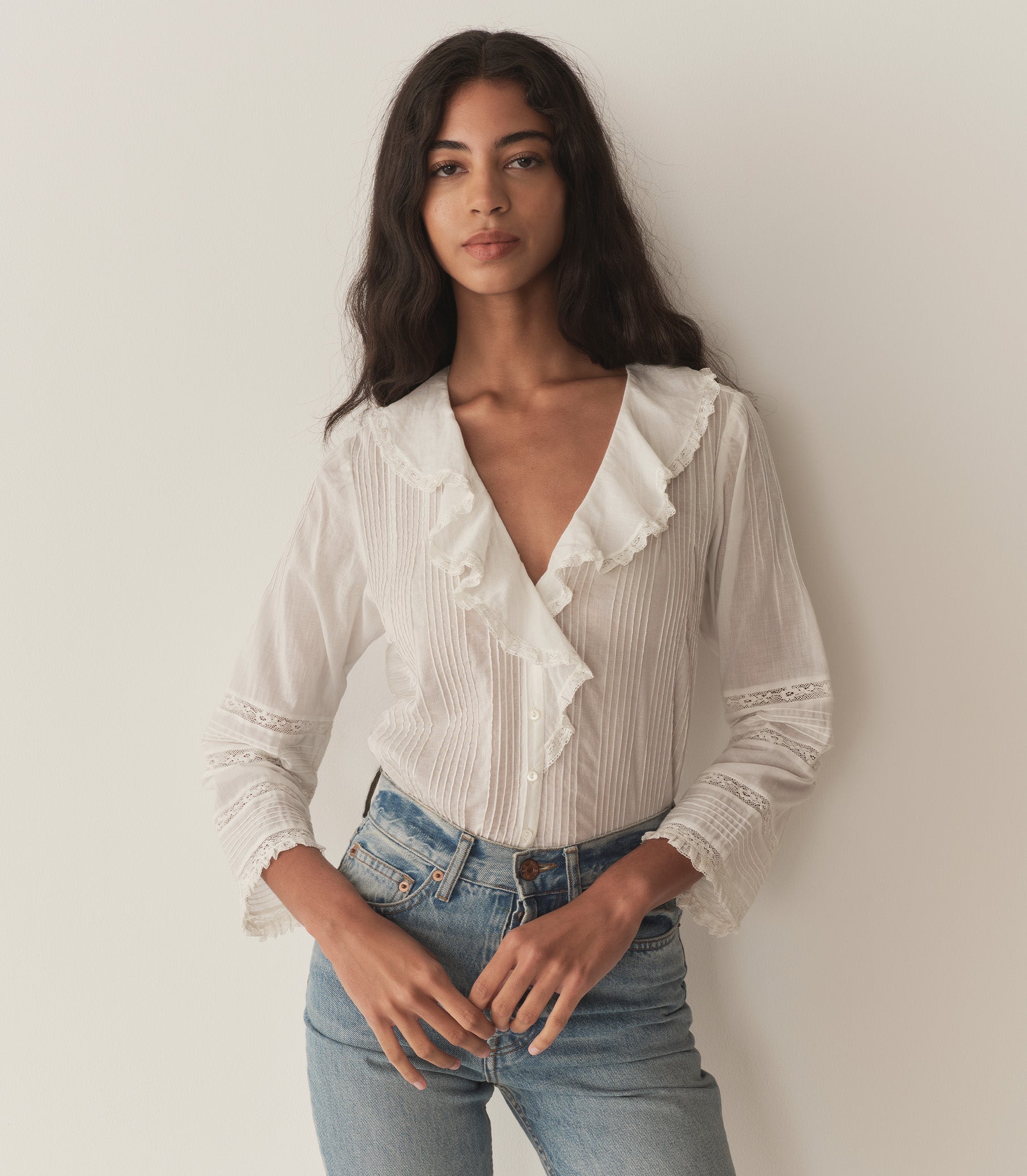 Crafted from the softest organic cotton voile, our new Victorian-inspired Huguette Top takes cues from our beloved Hardy Top, featuring a plunging V-neckline framed with cascading lace-trimmed ruffles and delicate clustered pintucks at the yoke, back, and shoulders. Intricate floral lace insets detail the collar and sleeves, and a line of hidden starburst buttons run up the center front.