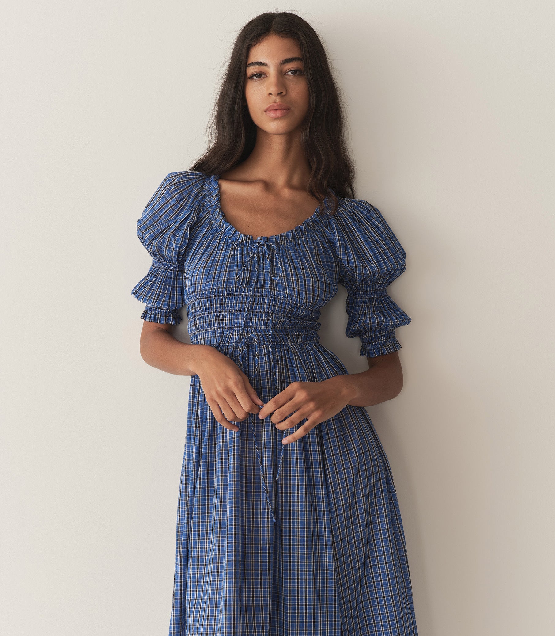 In the softest organic cotton voile, our beloved Ischia Dress—a Favorite Character that first made its debut in Spring 2021—is refreshed in our vintage workwear-inspired Cassis Check, featuring double-puffed sleeves and a scoop neckline adorned with petite ruffles and a functional center tie. A smocked bodice with an adjustable waist tie gives way to an ankle-grazing A-line skirt