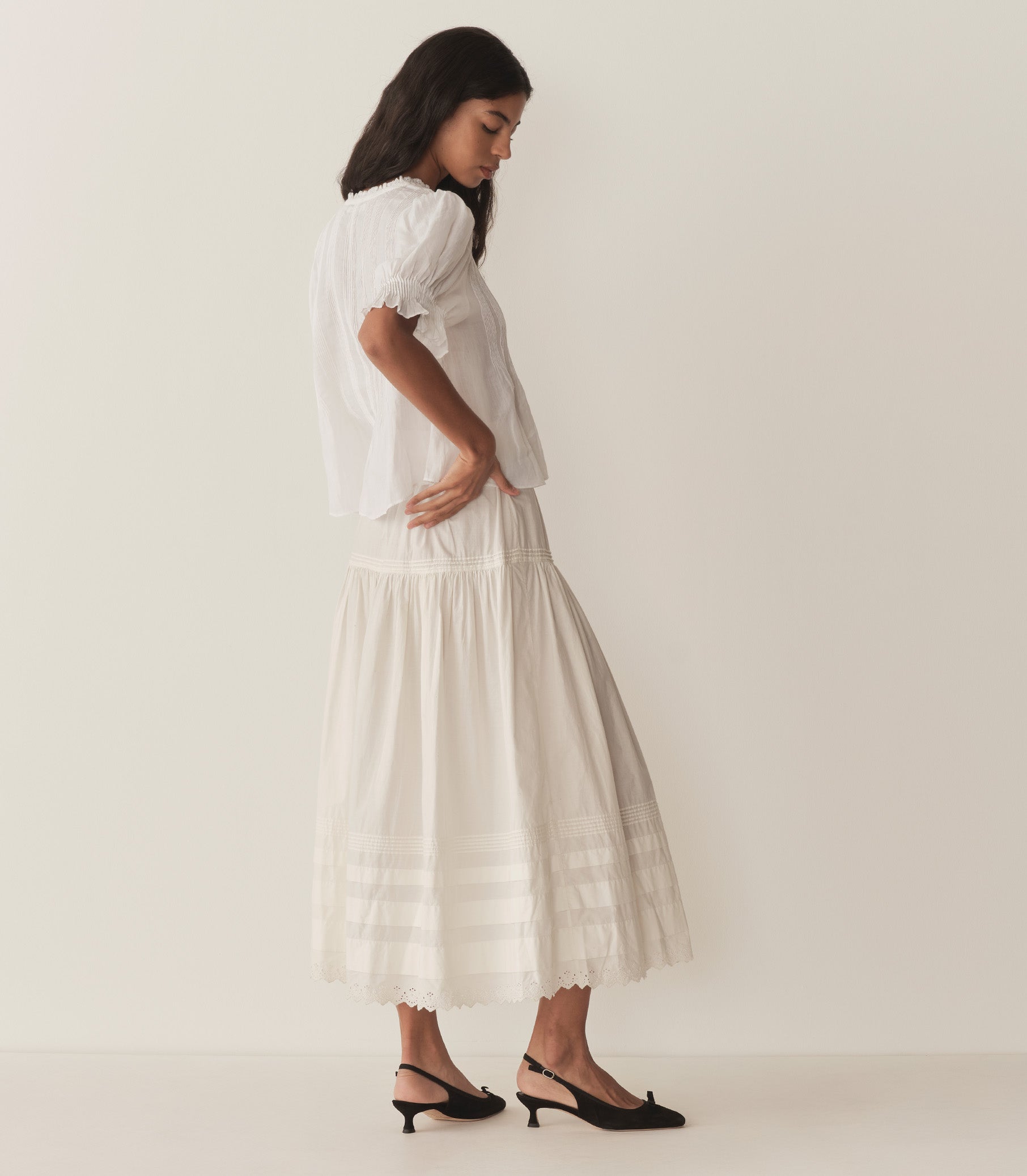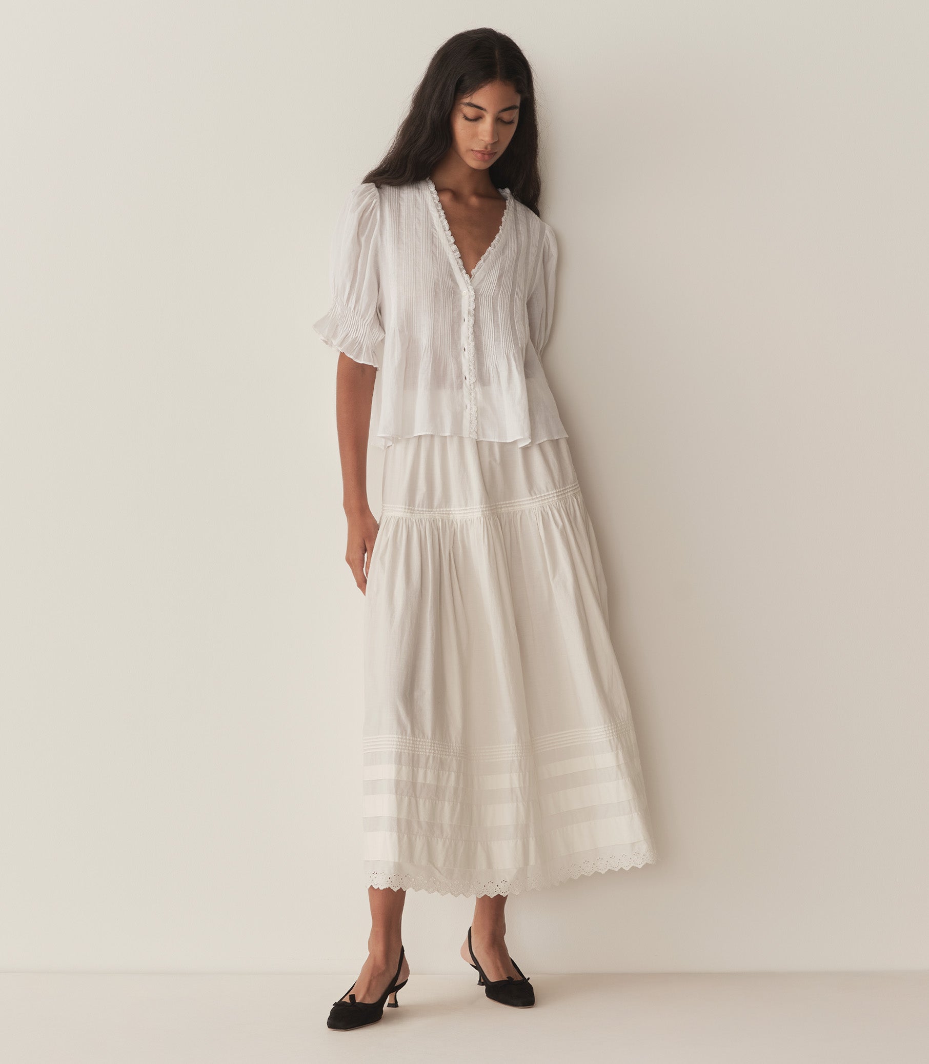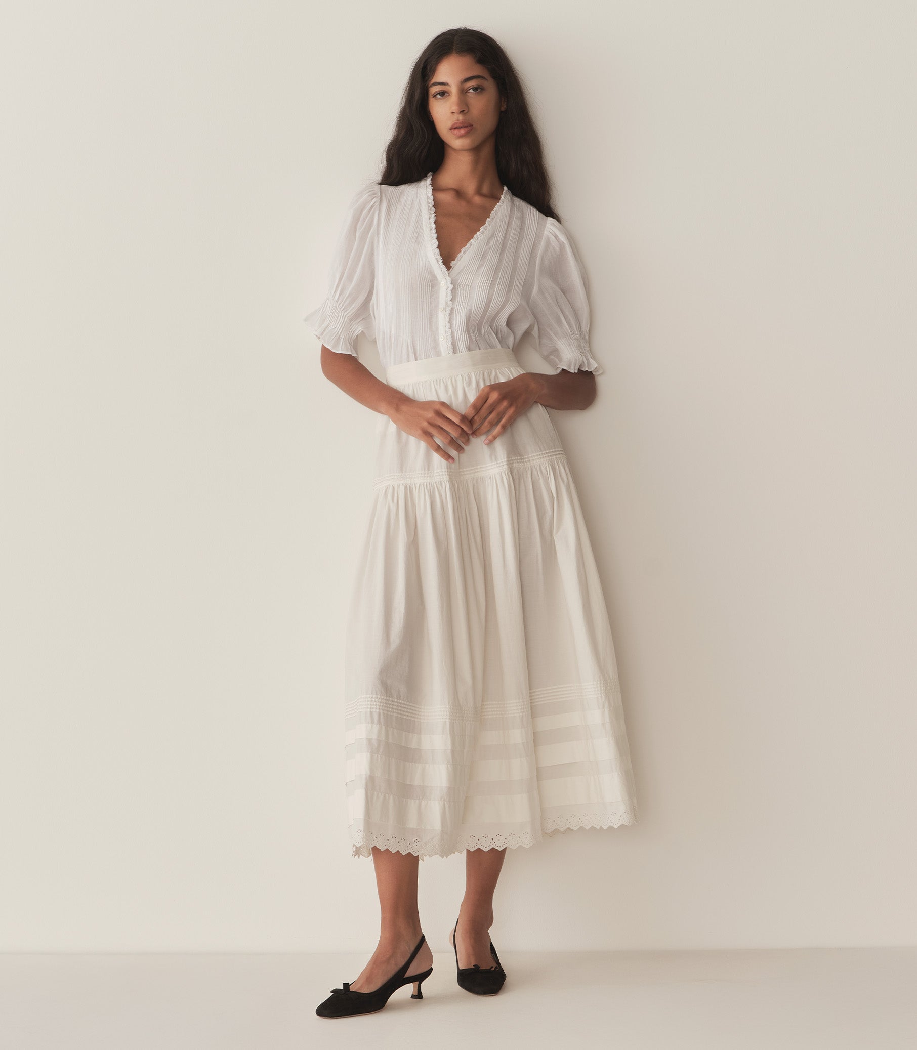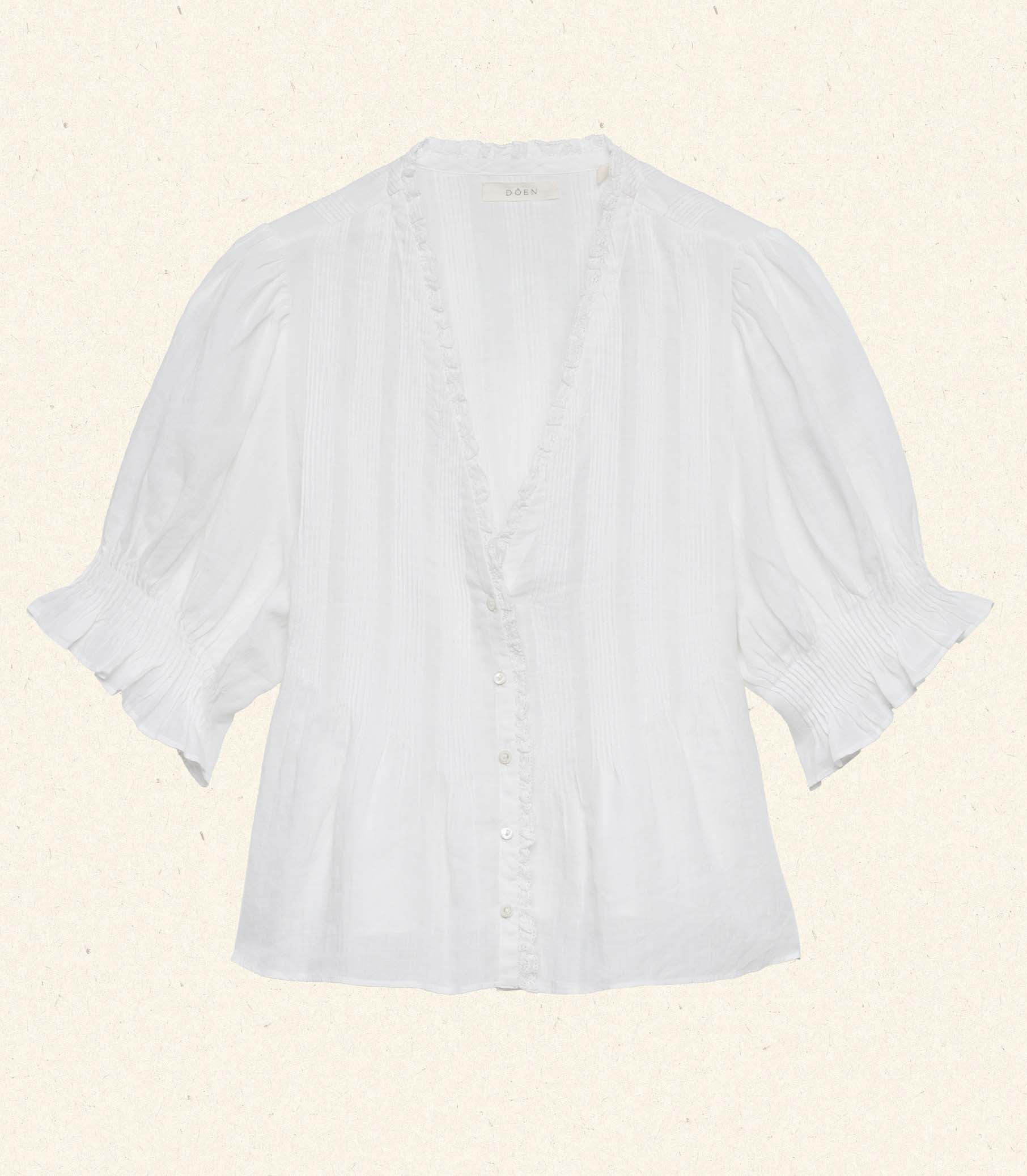 Crafted from a diaphanous ramie, the Edwardian-inspired Karlie Top features a plunging V-neckline adorned with ruffles and delicate clustered pintucks at the yoke, back, and short puffed sleeves. A line of starburst buttons runs up the center front. Wear it loose, or tuck it into your favorite high-waisted jeans.