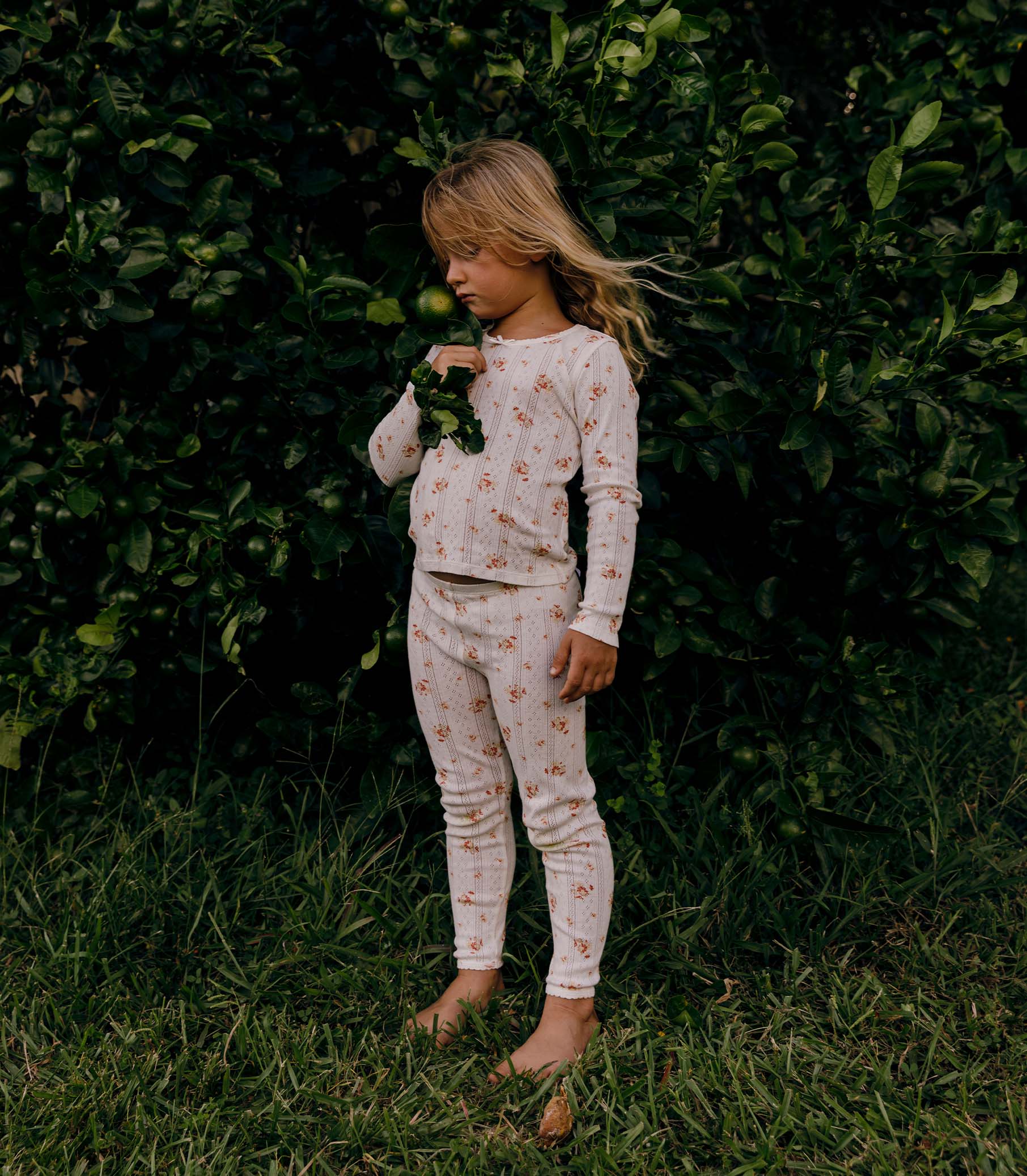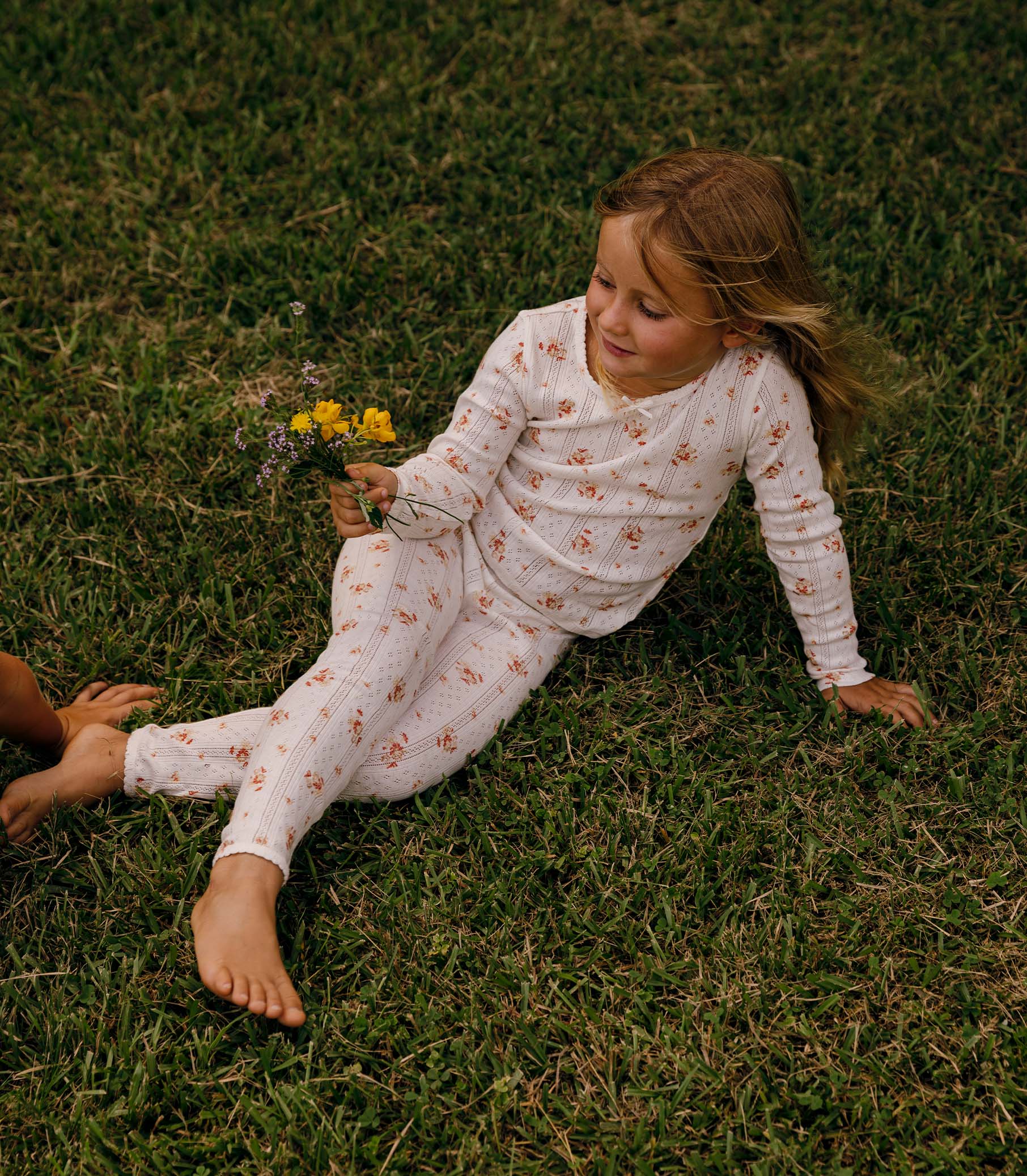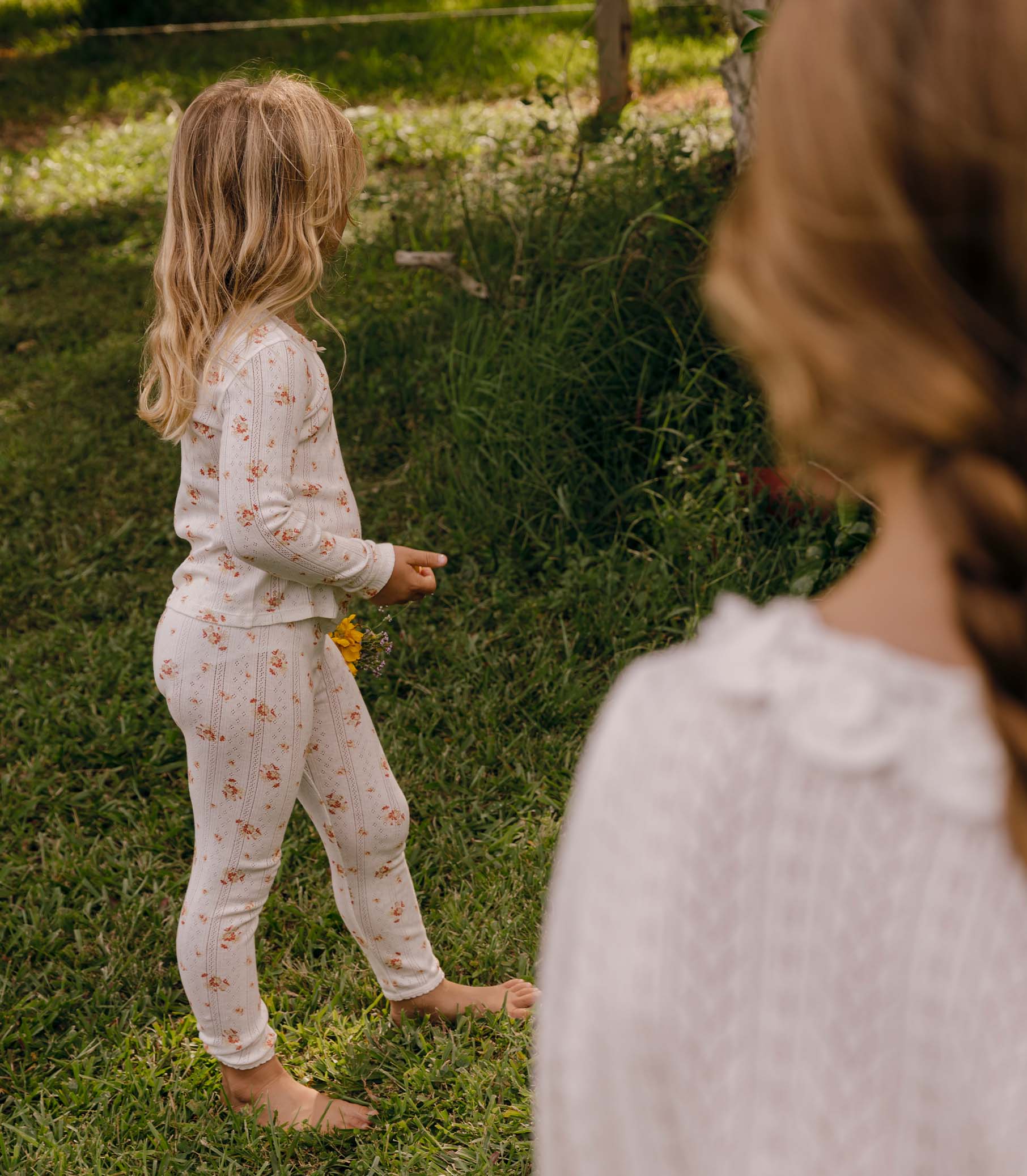 In the softest organic cotton pointelle adorned with our playful French Marigold, the Lajou Pant is a cozy staple for littles. With an elastic waist and scallop detailing at the hem, it’s a go-to equally suited for morning cuddles and all-day play. Pair it with our Octave Tee to make the sweetest set.