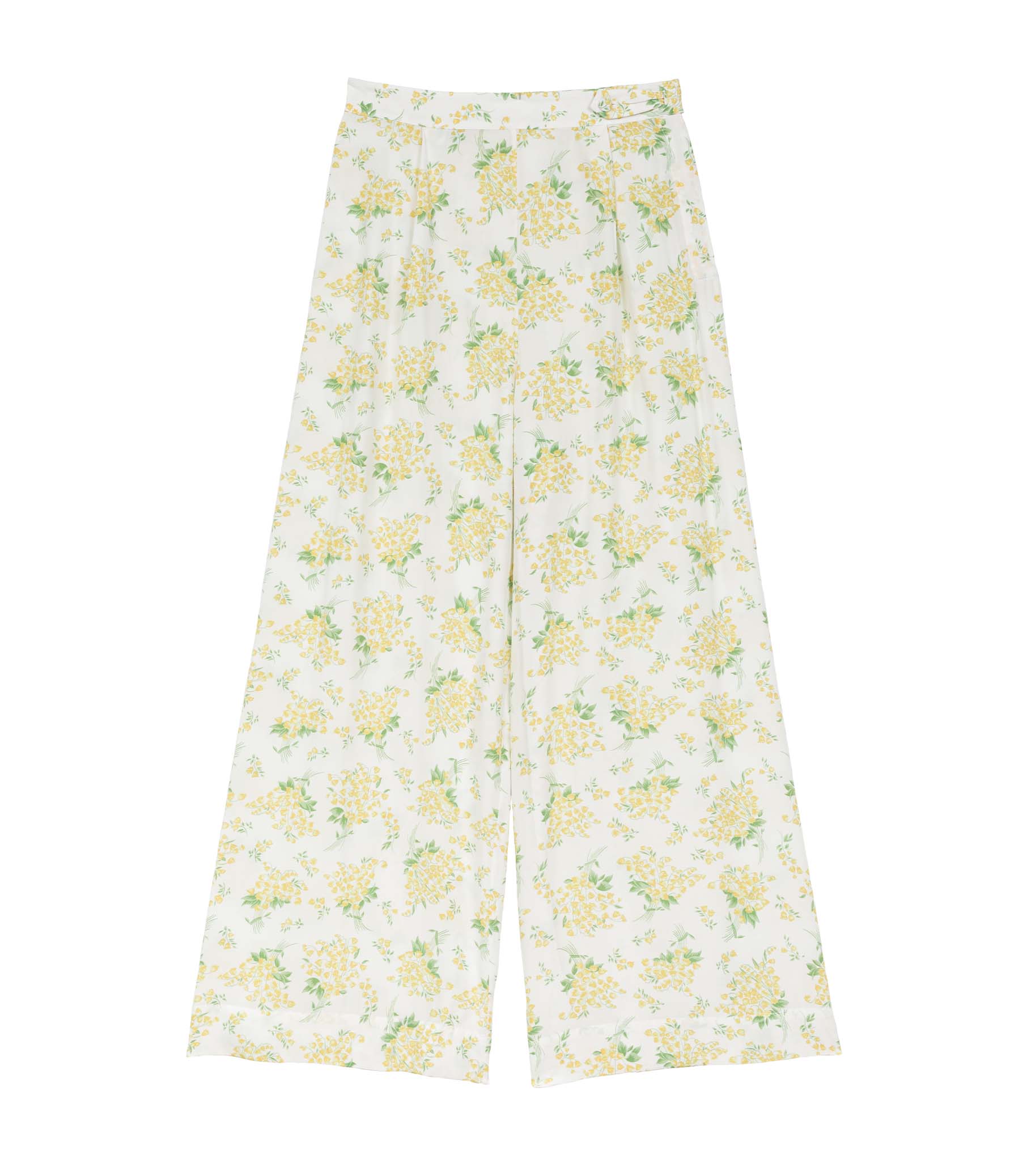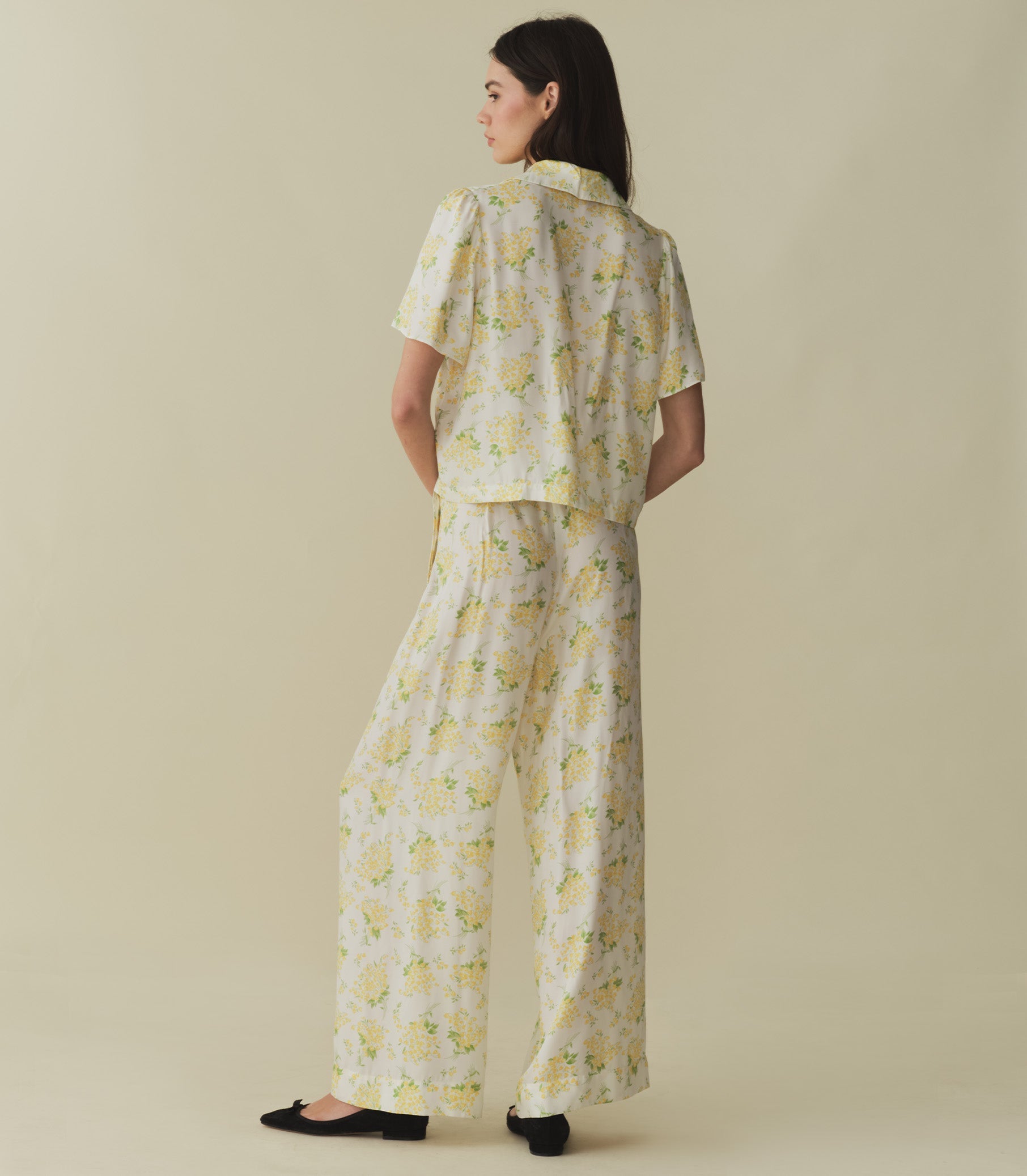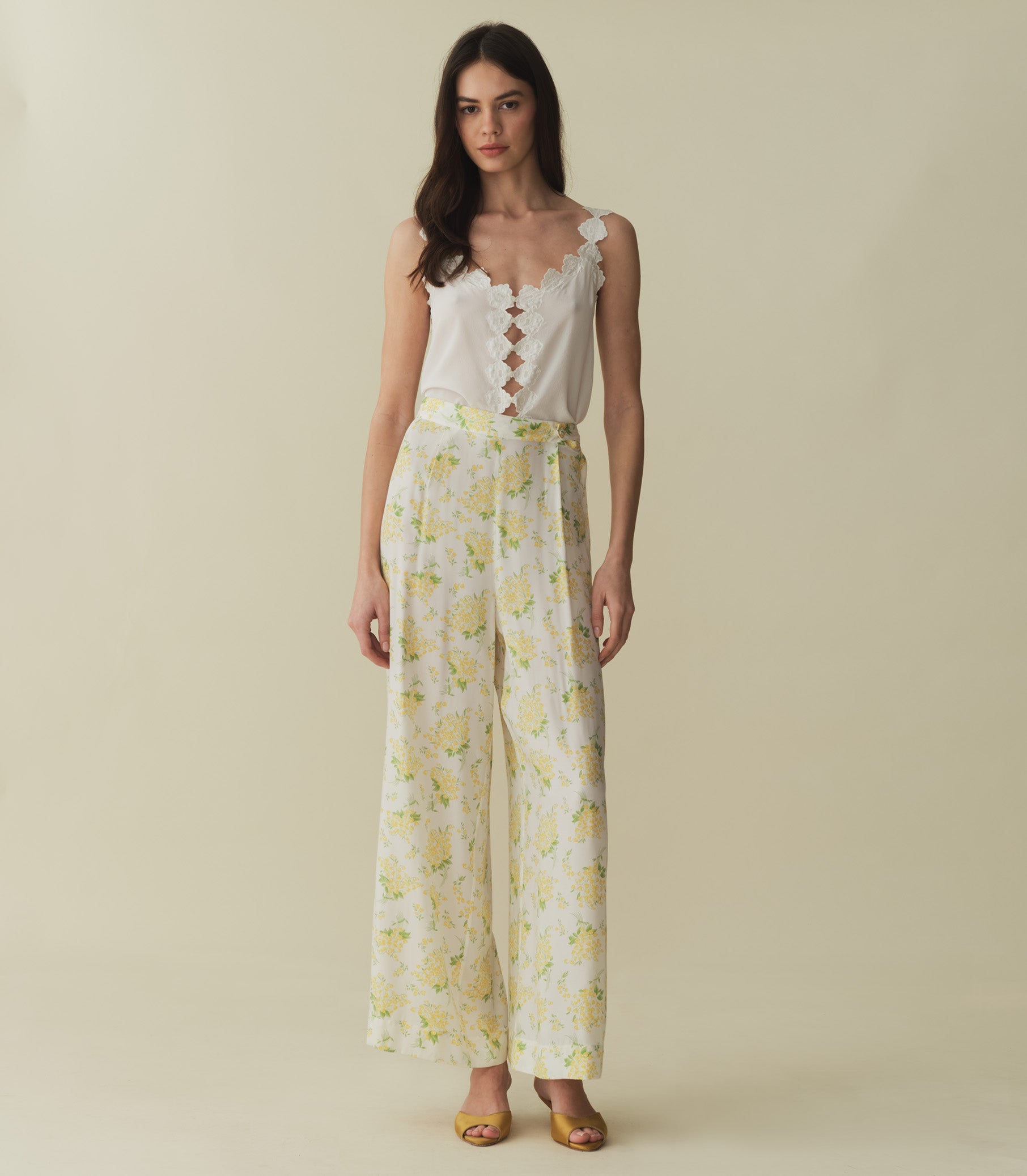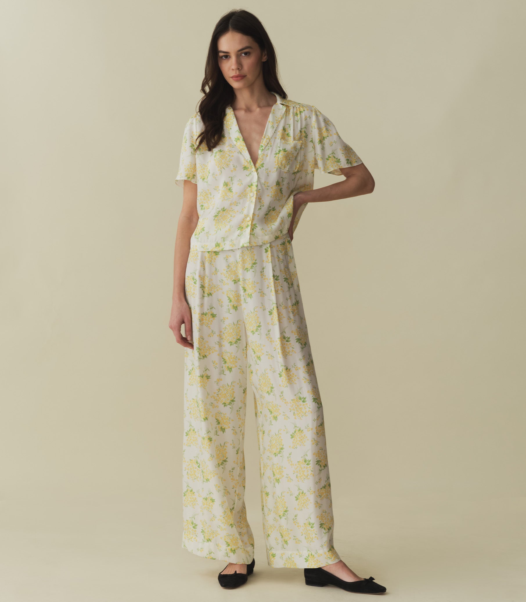 In a swingy blend of silk and viscose, the Lani Pant draws inspiration from the silhouettes of ‘30s loungewear. Pleats add structure to the center front, while a waistband tab detail with a button and hidden snap adds vintage-inspired charm.