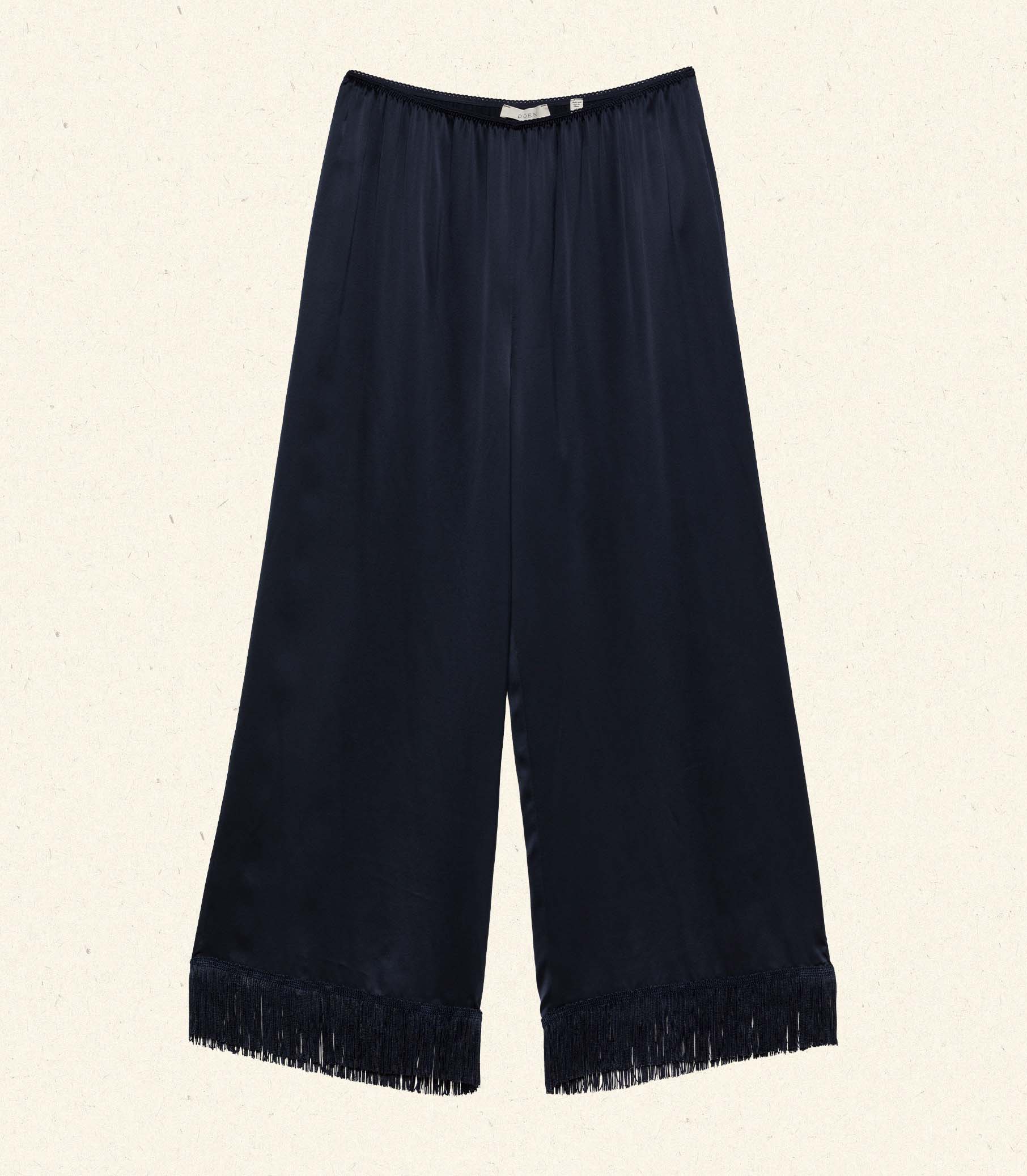 Crafted in a buttery silk satin and reimagined with fringe at the hem, the Lavon Pant is an effortless pull-on style with a wide leg and high waist.