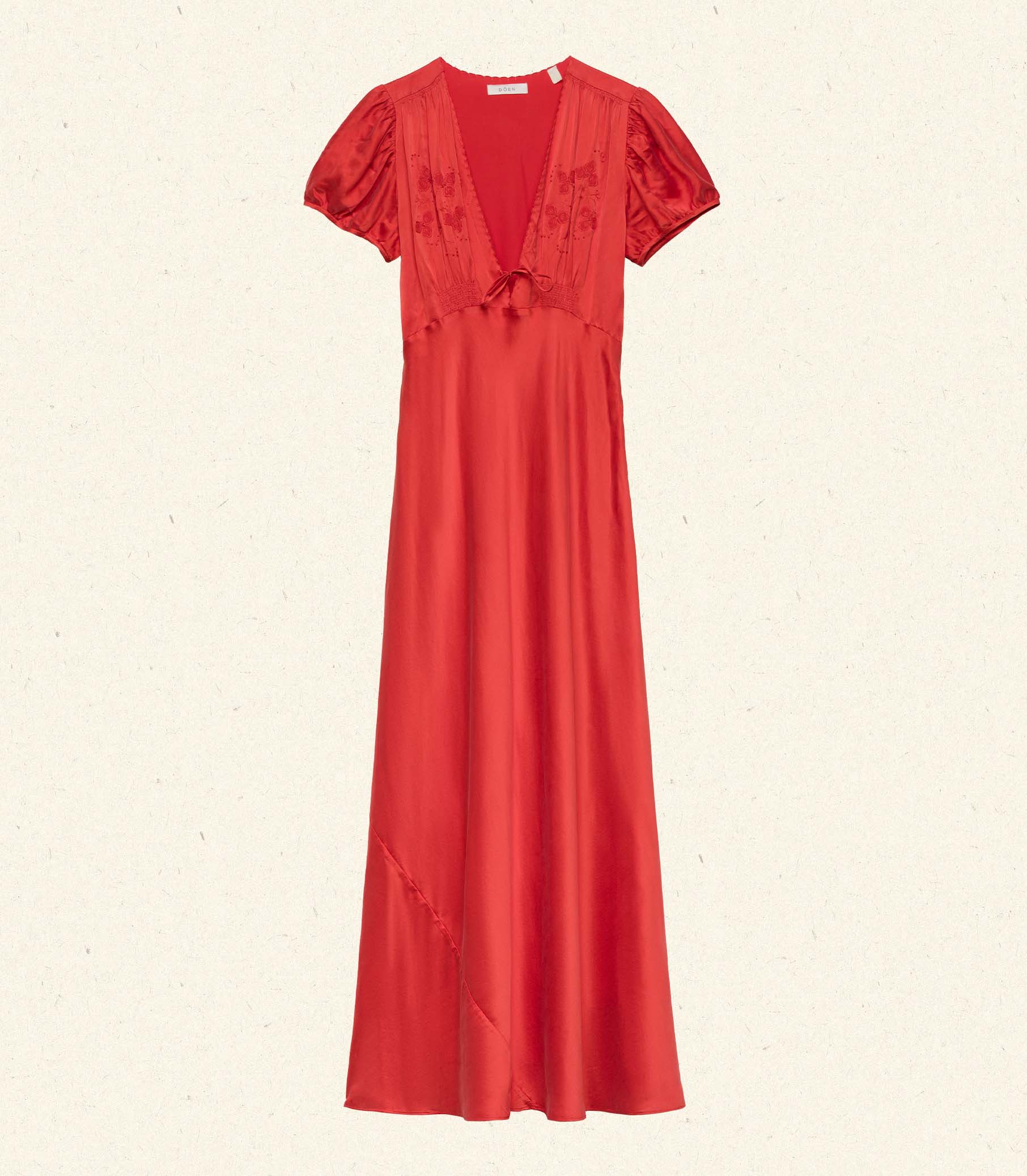 In sublime silk-satin, the ‘30s-inspired Léana Dress features intricate floral embroidery at the front bodice, short puffed sleeves edged in piping, a gathered bust, and plunging V-neckline with a keyhole tie detail. An empire waist with an invisible side-seam zipper offers a flattering silhouette, extending into an ankle-grazing bias-cut skirt.
