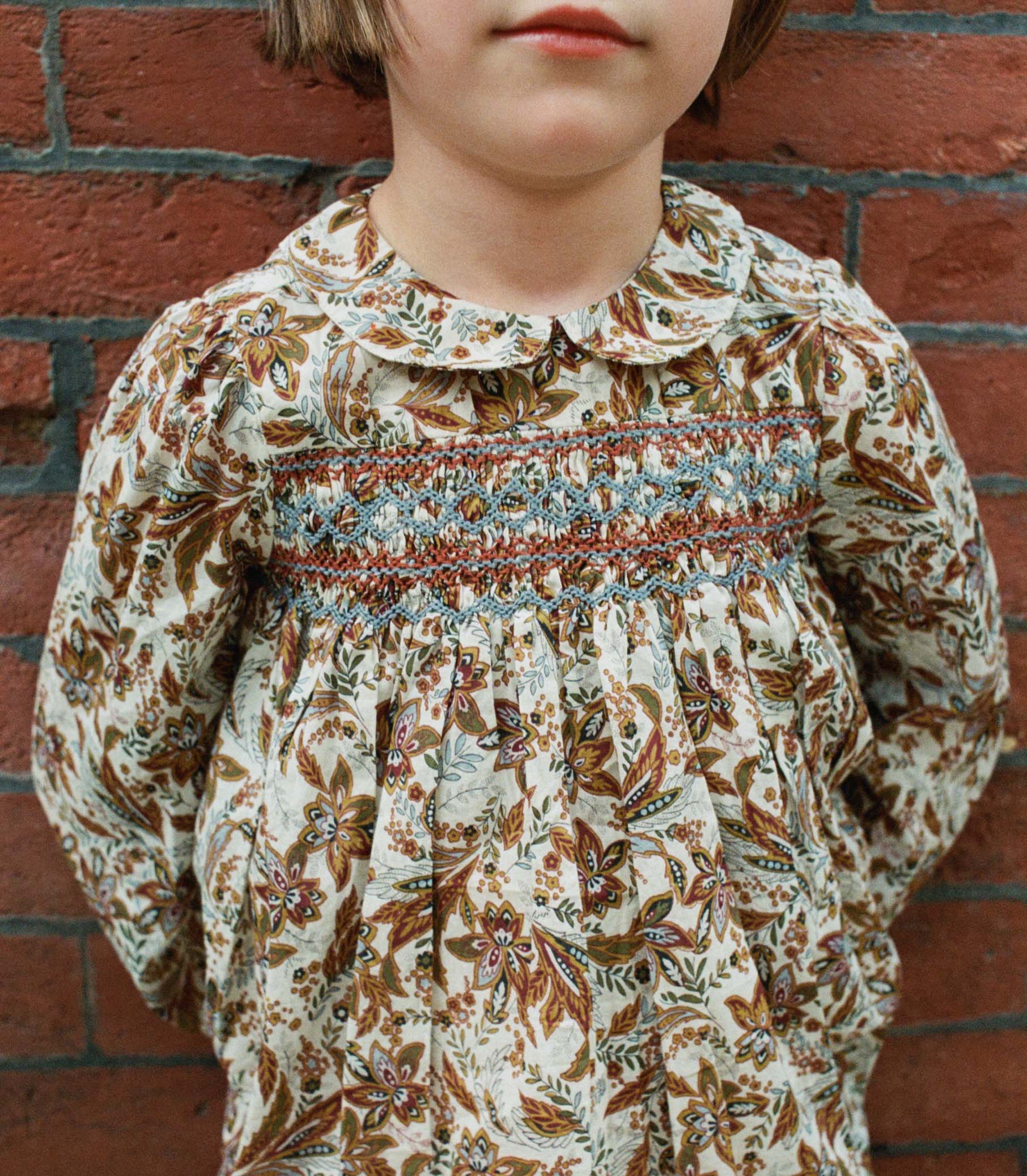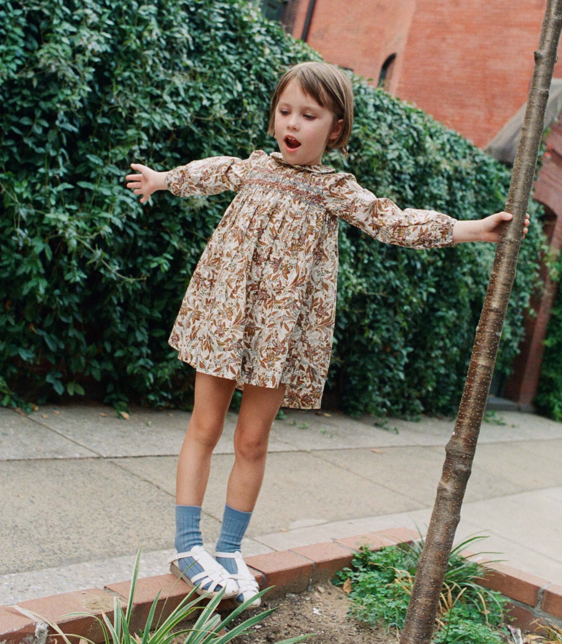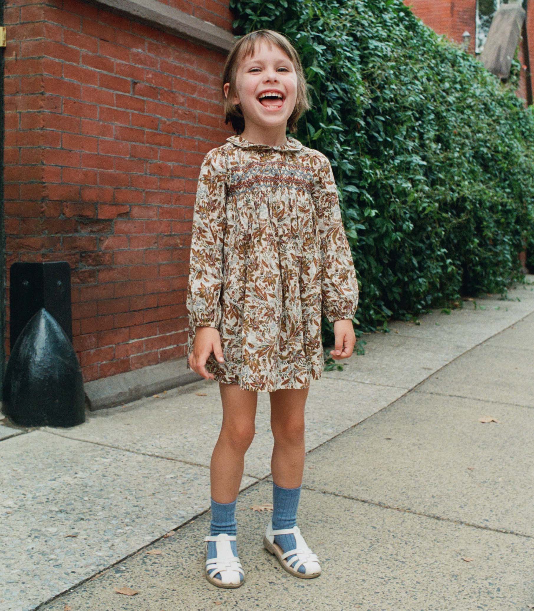 In midweight 100% organic cotton voile, the Letty Dress features a Peter Pan collar, full-length sleeves, and smocking at the bodice. A full skirt falls to just above the knee, while four buttons fasten at the back of the neck.