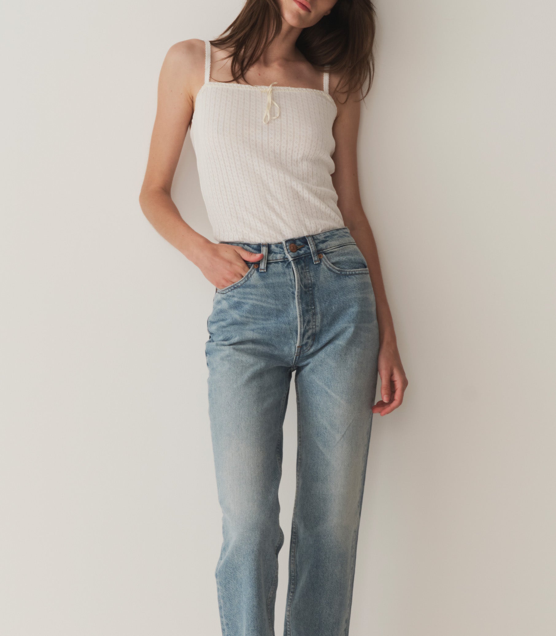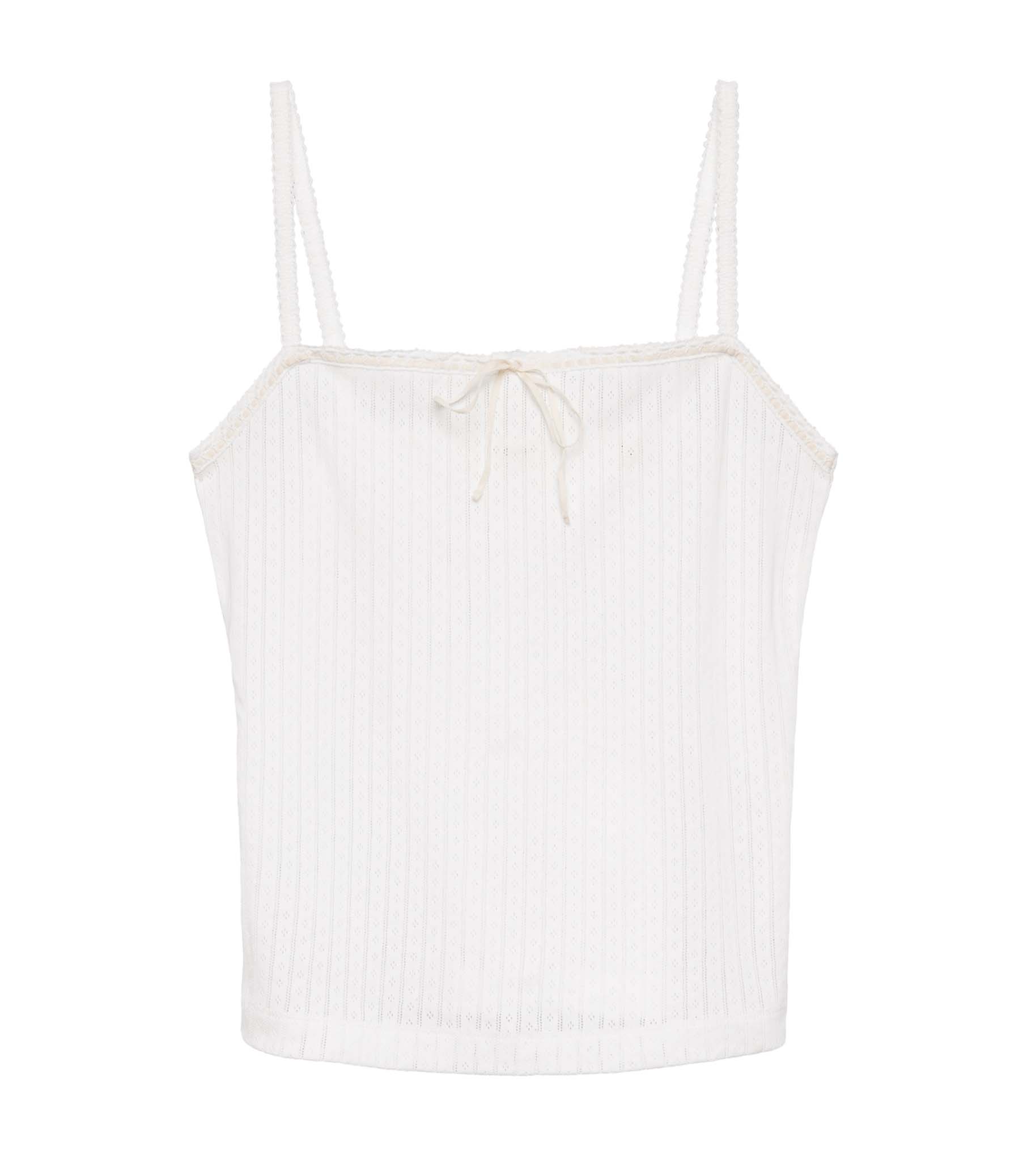 Crafted from soft 100% organic cotton pointelle, the ‘30s-inspired Ligea Tank features a fitted silhouette, ultra-skinny spaghetti straps, and a square neckline adorned with embroidered scallop crochet lace and a sweet ribbon detail.