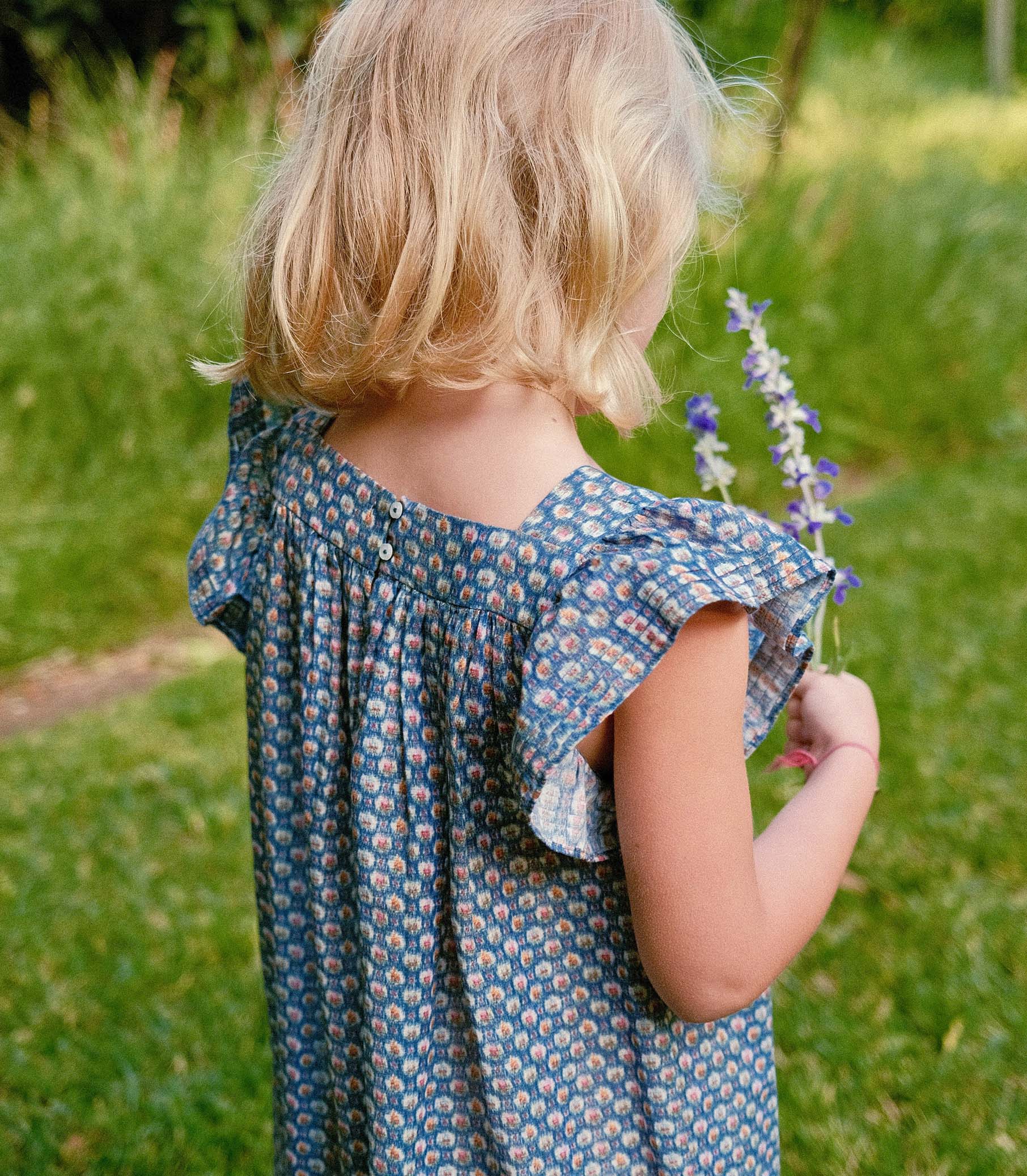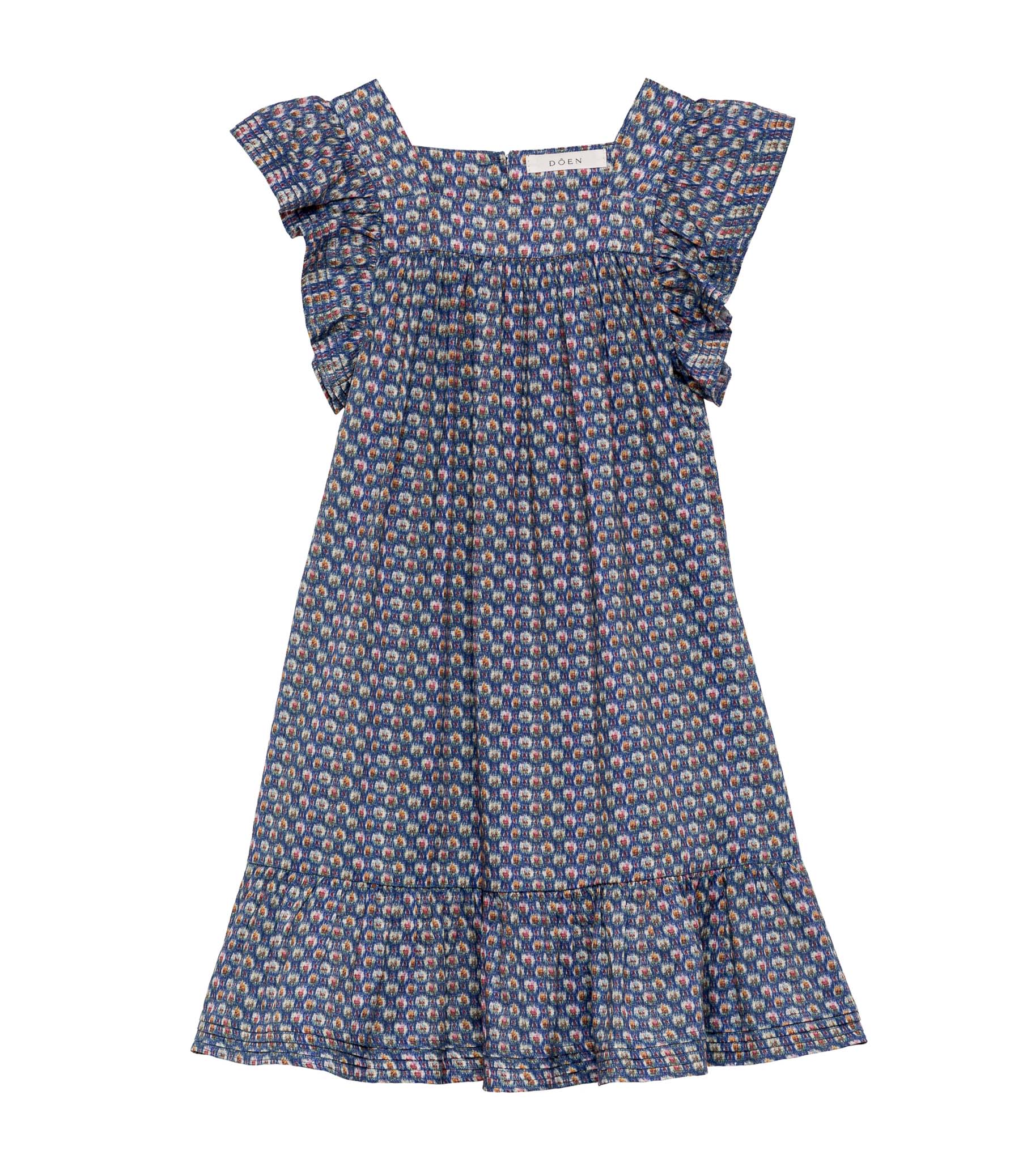 Rendered in a soft, lightweight cotton voile, the Lily Dress features a high square neckline, flutter sleeves, and a breezy silhouette that falls just below the knee. A ruffle at the hem is adorned with clustered pintucks, while two buttons fasten at the back.