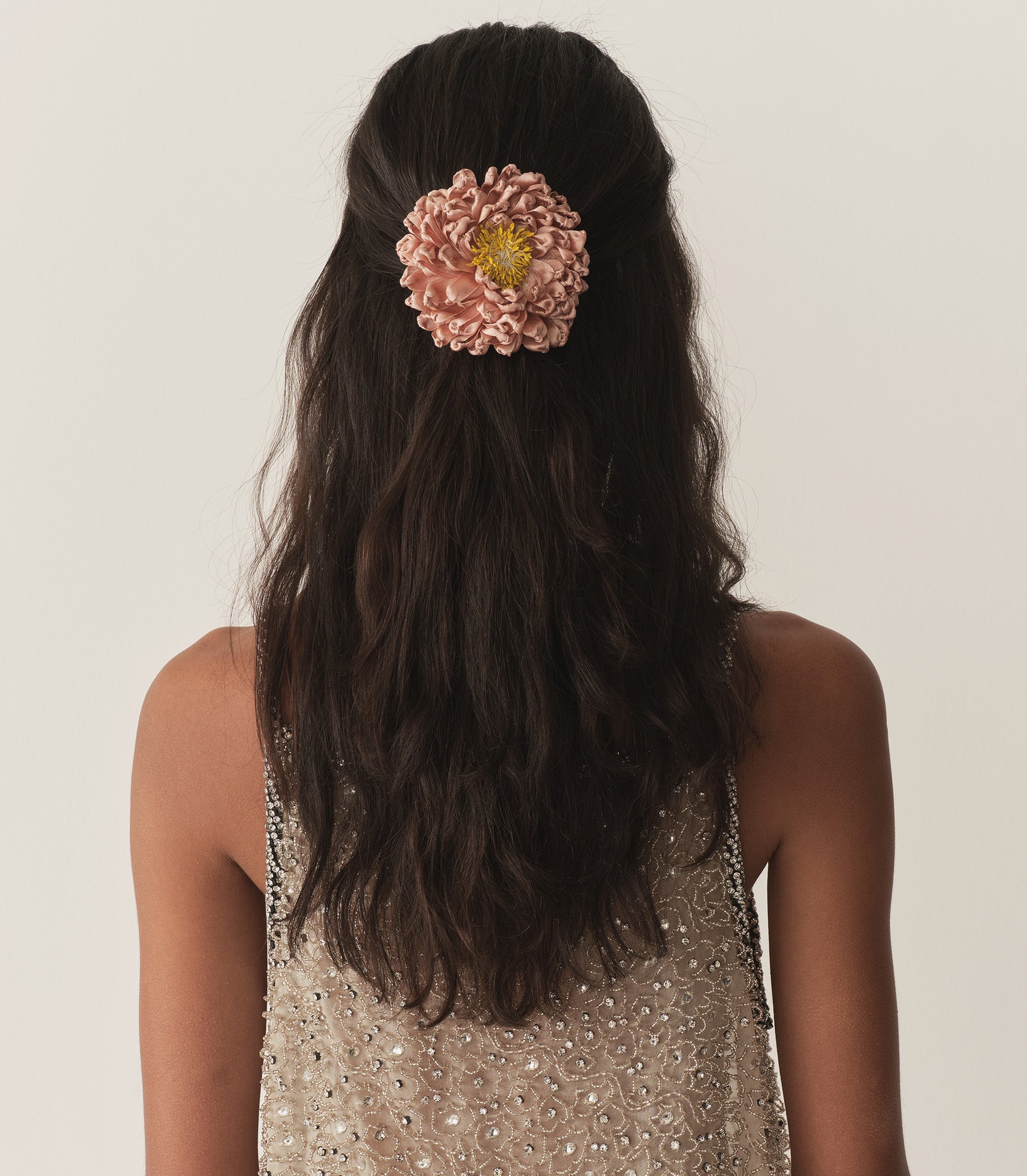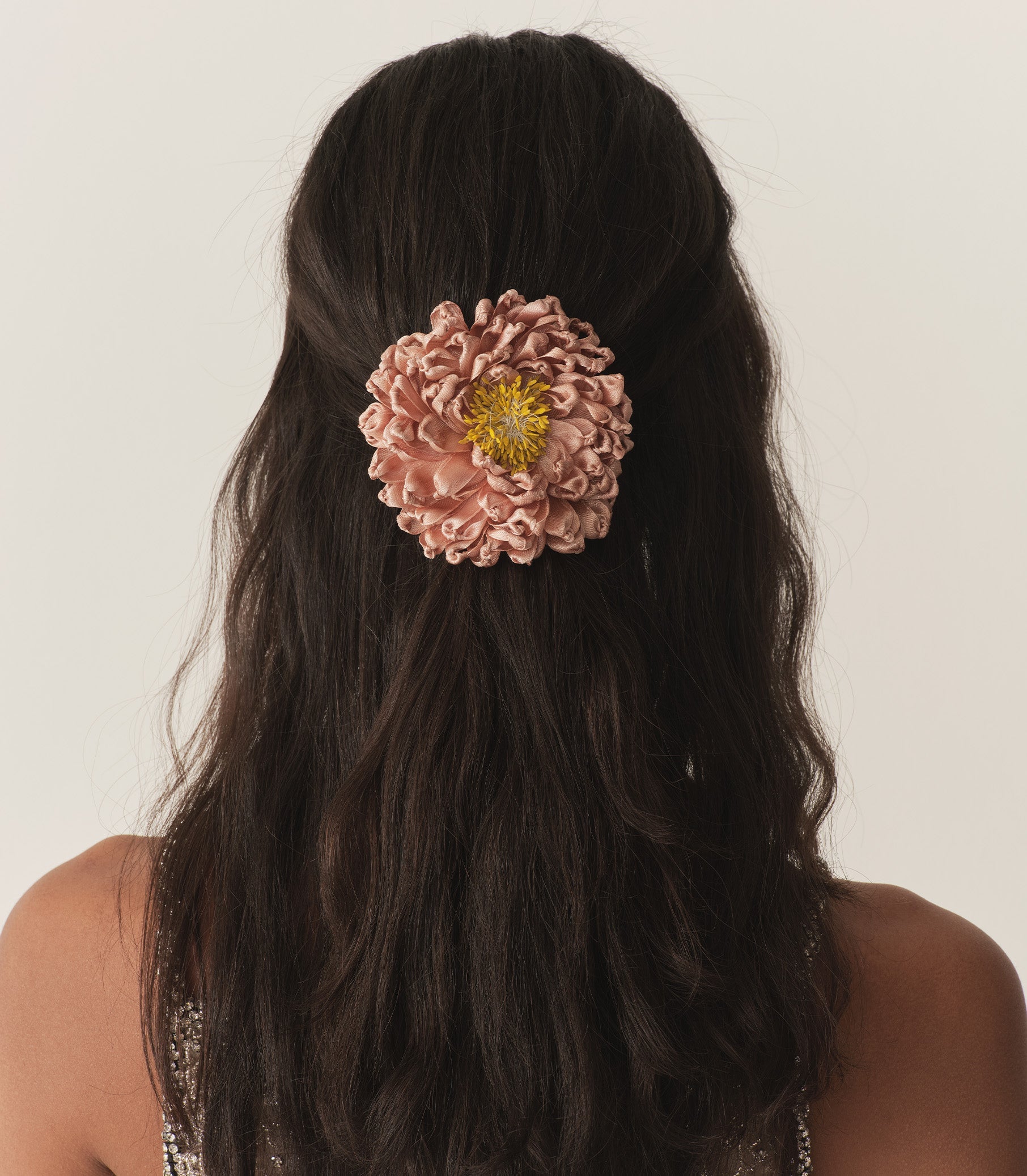 Crafted from a soft, apricot-hued silk-satin, the DÔEN Heirloom Lisabelle Barrette is a nostalgic, playful oversized hair clip with intricate, knotted petal details. Because each barrette is handmade by artisans in India, no two clips are exactly alike.