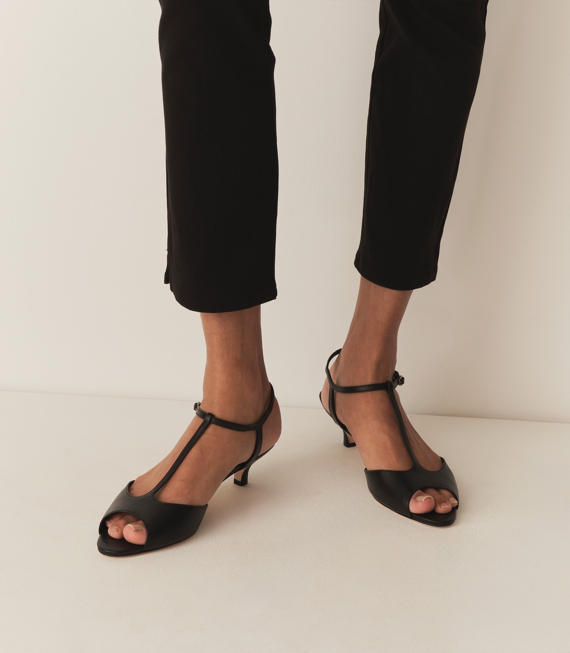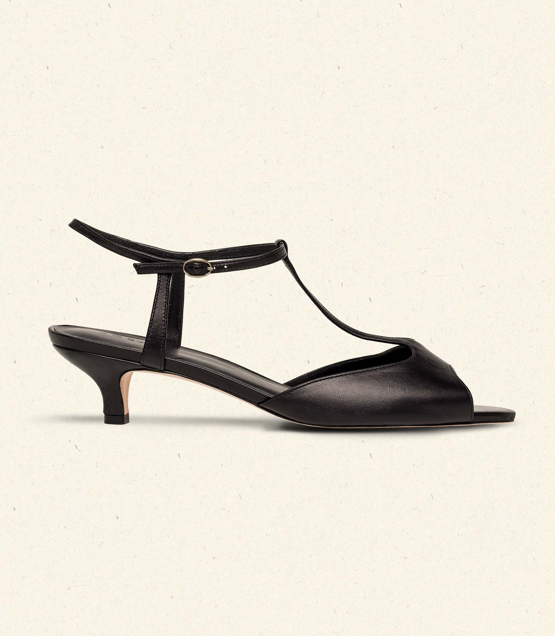 Handcrafted in Brazil from supple leather, the Maisie T-Strap Heel features a curved kitten heel, a soft leather lining, and a slender ankle strap that fastens with a petite brass buckle.