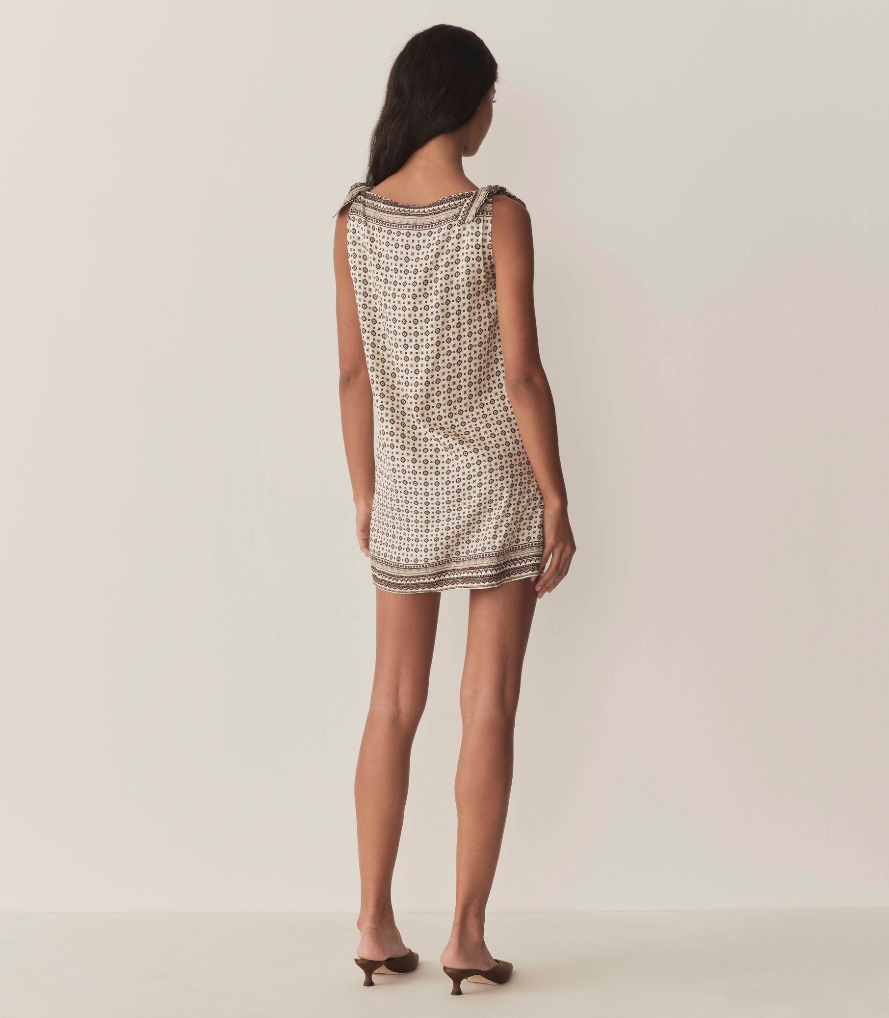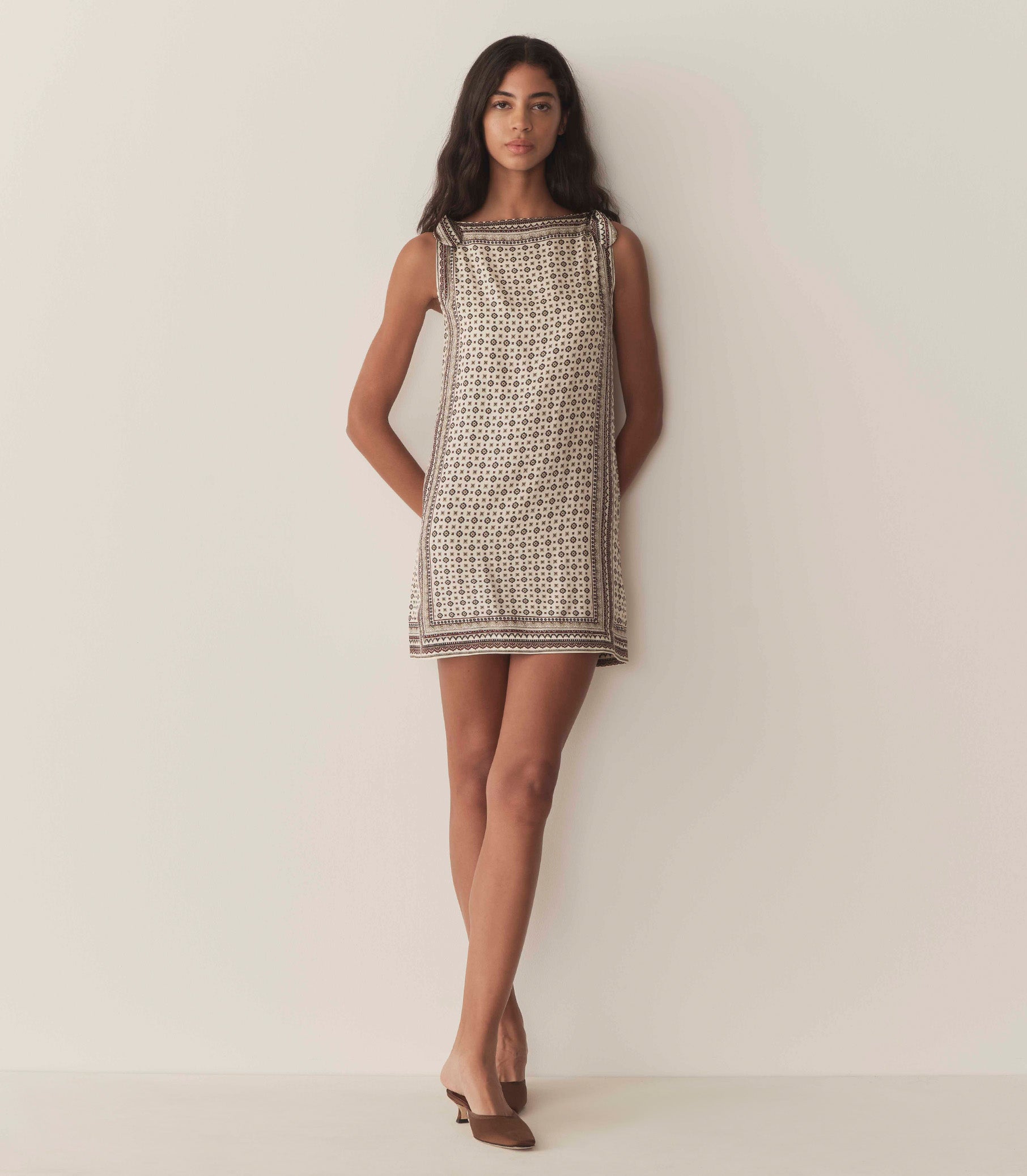 Crafted from a buttery silk-viscose blend and rendered in our nostalgic Montmartre Foulard print—which takes cues from vintage silk scarves—our fan-favorite Malia is a ‘60s-inspired sleeveless shift dress with a bateau neckline, an A-line silhouette, a playful mini hemline, and adjustable ties at the shoulders.