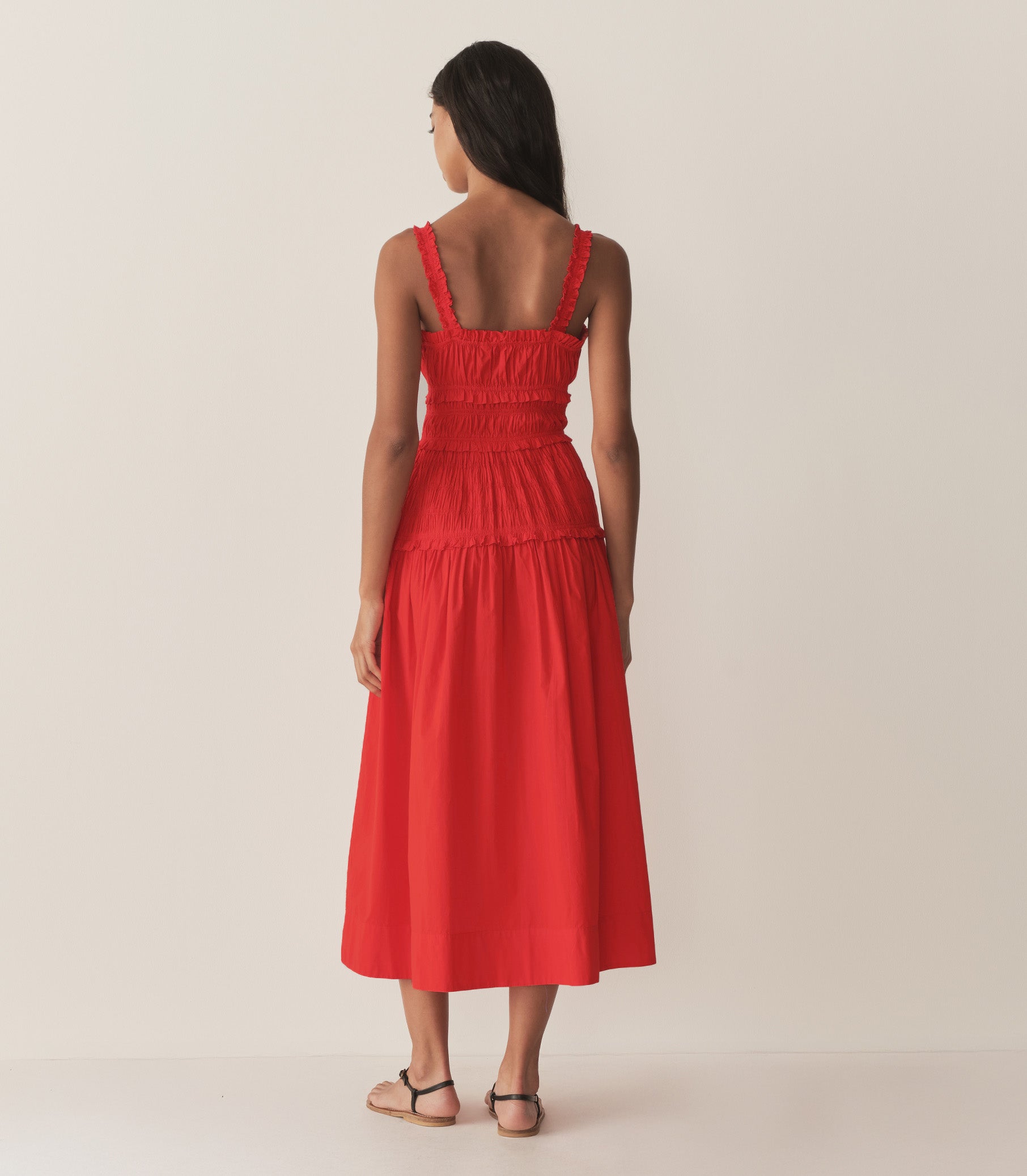 Crafted from crisp organic cotton poplin, the Marianne Dress features a square neckline, a gathered bust, and a fitted bodice framed with petite ruffles. A third gathered panel finishes just below the hips, flaring out into a full-length skirt, while elastic lends give to the straps, bust, and waist.