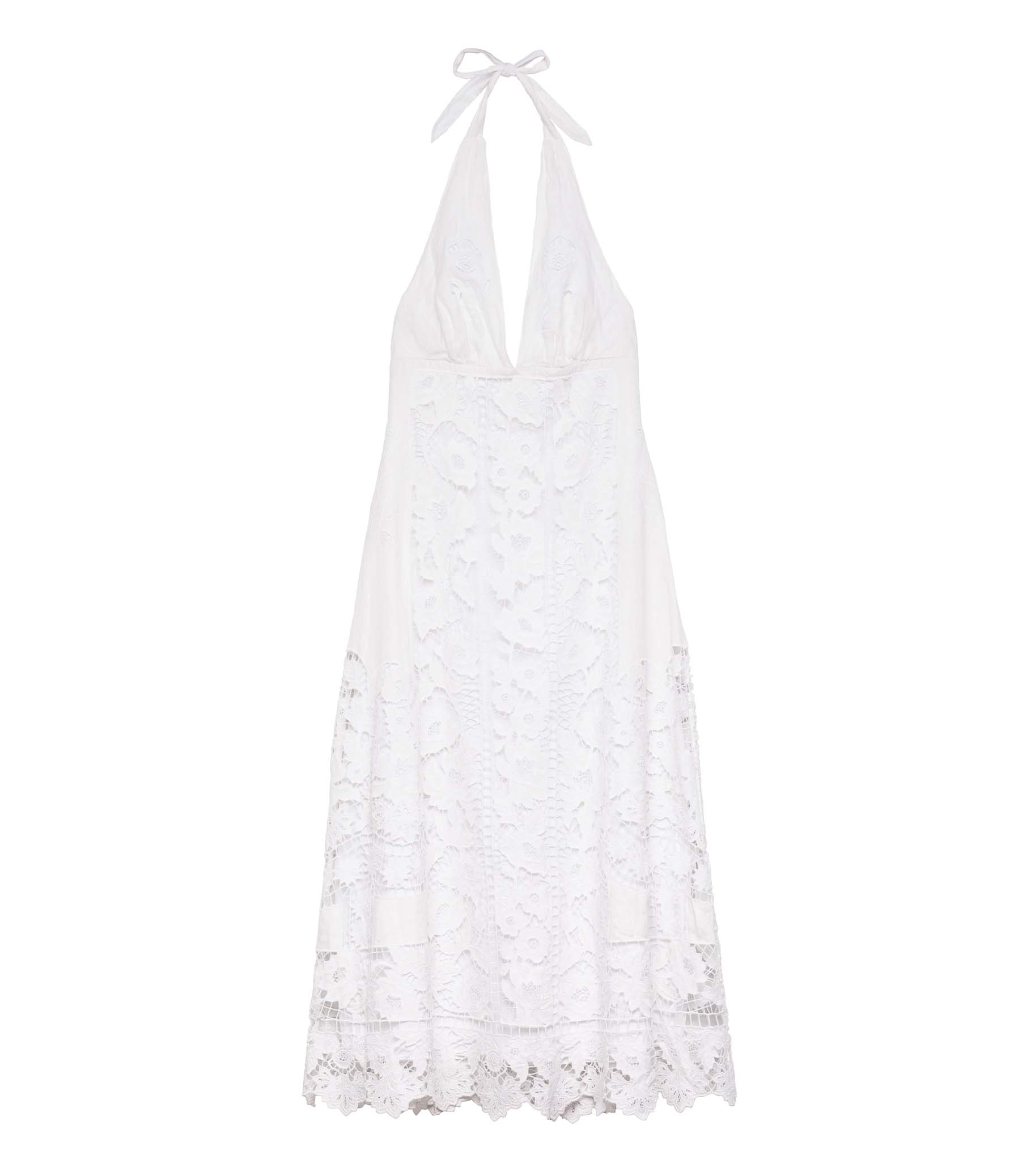Tailored in a soft midweight linen, the DÔEN Heirloom Mariza Dress features a plunging halter V-neckline and an intricate floral embroidery cutwork design. A fitted waist with an invisible side zipper and a hook-and-eye closure gives way to an ankle-grazing A-line skirt.