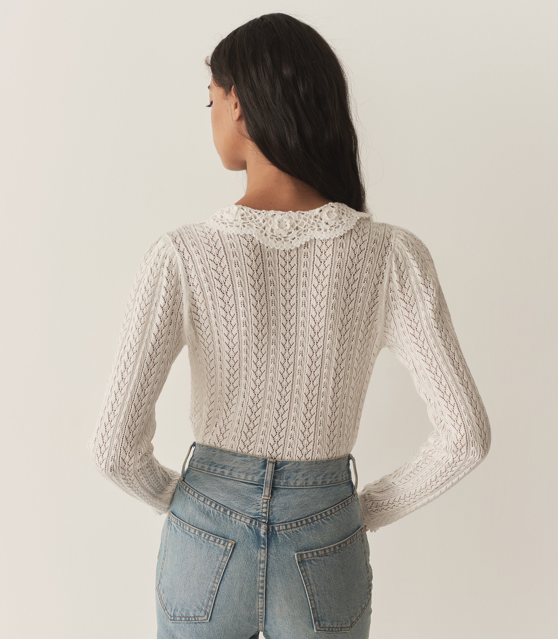 Rendered in 100% organic cotton pointelle, the Martina Cardigan features delicate crochet buttons and a Peter Pan collar adorned with hand-crocheted detailing. Fitted full-length sleeves are gathered at the shoulders for subtle volume. Scallop crochet detailing adorns the sleeve cuffs, center front placket, and slightly cropped hem.
