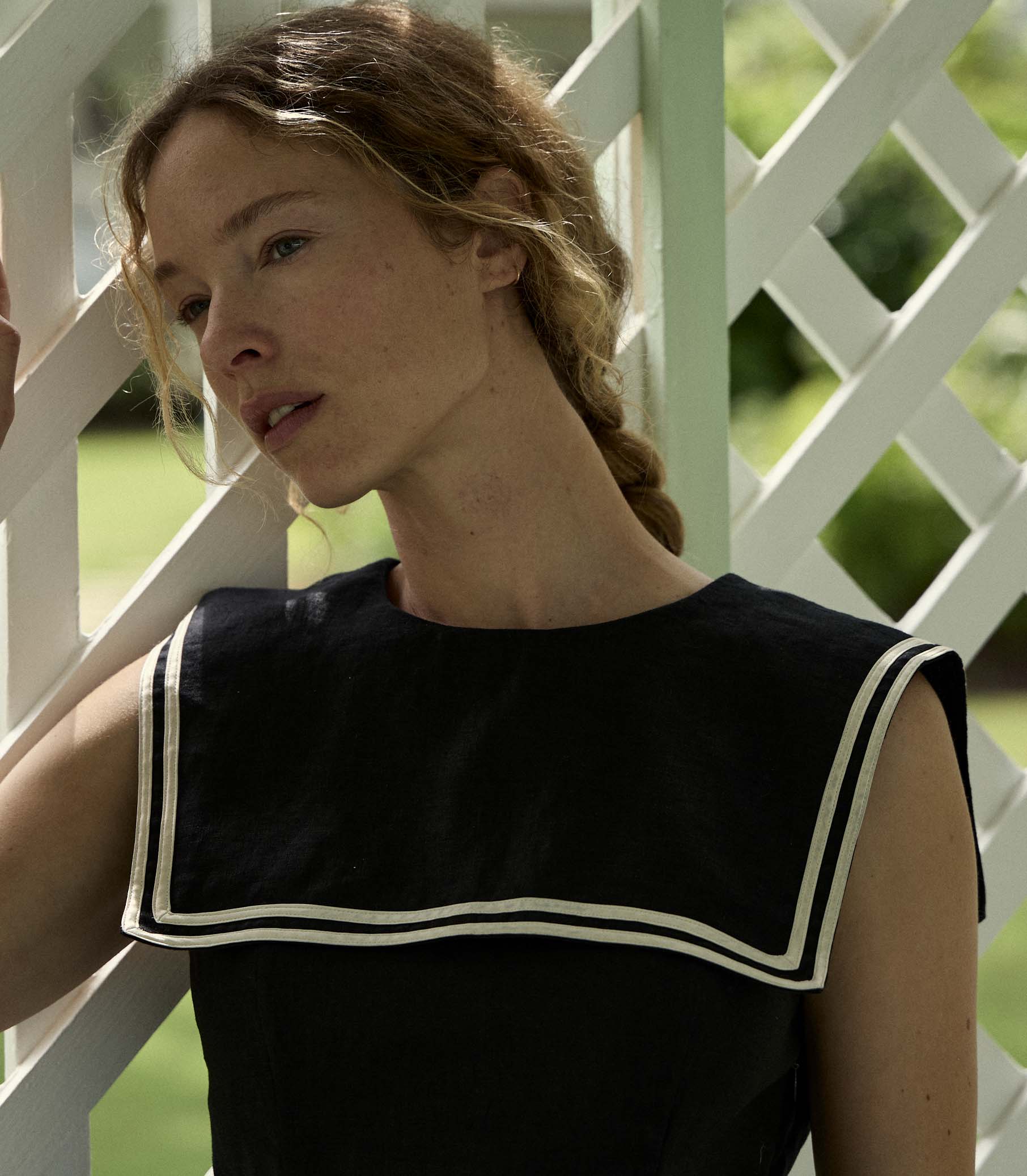 Tailored in a soft midweight linen, the Monroe Dress is a ‘60s-inspired mini-length shift dress. It features a body-skimming shift silhouette with an invisible side zipper and a wide square sailor-style collar trimmed with contrast satin piping. A single self-covered button with a keyhole detail fastens at the back of the neck.
