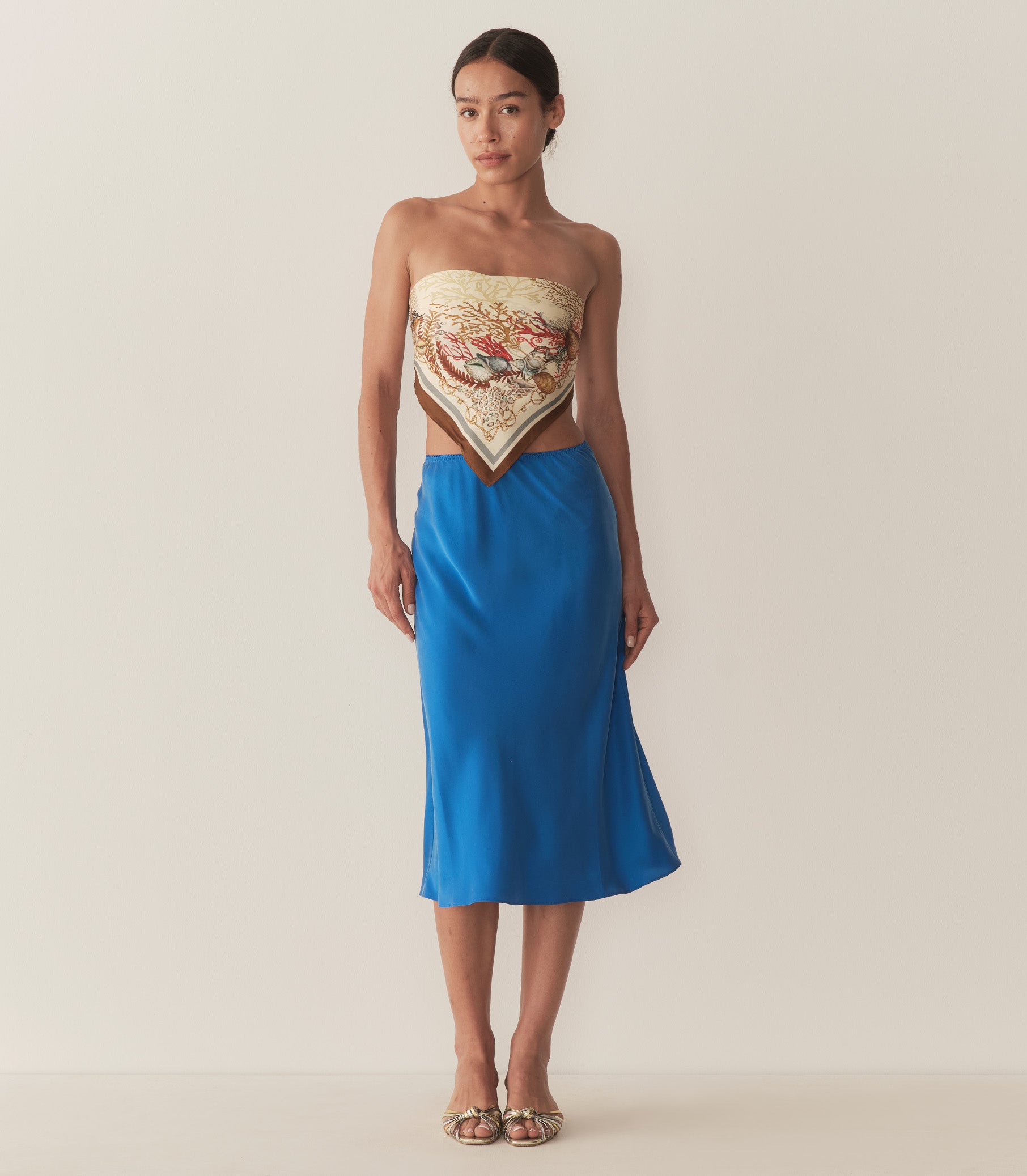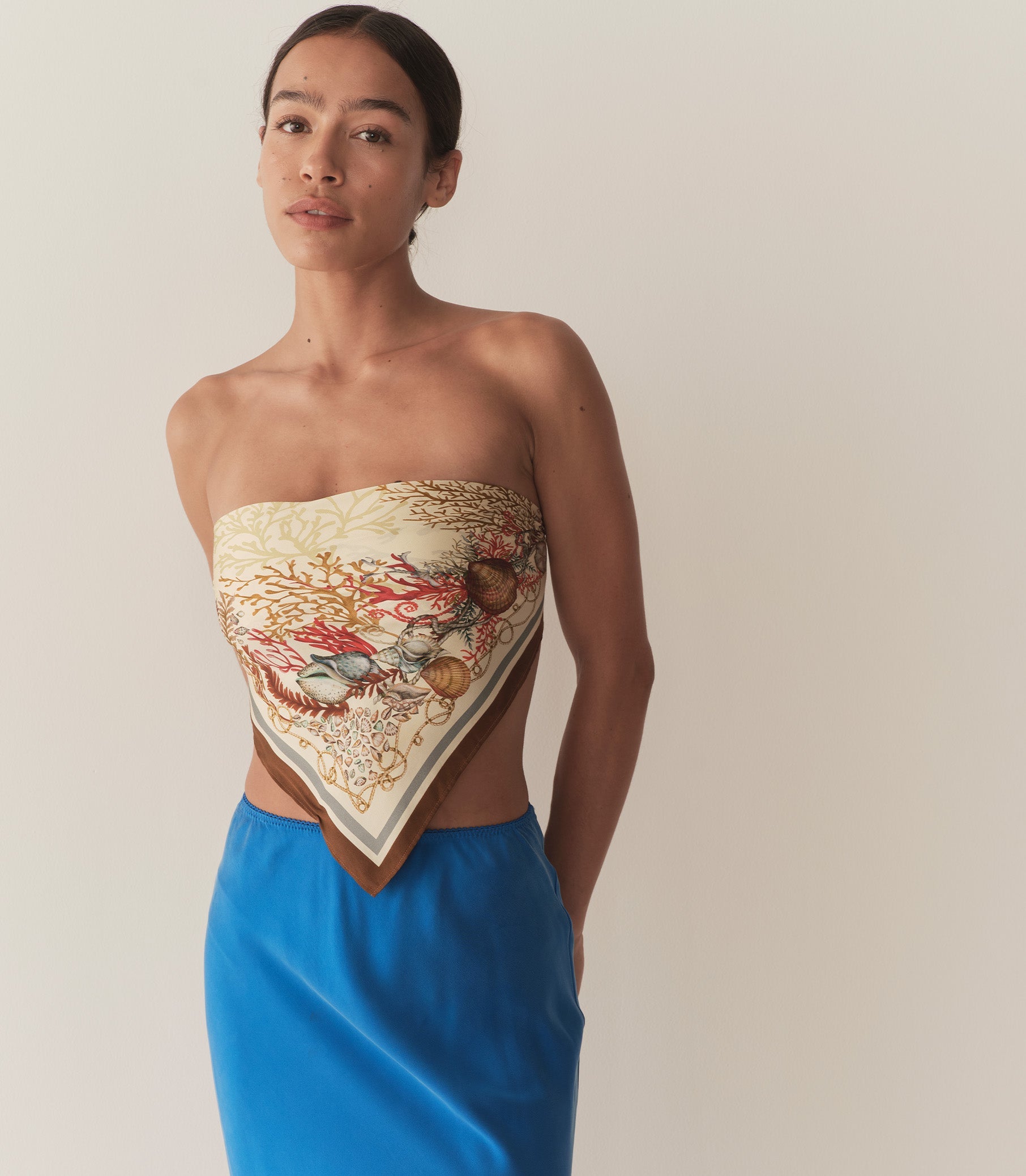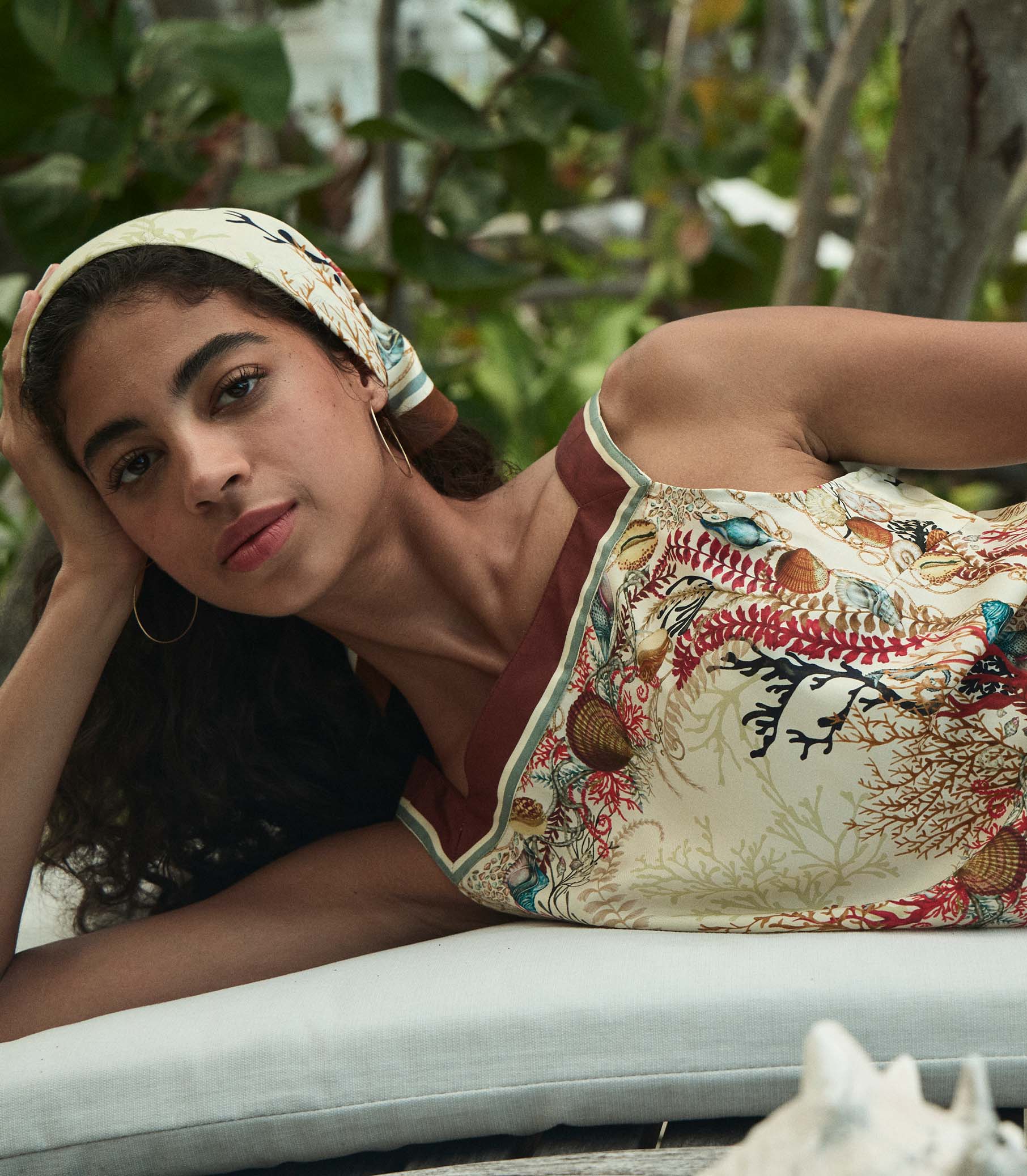 The DÔEN Heirloom Petit Penny Bandana is a silk-viscose twill rendition of the beloved styling staple. Rendered in our hand-drawn Coquillages des Biarritz—a delicate print with intertwining seashells, kelp, and coral—and framed by placed borders, it can be tied at the neck, worn as a headscarf, or knotted onto the handle of your favorite bag.